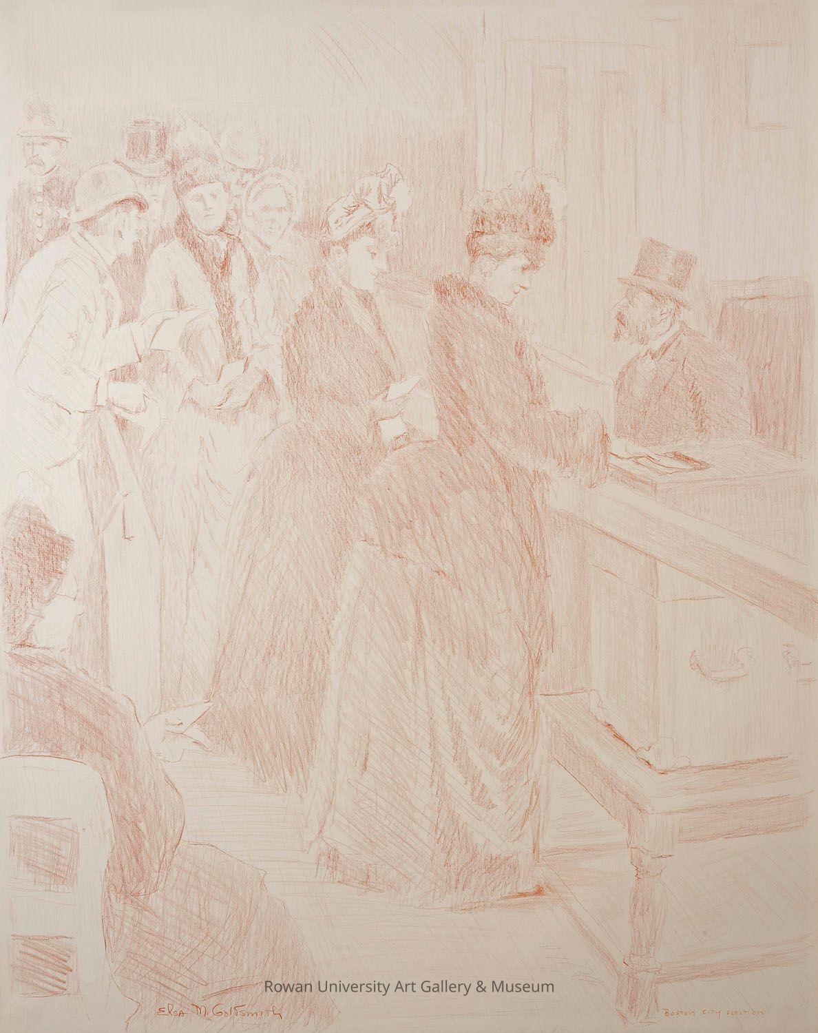 Elsa M. Goldsmith (1920–2005), Voting in Boston, from Women on the March Series, 1976–77, Conté crayon on paper, 29 x 23 in. Rowan University Museum of Contemporary Art, Gift of Cris and Jo Ann Goldsmith (2021.66.3). Photo: Karen Mauch Photography.