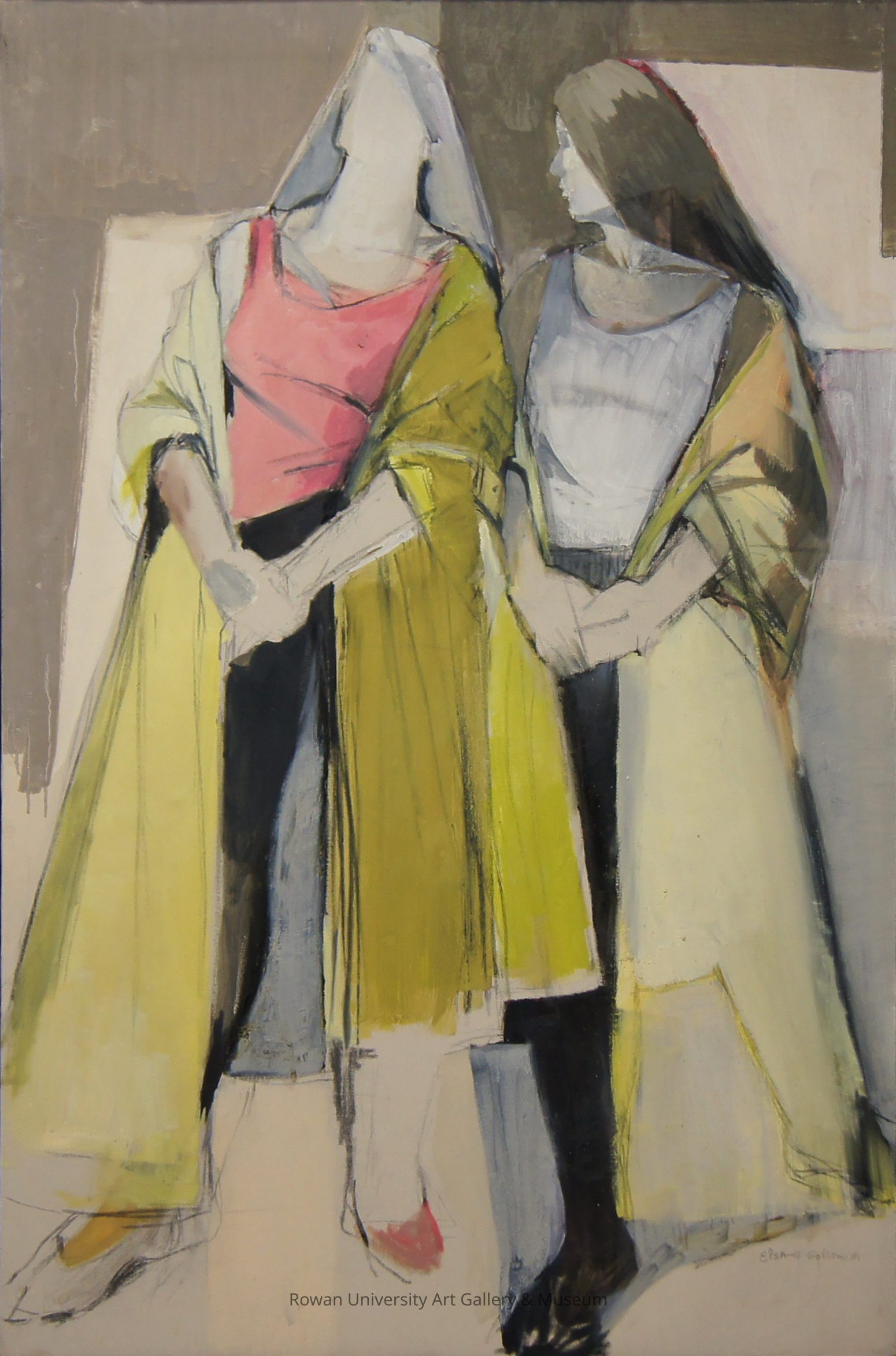 Full-length views of two loosely rendered women set against an interior background, mainly composed of lines and shapes in off-white, brown, and gray; on the left, the figure's face is undefined and her hair is articulated as a roughly triangular ray mass, while her hands are clasped in front of her waist and she wears in a pink sleeveless shirt, black pants, a long yellow robe, and loosely defined shoes; on the right, the woman's loosely rendered face and brown hair are shown in profile, while her body is frontal; she also clasps her hands in front of her waist but wears a white sleeveless shirt, black pants, and a long yellow robeType of Painting