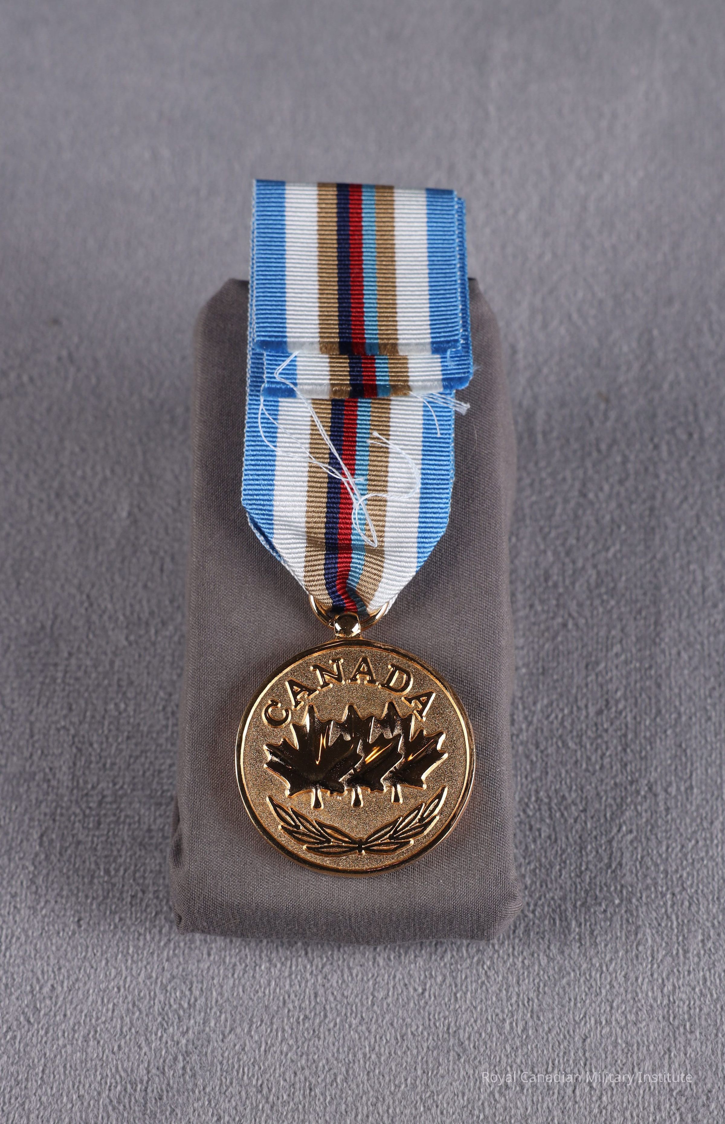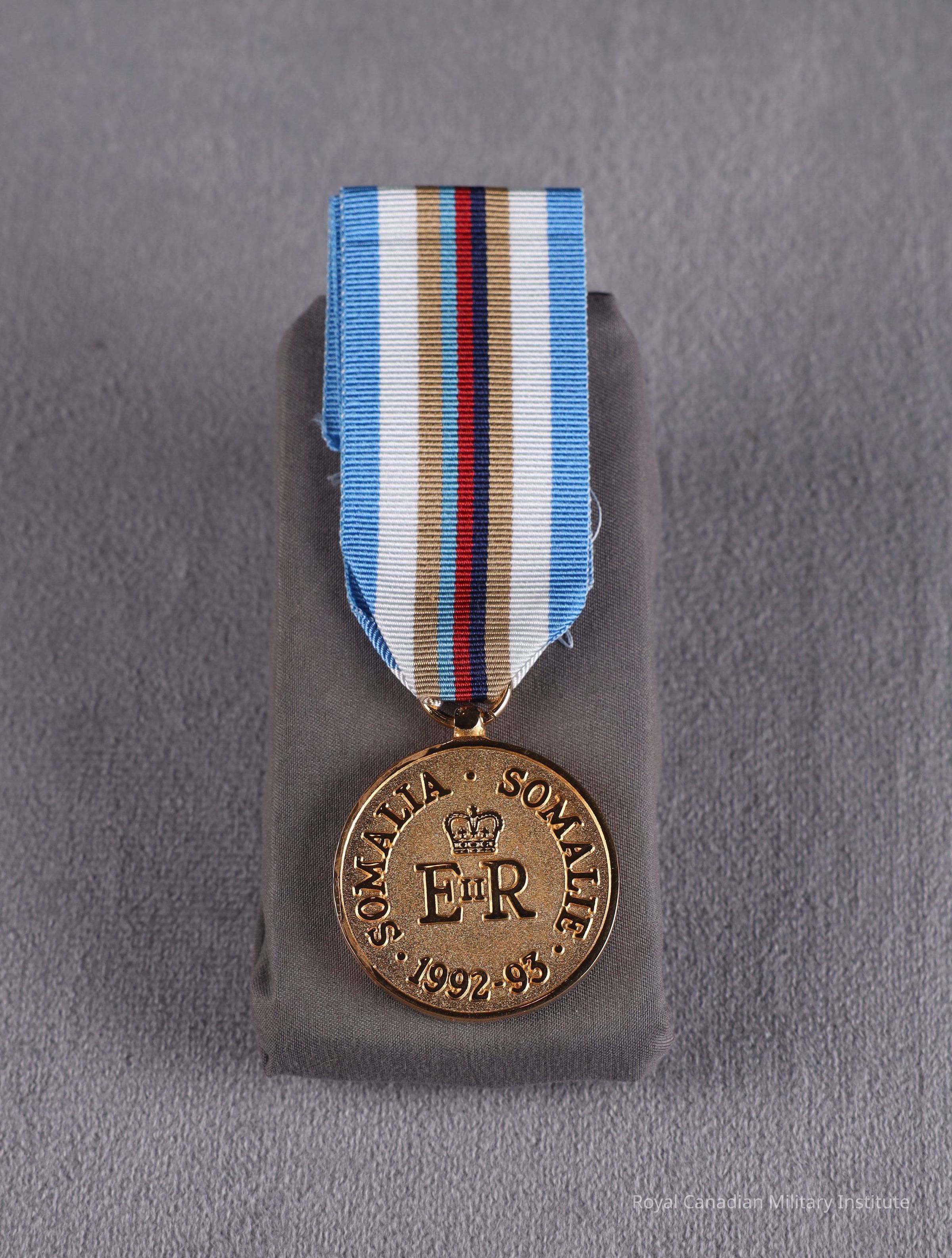 1992 Somalia Medal. Circular, gold-coloured alloy. Obverse shows title "Canada" above three maple leaves, with laurel leaves at bottom. Reverse shows Royal crown and cypher surrounded by title "Somalia. Somalie. 1992-93." Fixed ring at top, with loose ring. Ribbon is light blue, white, sand, dark blue, red, light blue, sand, white, light blue. Ribbon is 3.5 x 7 cm.Made/Created