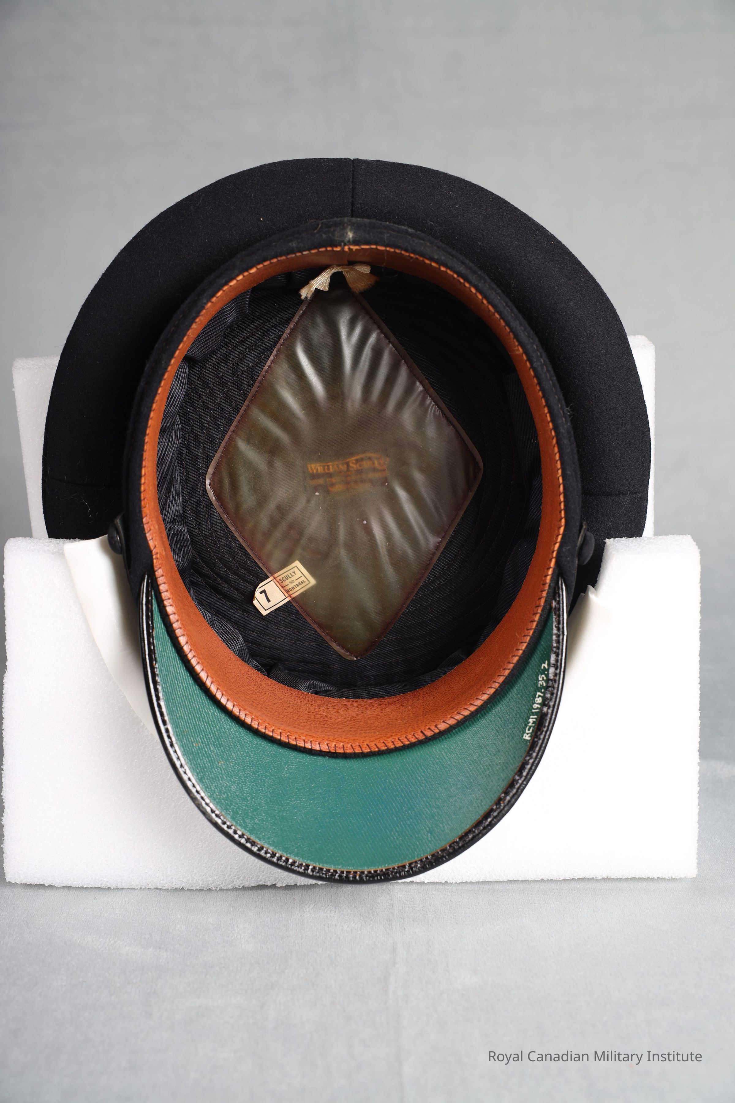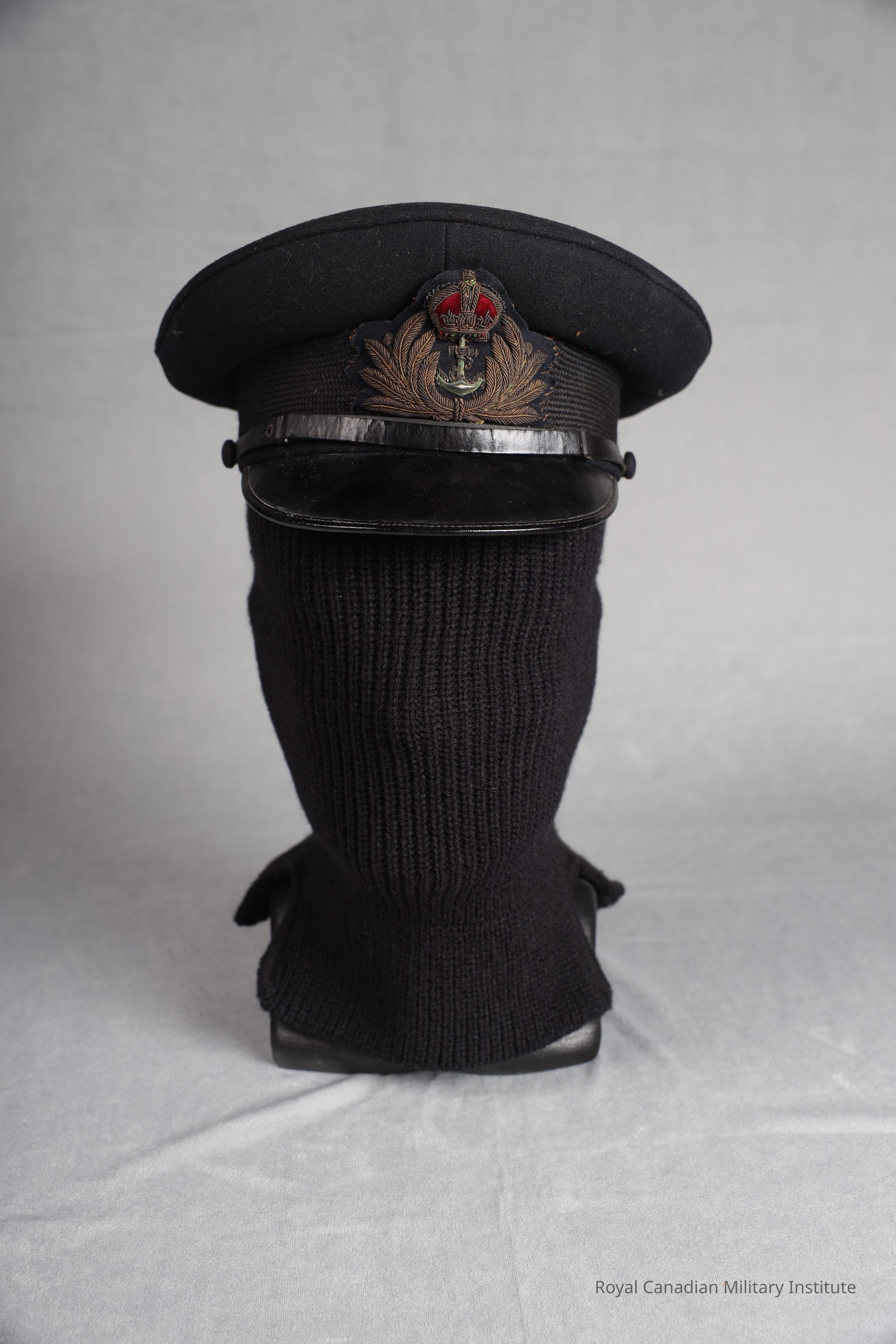 1940-1945 Royal Canadian Navy officer's service dress cap. Blue-black wool crown/body. Black mohair cap band. Black leather cap cord 1.3 cms. wide x 31.5 cms. long with two black cloth-covered brass buttons 1.3 cm. diameter. Two-piece black leather peak. Crown liner of blue-black sateen and clear plastic. Sewn to black mohair cap band is Royal Canadian navy officer's cap badge: King's crown atop gold bullion wire laurel leaf wreath and white metal fouled anchor.Made/Created
