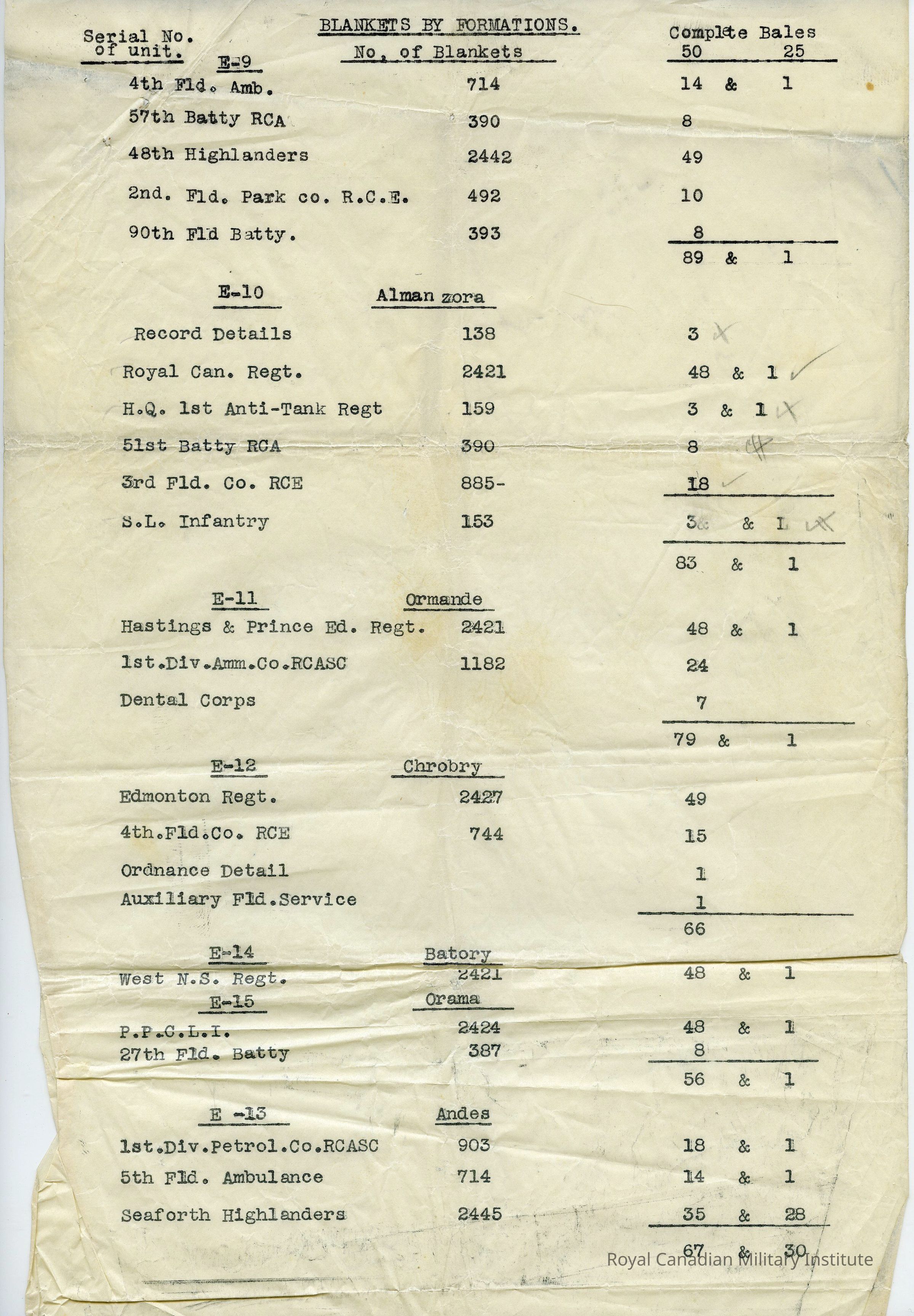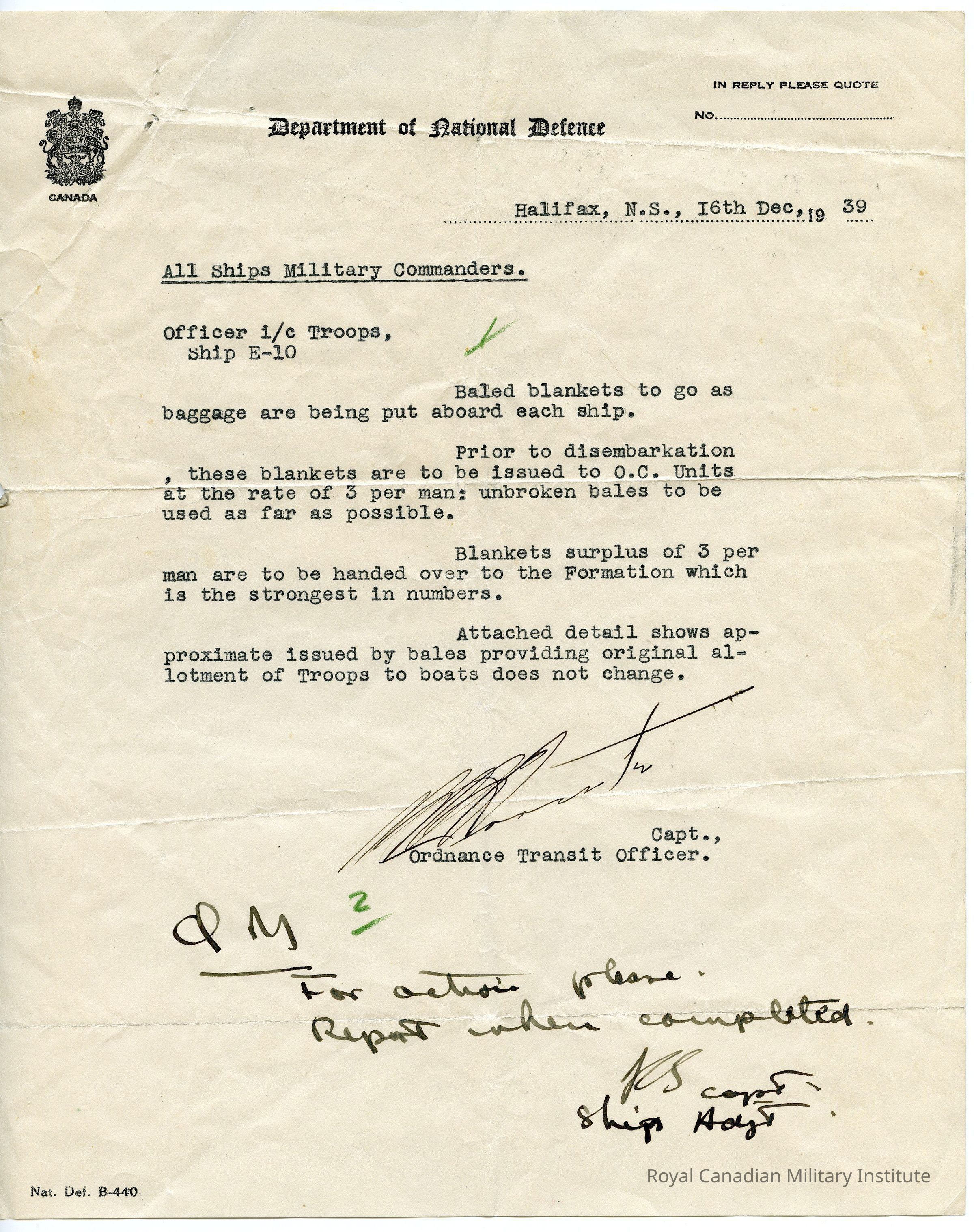 Department of National Defence transit order. This instruction, issued from Halifax on December 16, 1939, was sent to all ships military commanders. It is addressed to "Officer i/c Troops, Ship E-10". The letter details instructions related to the distribution of blankets to troops. Attached to the instruction are details of the ships, the formations they carry, how many blankets and bales they have.