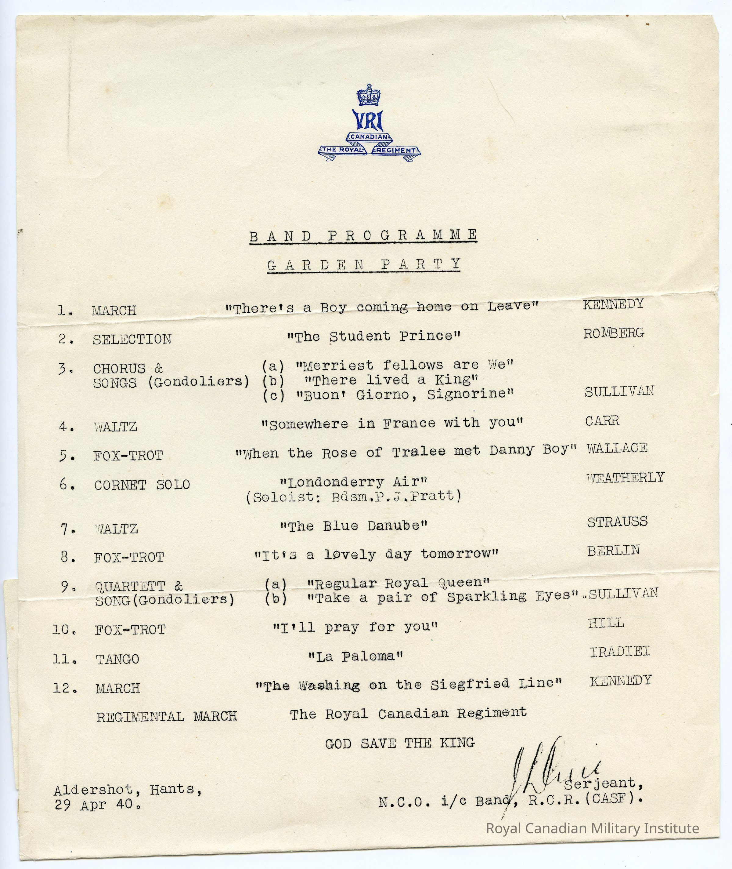 Royal Canadian Regiment Band programme from April, 1940. The concert may have been performed at Aldershot or Hants (?). The programme contains 14 pieces, including the Royal Canadian Regimental march and God Save the King. The programme is printed on letterhead from the Royal Canadian Regiment. The insignia is the letters 'VRI' topped by a crown.Made/Created