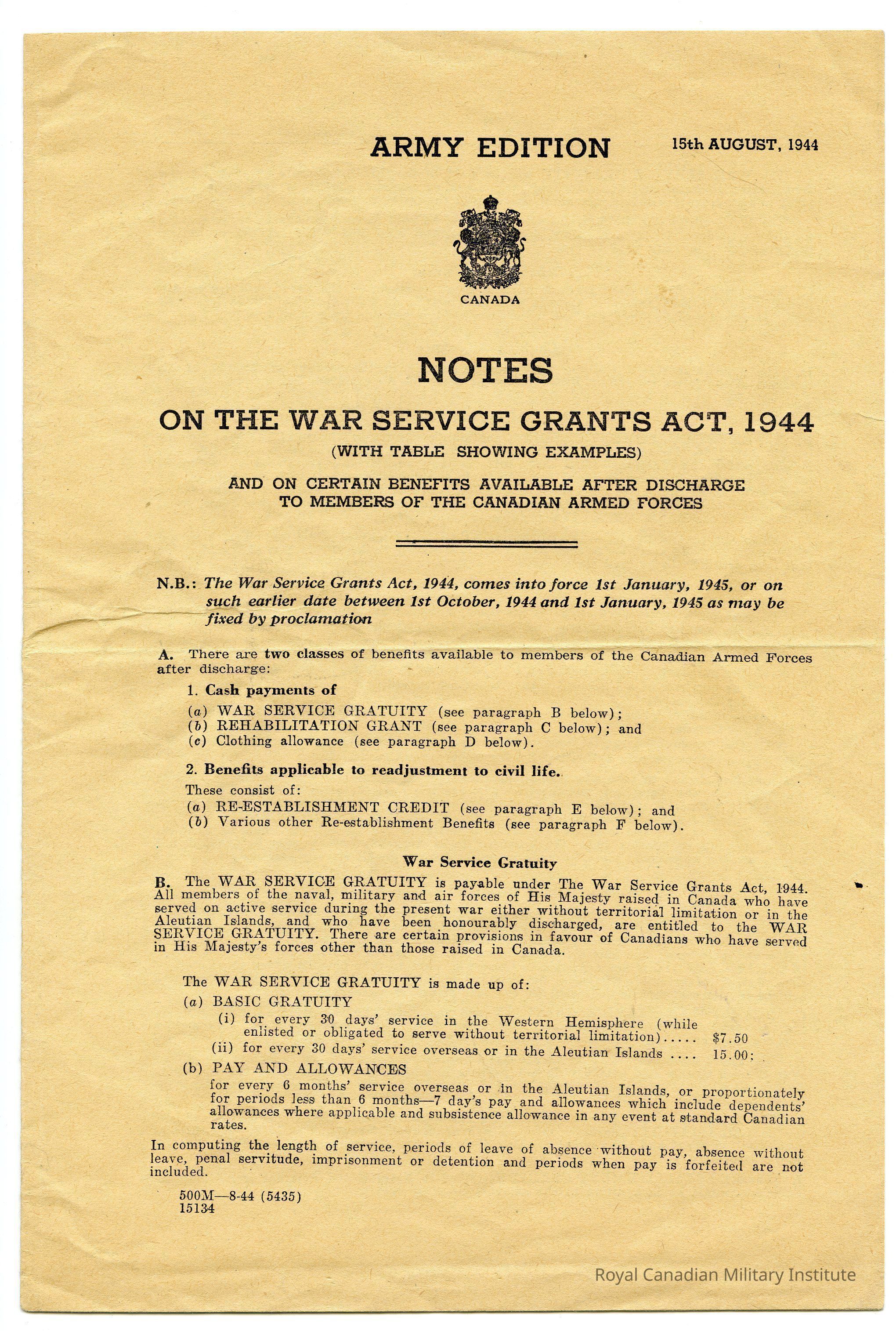 1944 Canadian Army War Service Grants pamphlet. This is the Army edition of a pamphlet explaining the War Service Grants Act of 1944. The pamphlet explains the benefits that will be available to servicemen after discharge. The pamphlet was published on August 15, 1944.