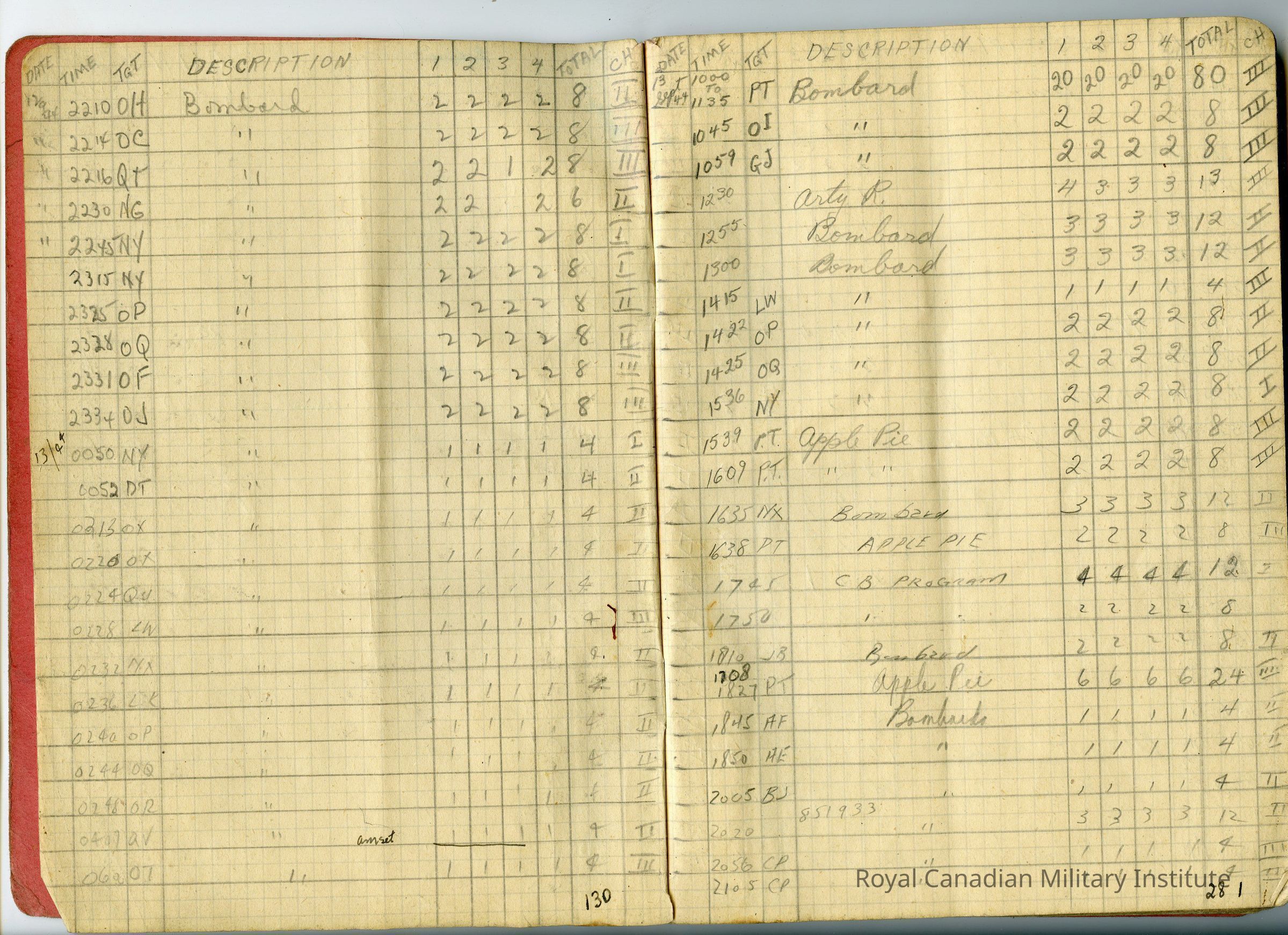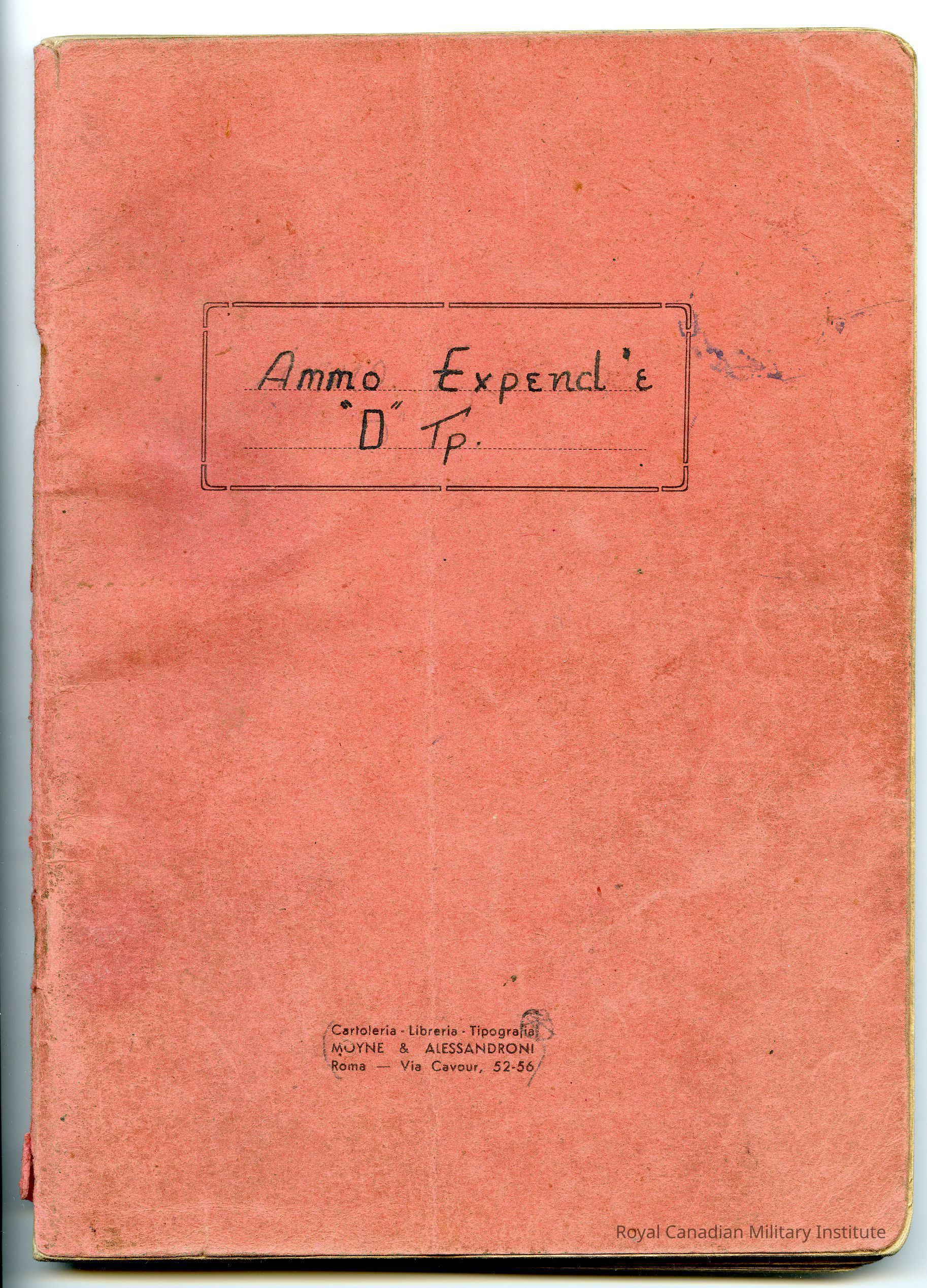 Royal Canadian Artillery ("D" Troop Second Medium Regiment) Officer's Notebook. The notebook records the date, target, description, gun number (1 to 4) and total rounds used. The last entry is from April 25, 1945. The notebook is square lined with a red (now faded to pink) cover. The cover says "Ammo Expend "D" Tp." The notebook appears to have been printed in Rome.Made/Created