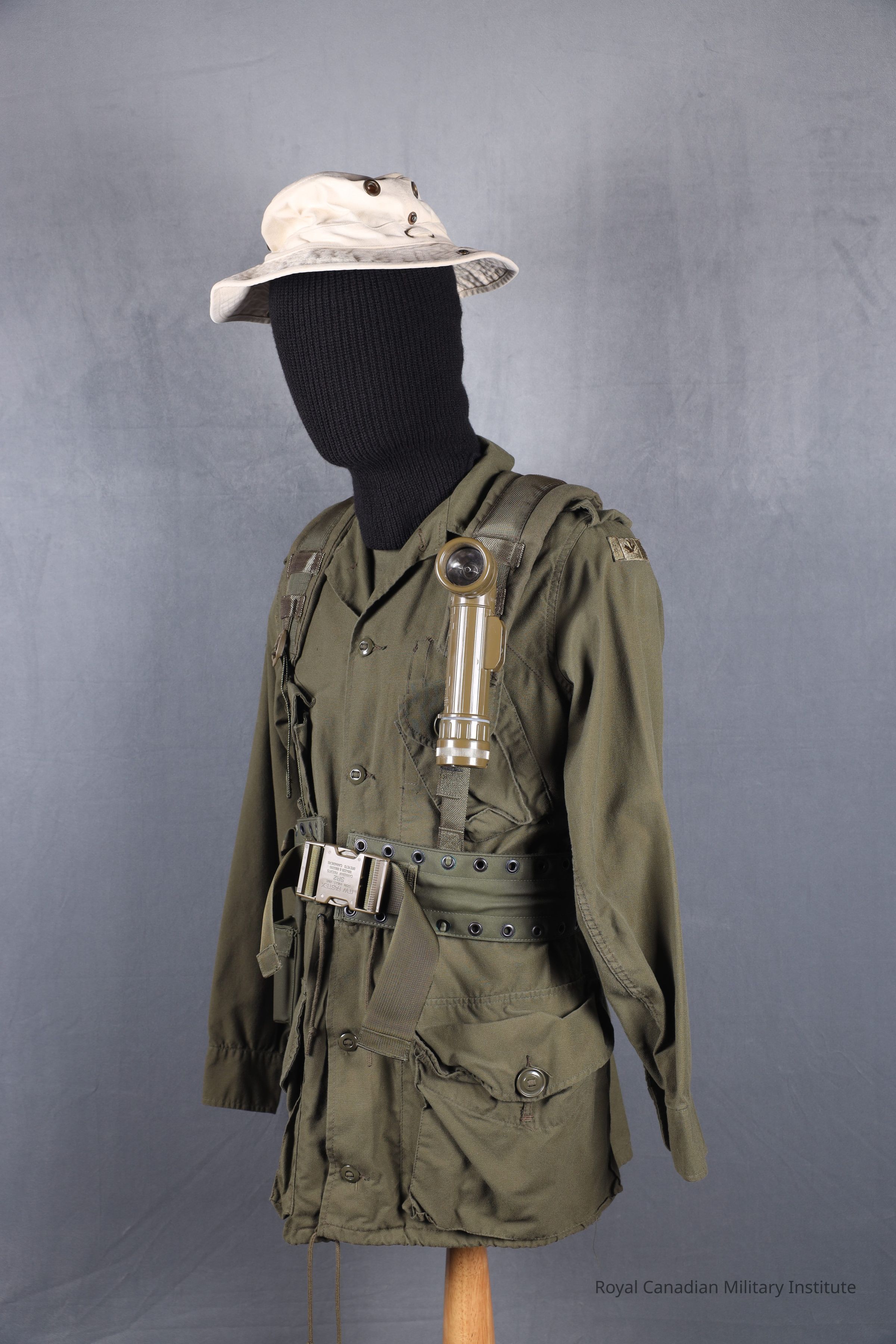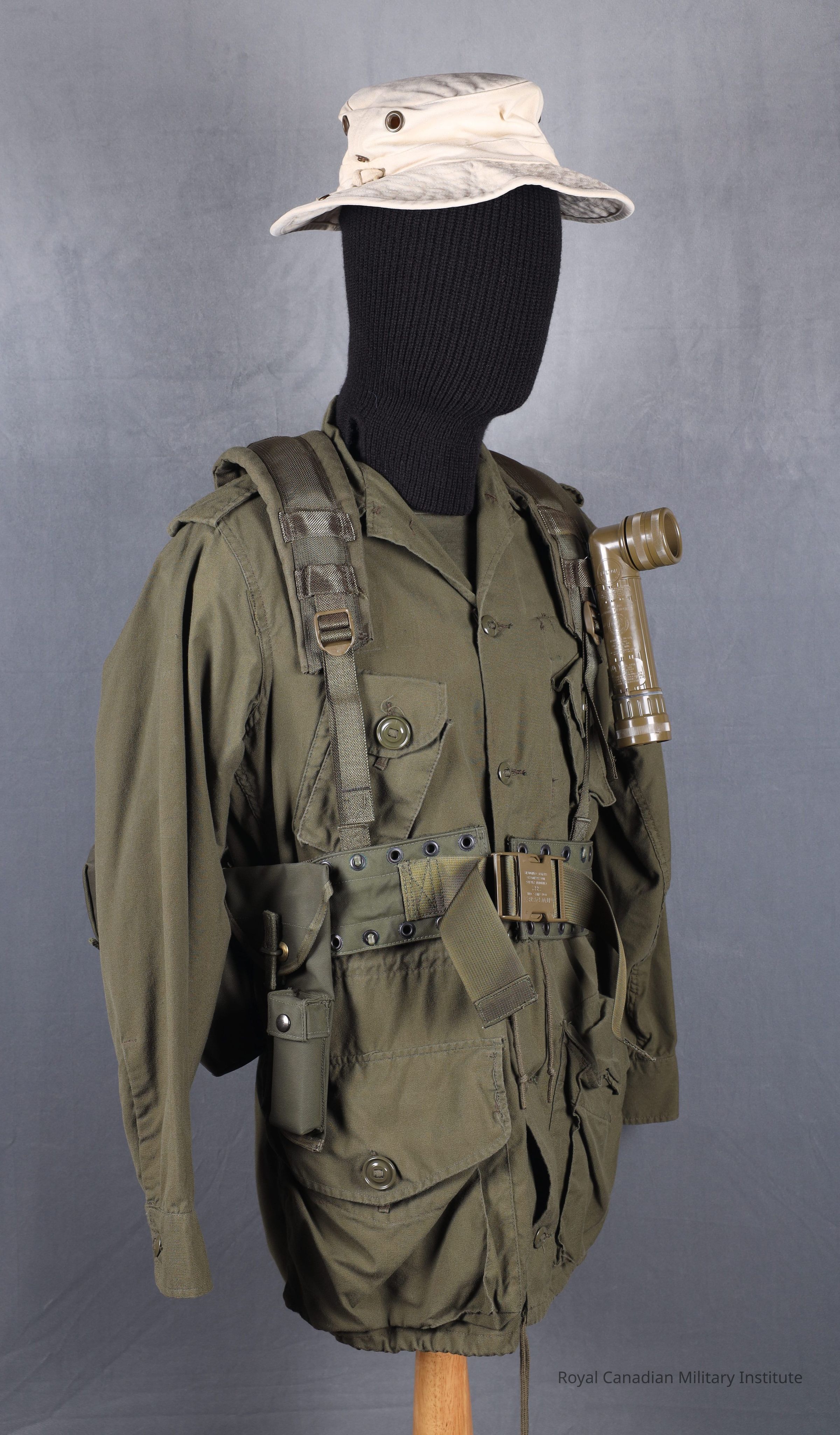 1982 Canadian Forces Pattern 1982 web equipment shoulder yoke. "V" shaped green cotton/nylon shoulder piece with attachment straps/plastic buckles for four (4) hook/strap assemblies to attach to waistbelt. Some twelve black-painted brass grommets for attaching entrenching tool (shovel).Made/Created