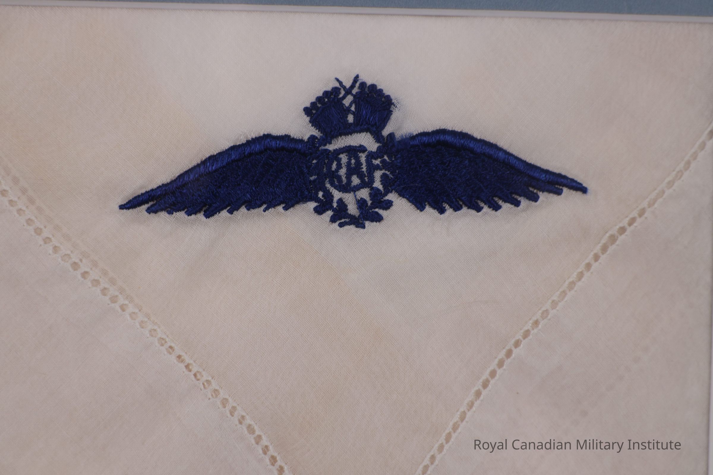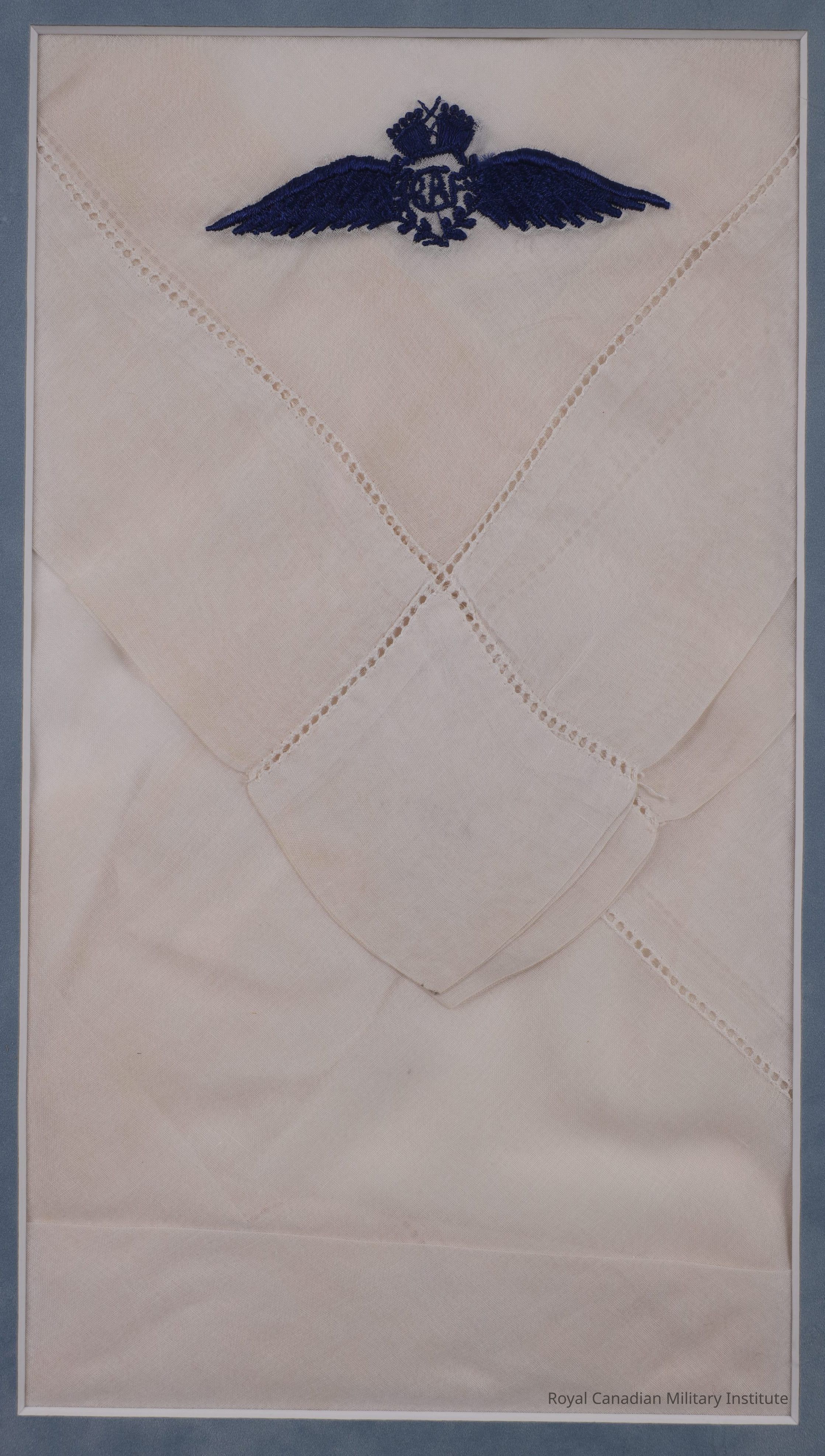 1944-1945 Royal Canadian Air Force Nursing Sister's veil. Square, white silk, hemmed border 6 mm. around edge. Hand-embroidered dark blue cotton Royal Canadian Air Force emblem: a crown atop wings, a wreathed "R.C.A.F."Made/Created