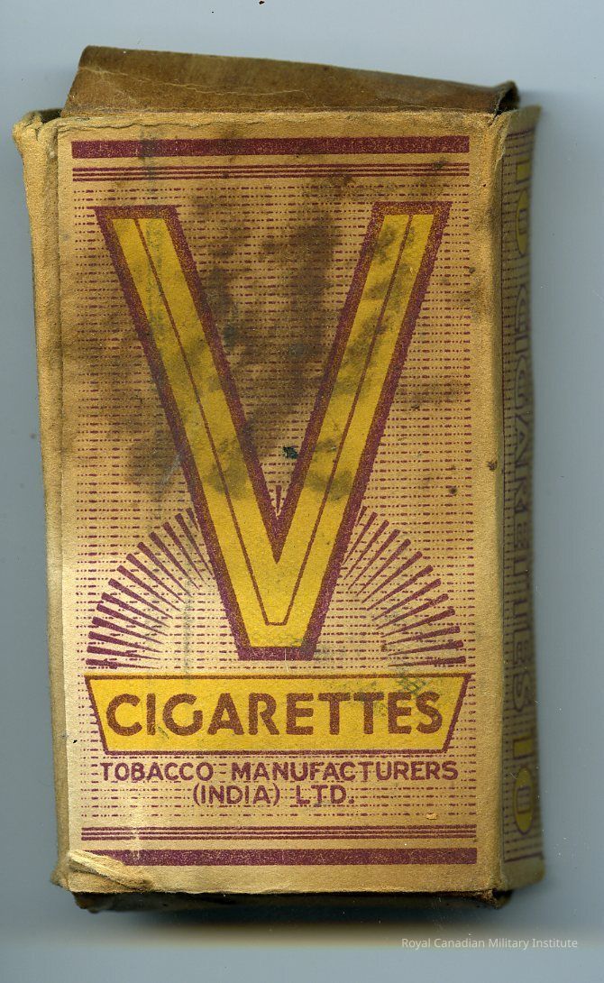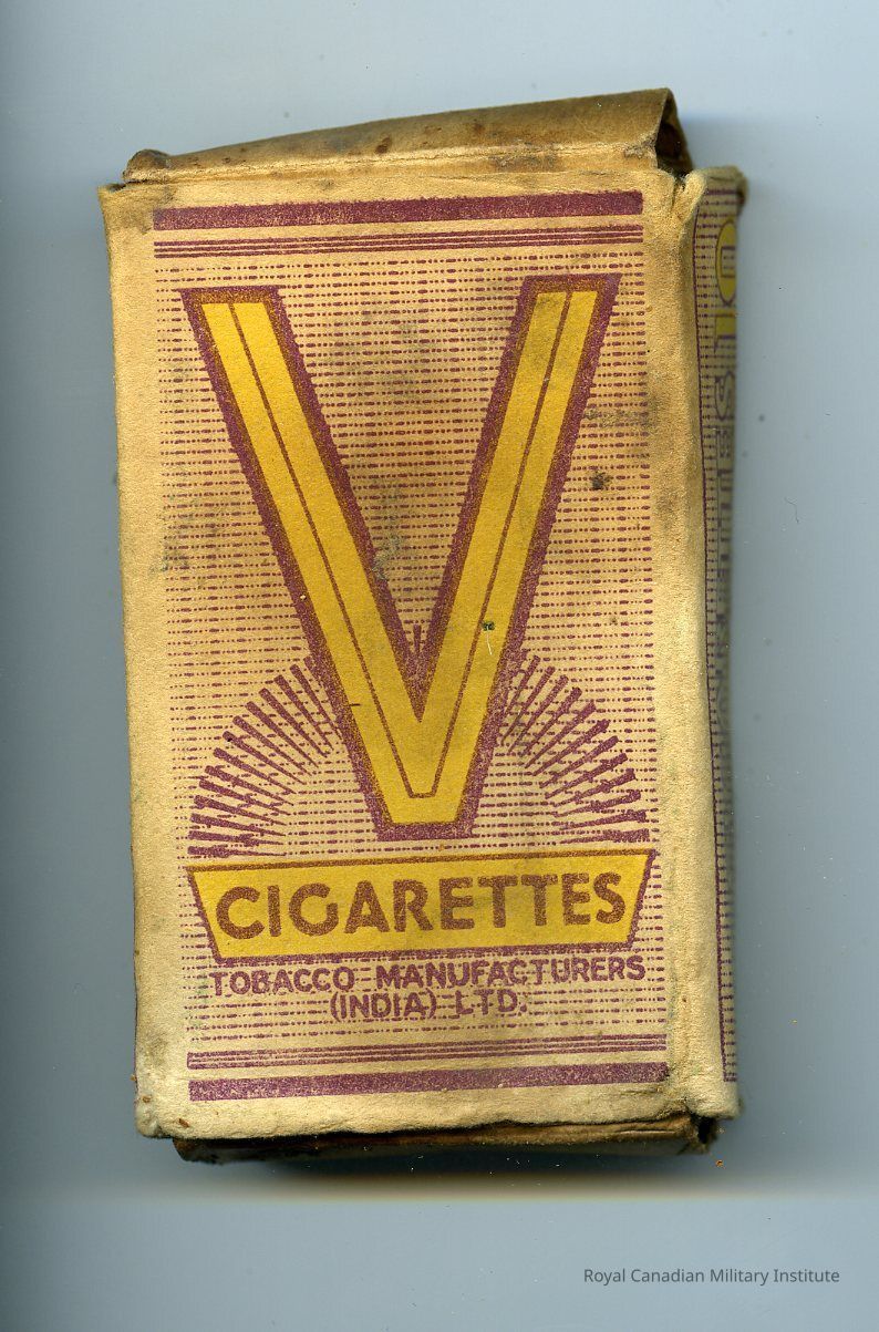 1940's British Army cigarette package. Rectangular tax cardboard, top/bottom opening lids. The box features a large "V," and underneath it reads "CIGARETTES / TOBACCO MANUFACTURERS (INDIA) LTD."Made/Created