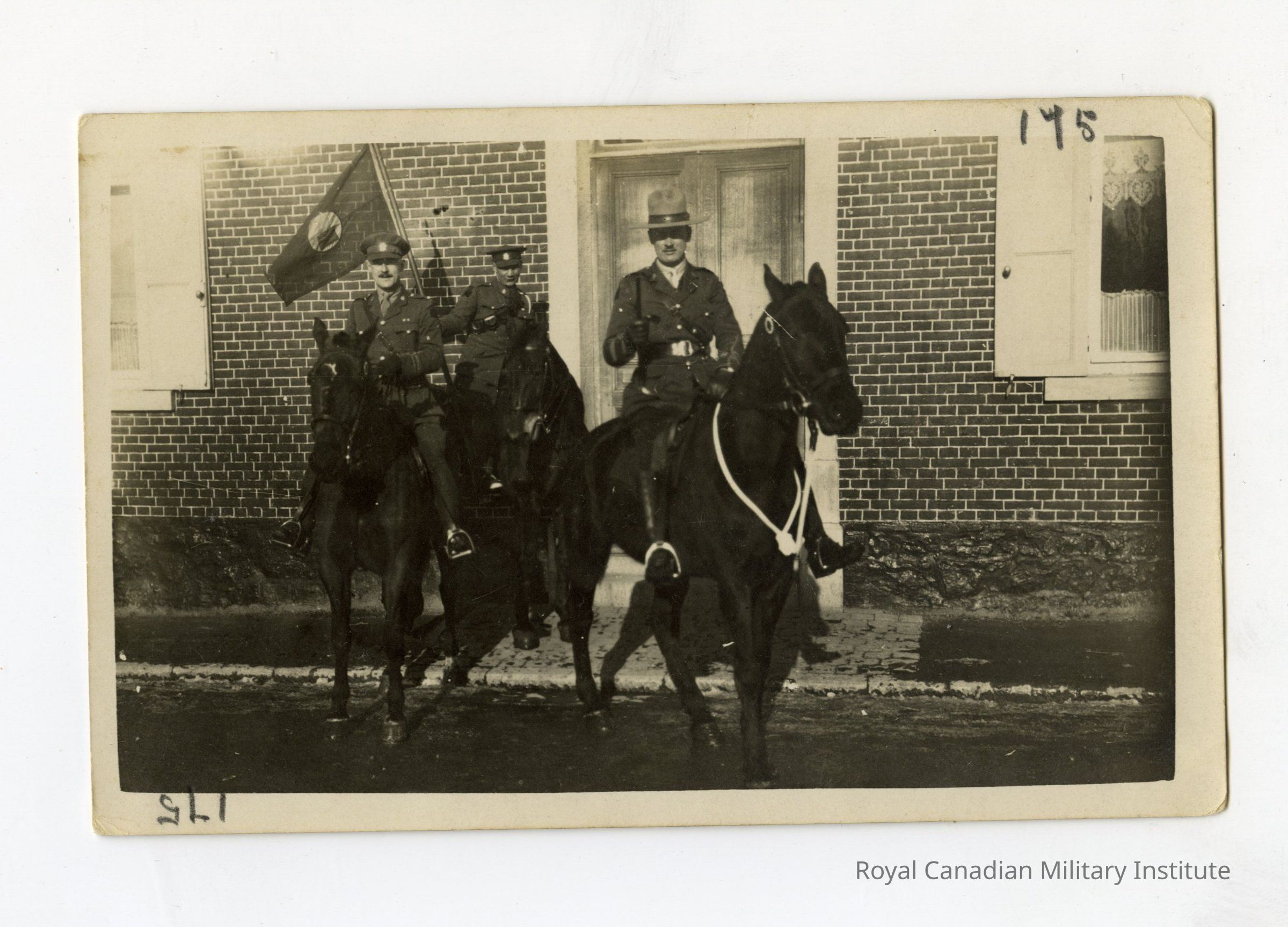 A Real Photo Postcard (RPPC) of two 4th Battalion officers and a flag bearer on horseback in France. Subjects are photographed in front of a brick building. The two officers are at the front, and the flag bearer is further back. They are all wearing their military uniforms, including their caps.