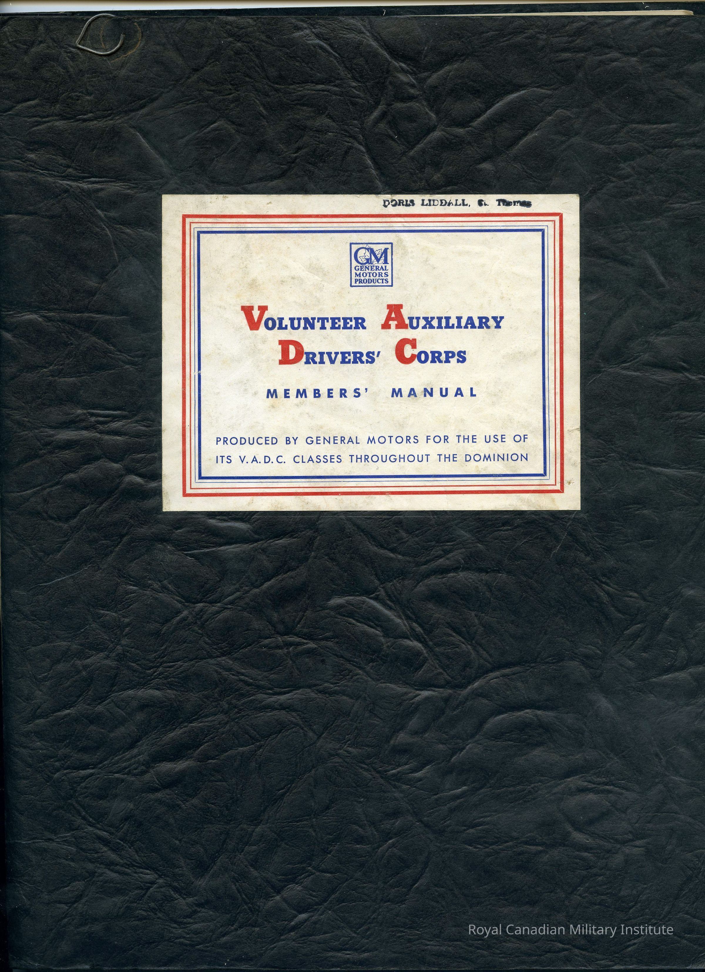 Volunteer Auxiliary Drivers' Corps instruction Manual. The small book contains sections on the parts of an automobile. At the end of the book are the owner's notes and her final exam. The book was owned by Doris Liddall of St Thomas, Ontario. She took the VADC course in September 1940 and wrote the final exmamination in November 1940. She took the course at D.G. House dealership in St Thomas.