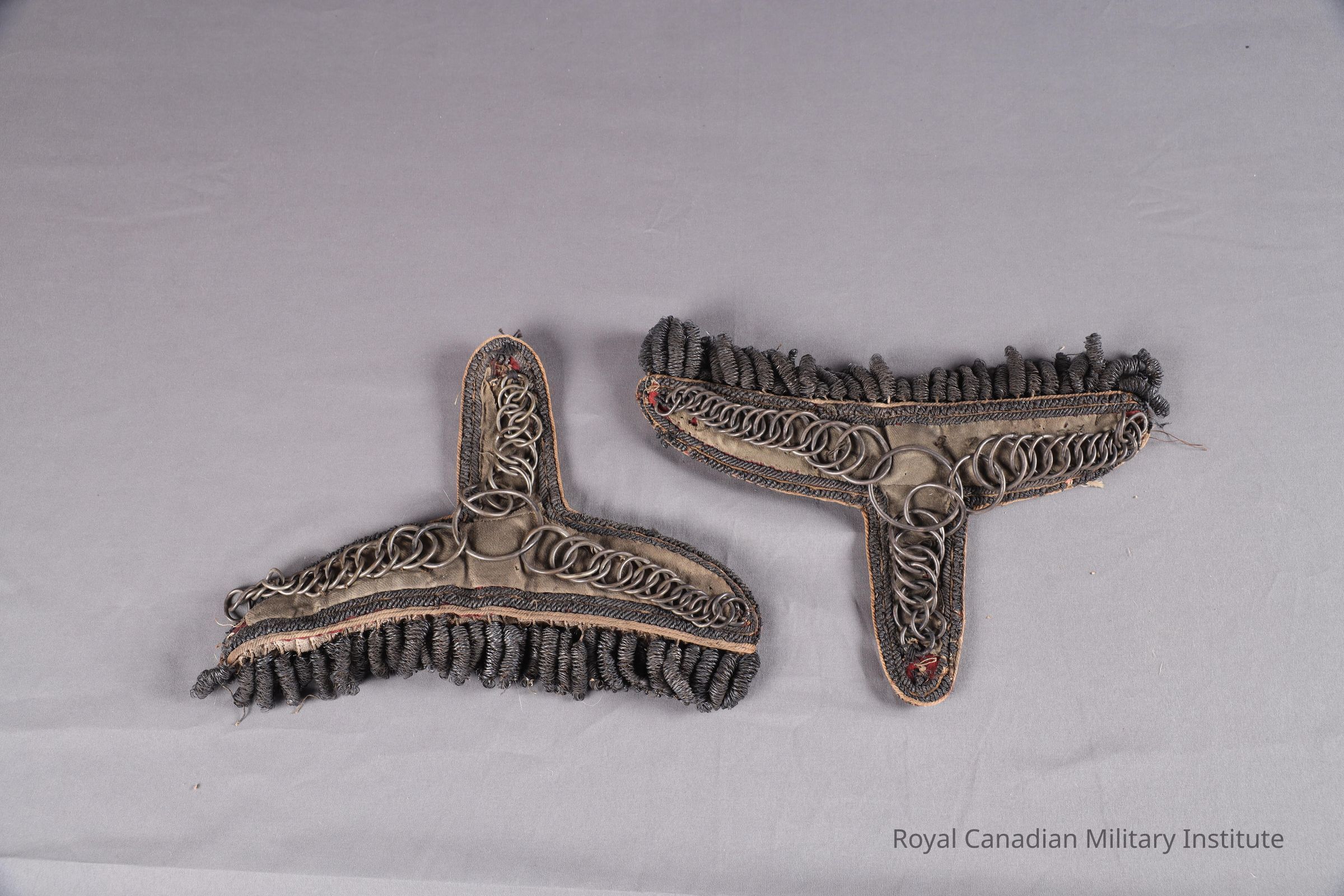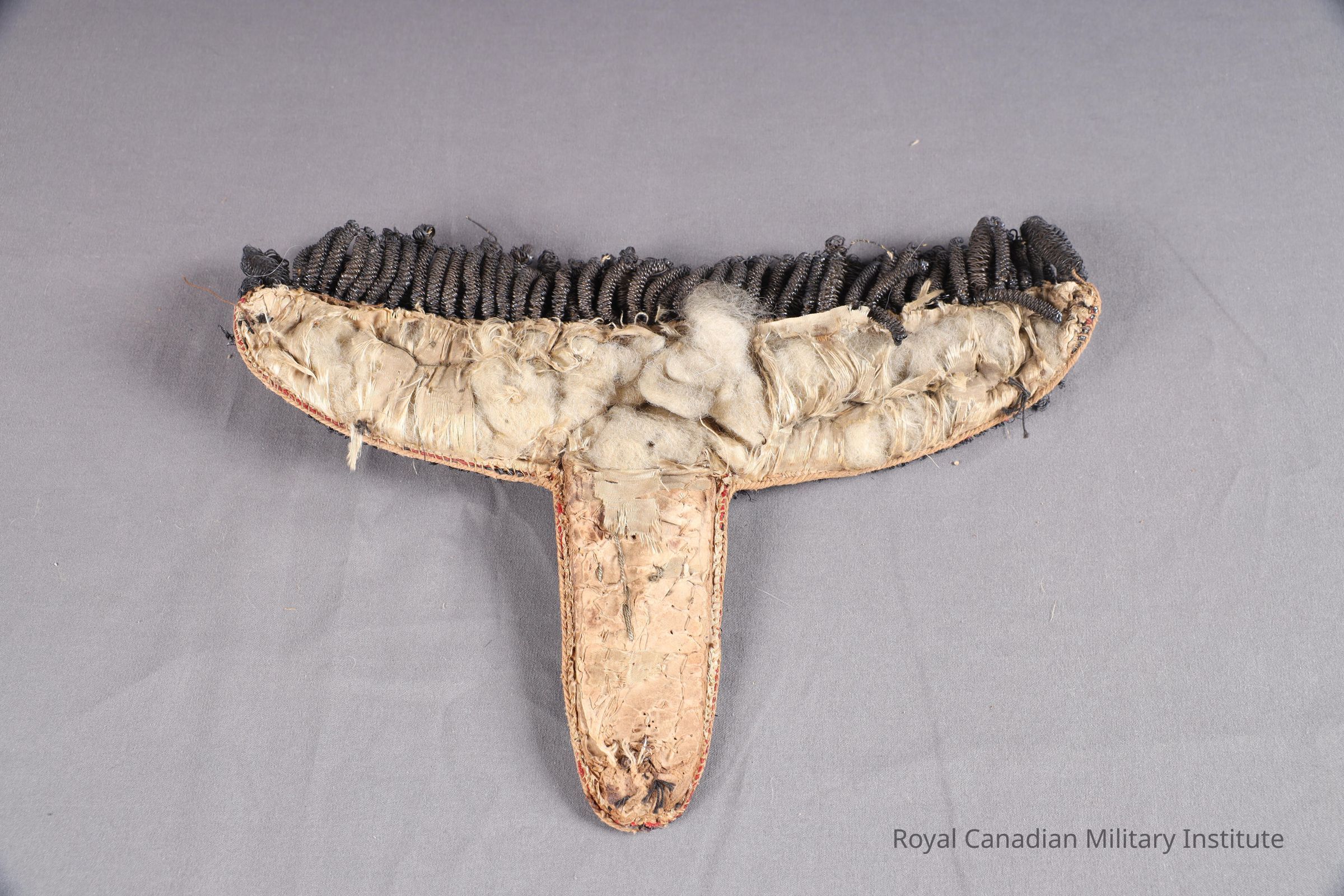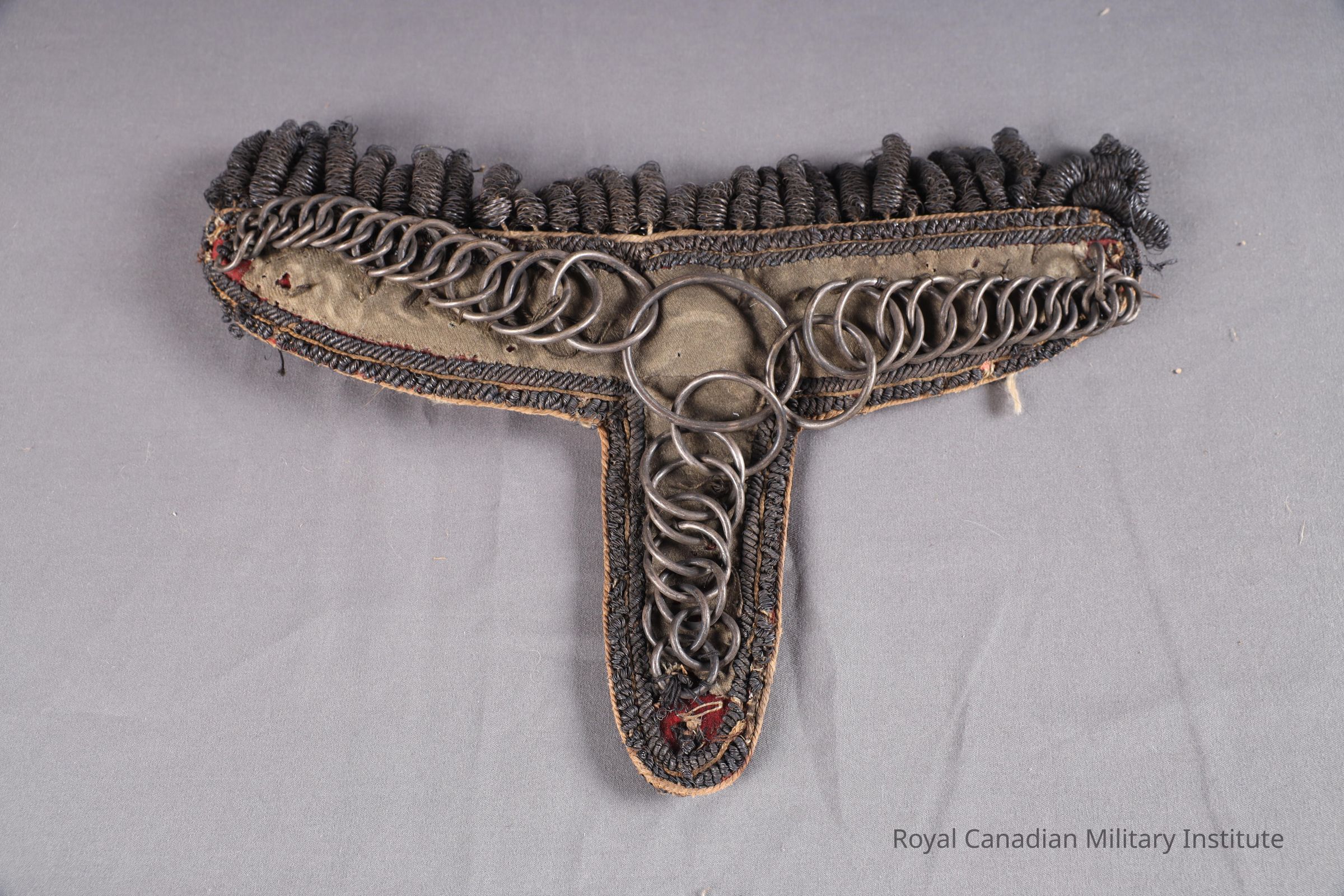 1812-1815 Canadian Militia Flank Company officer's shoulder epaulette B. The top is "T" shaped made of a white (faded into grey) leather base with control stitched (4.2 cm diameter) steel rings linked to 13 smaller (1.5 - 3 cm) steel rings on one wing and 16 smaller (1 - 3 cm diameter) steel rings on the other. On the wing running into the neck, are 9 steel rings (1.7 - 3 cm diameter). The edge of the leather is stitched with a double line of 1 cm wide silver bullion wire edging. The outward shoulder facing has about 87 silver bullion wire spools with at least one missing spool in the back. The spools have faded into black (3.7 cm length by 1 cm diameter). Leather is sewn to red wool backing. The underside of the epaulette is a linen lined with a grey-white wool batting covered in linen.Inscription/Signature/Marks
