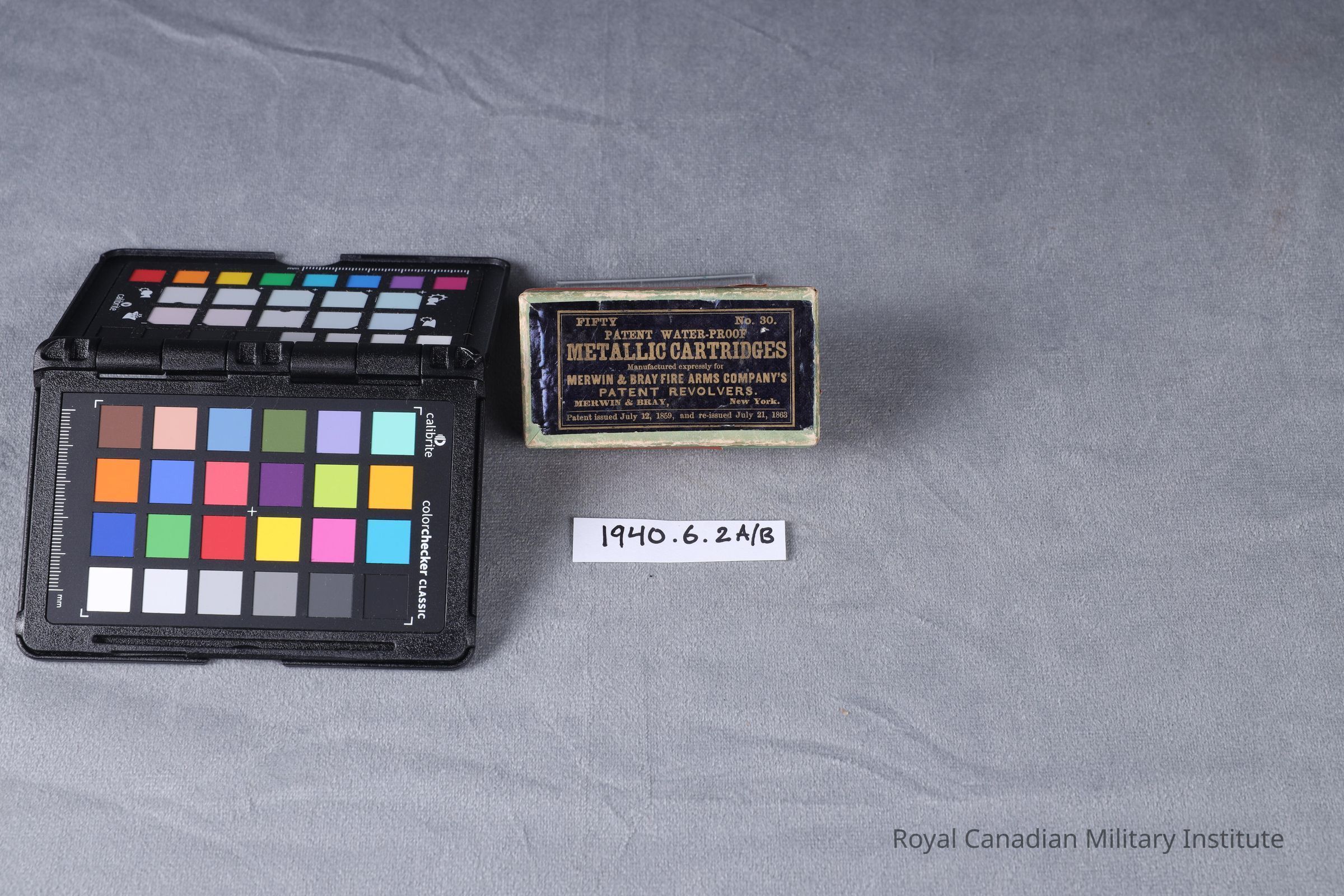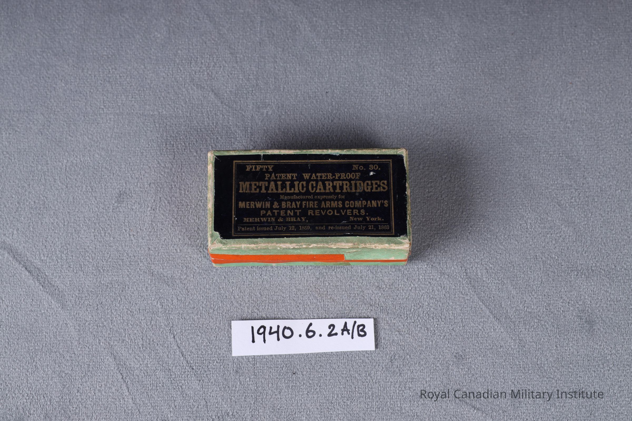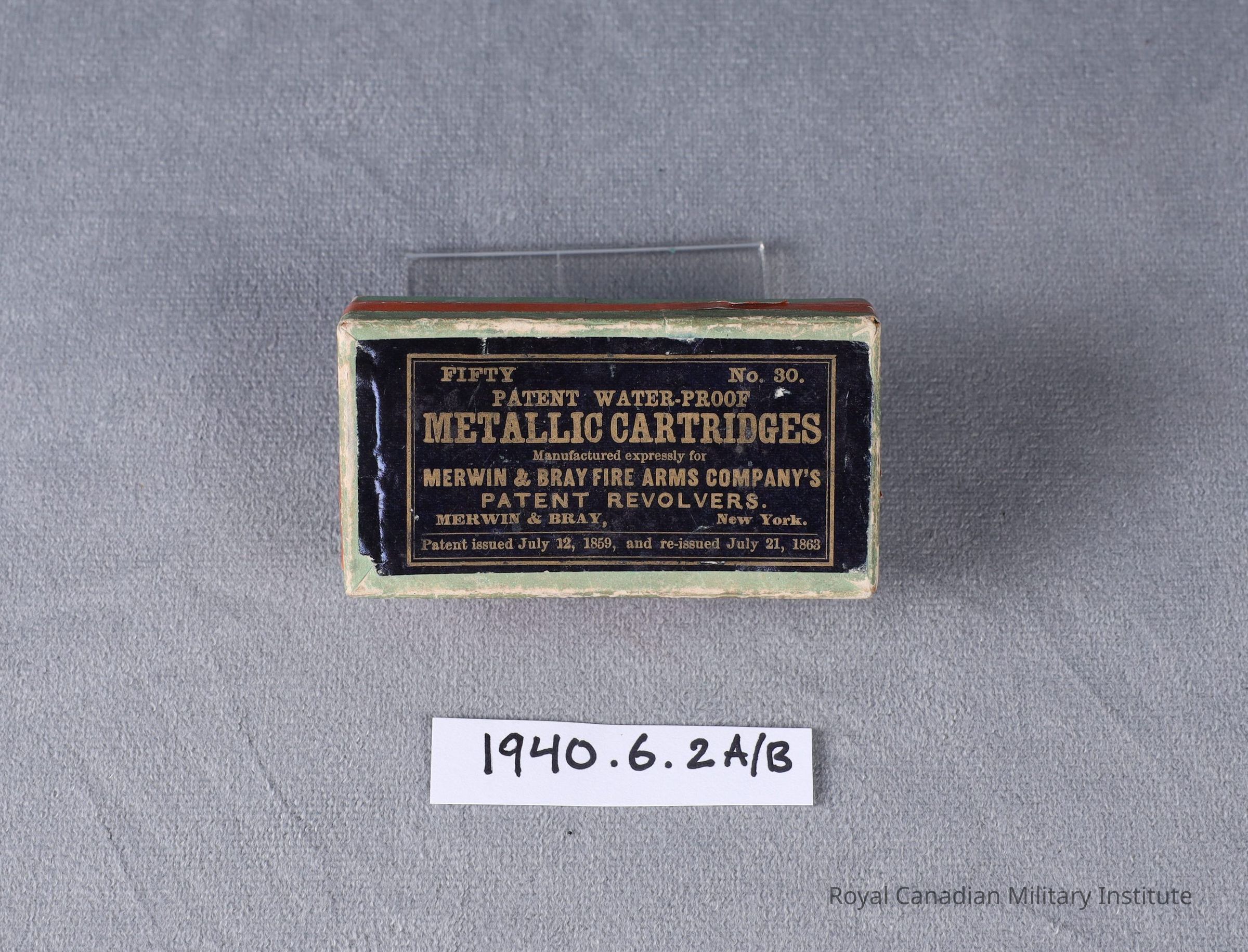 Stamped and printed into label: "Fifty No. 30 Patent Waterproof Metallic Cartridges Manufactured Expressly For Merwin & Bray Firearms Company Patent Revolvers. Merwin & Bray, New York. Patent Issued July 12, 1859, and Re-issued July 21, 1863."Dimensions