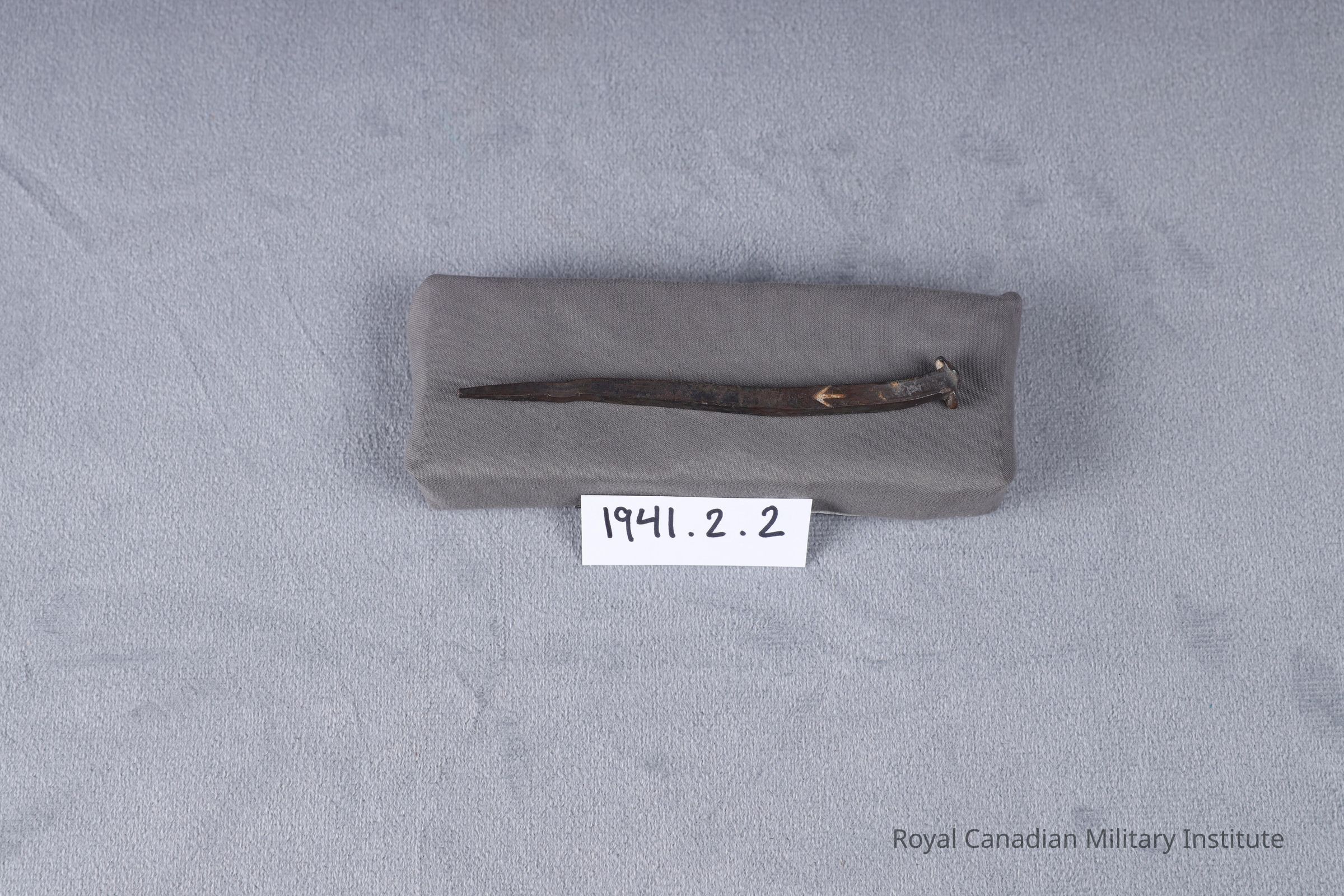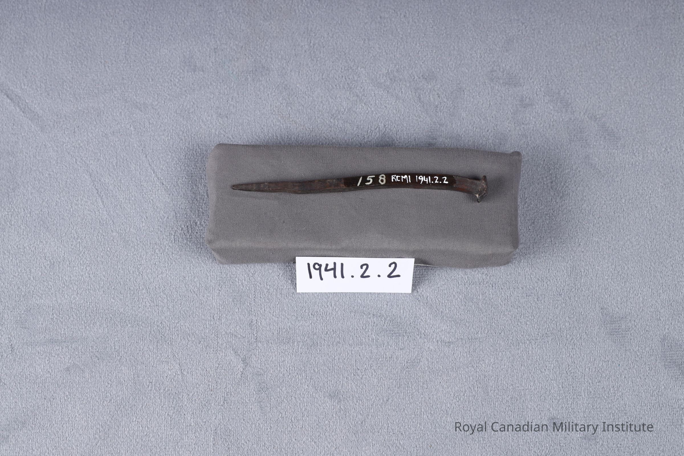 1840's-1860's Canadian Department of Militia and Defence "Fort Henry Nail". Tapered copper, four-sided with triangular shaped head thicker than the nail body (7 mm).Made/Created
