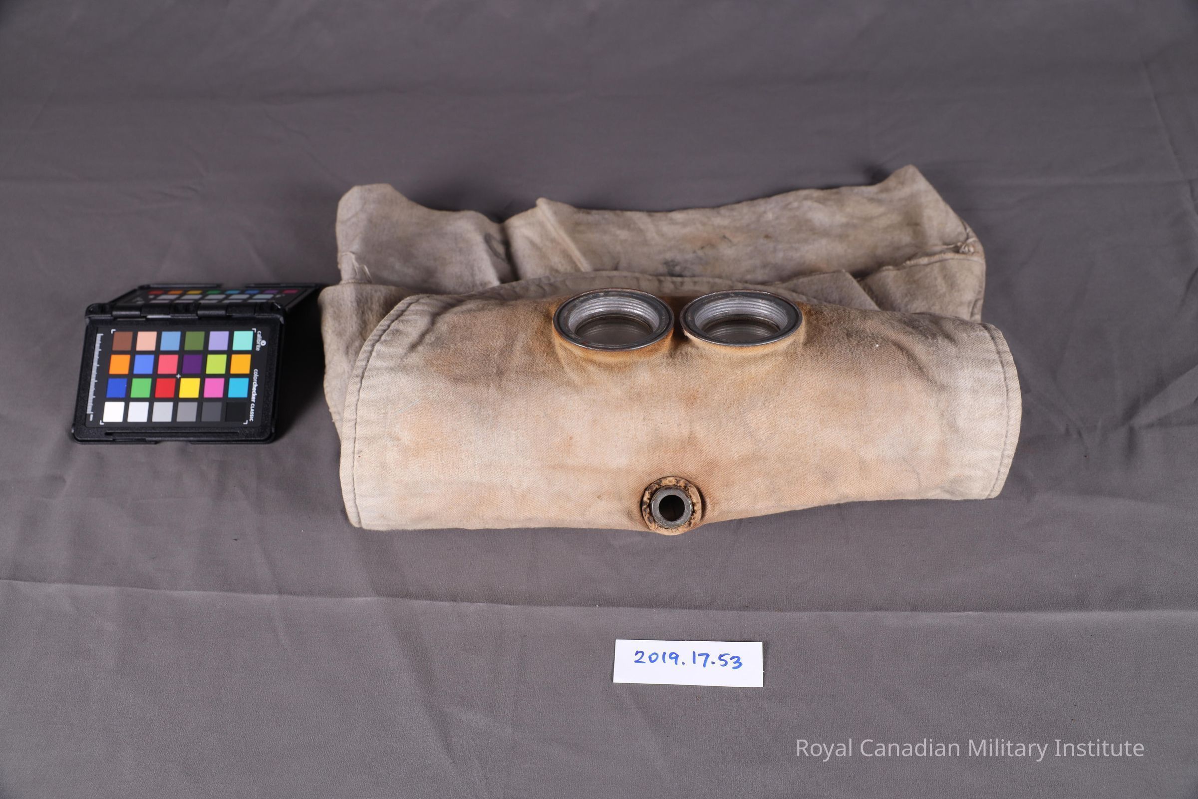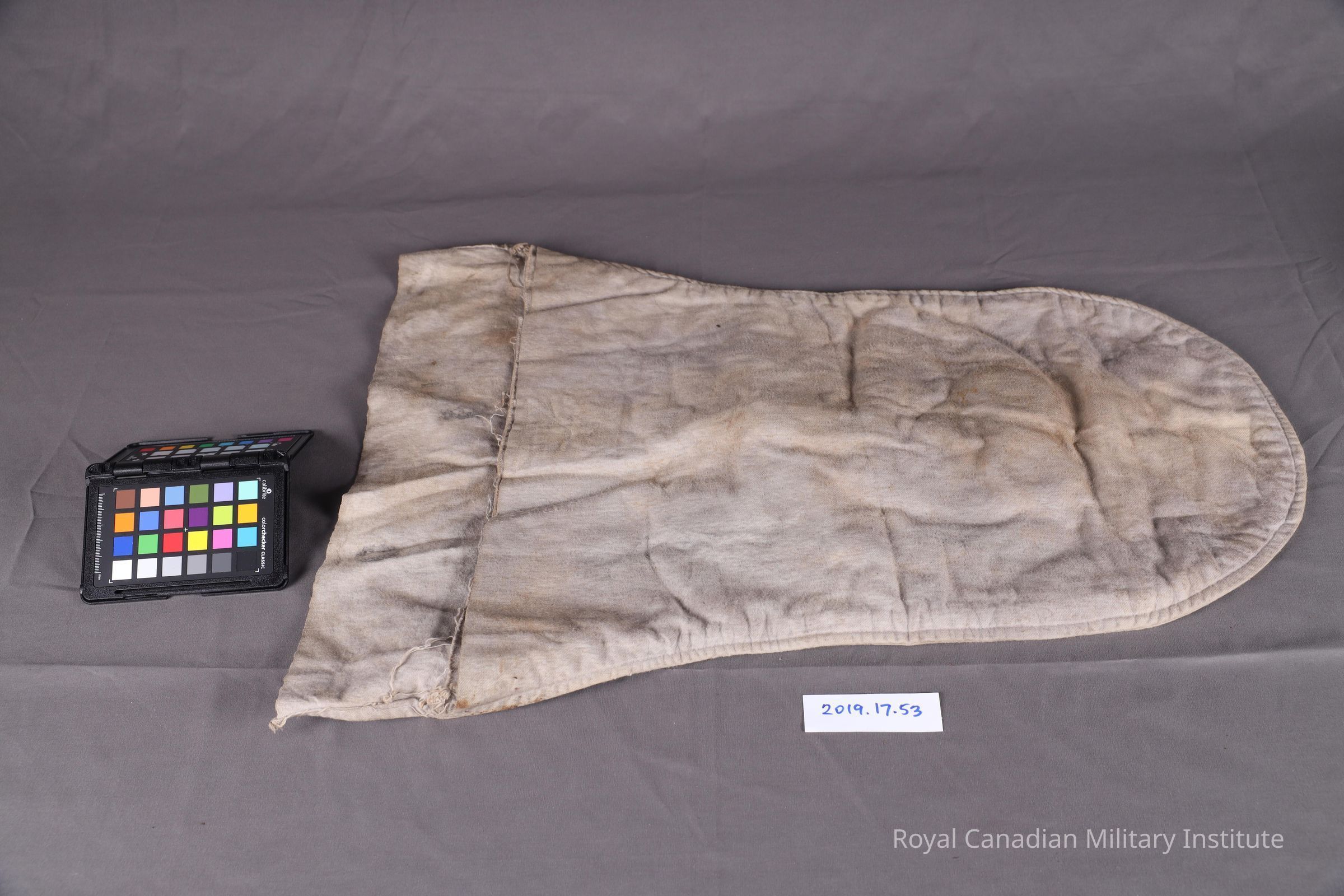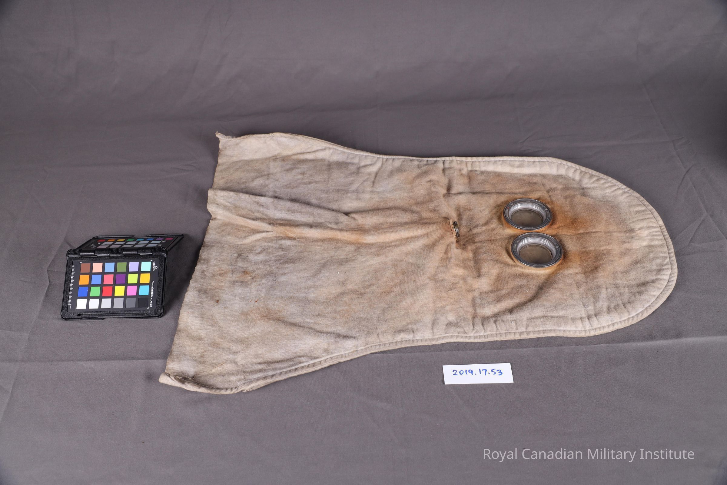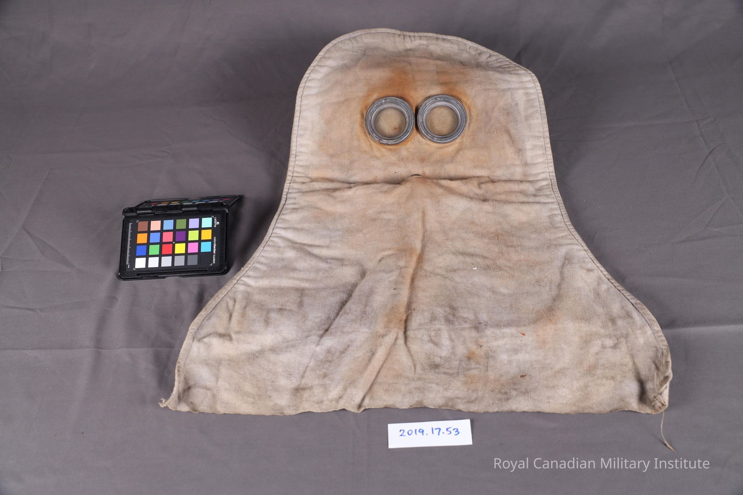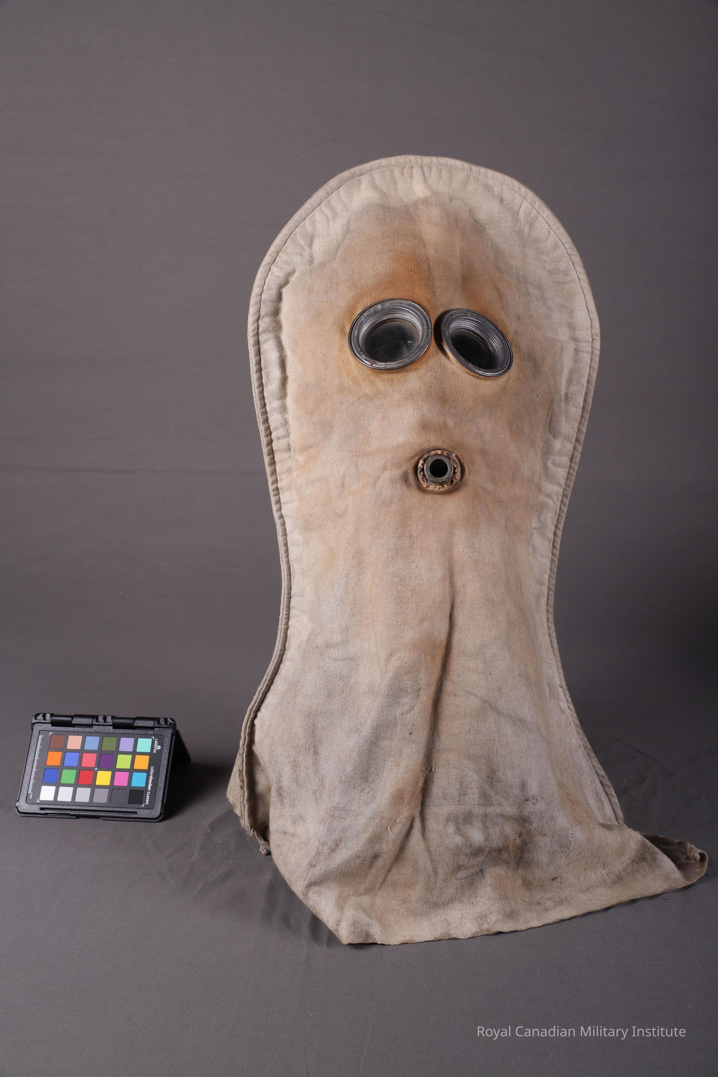 1915 British Army PH anti-gas helmet (hood). Known as the P-helmet, it is an oversized hood, with two eyeholes, and what is missing is a rubber tube that was attached to the mouth. The material is made from a grey flannel.Context
