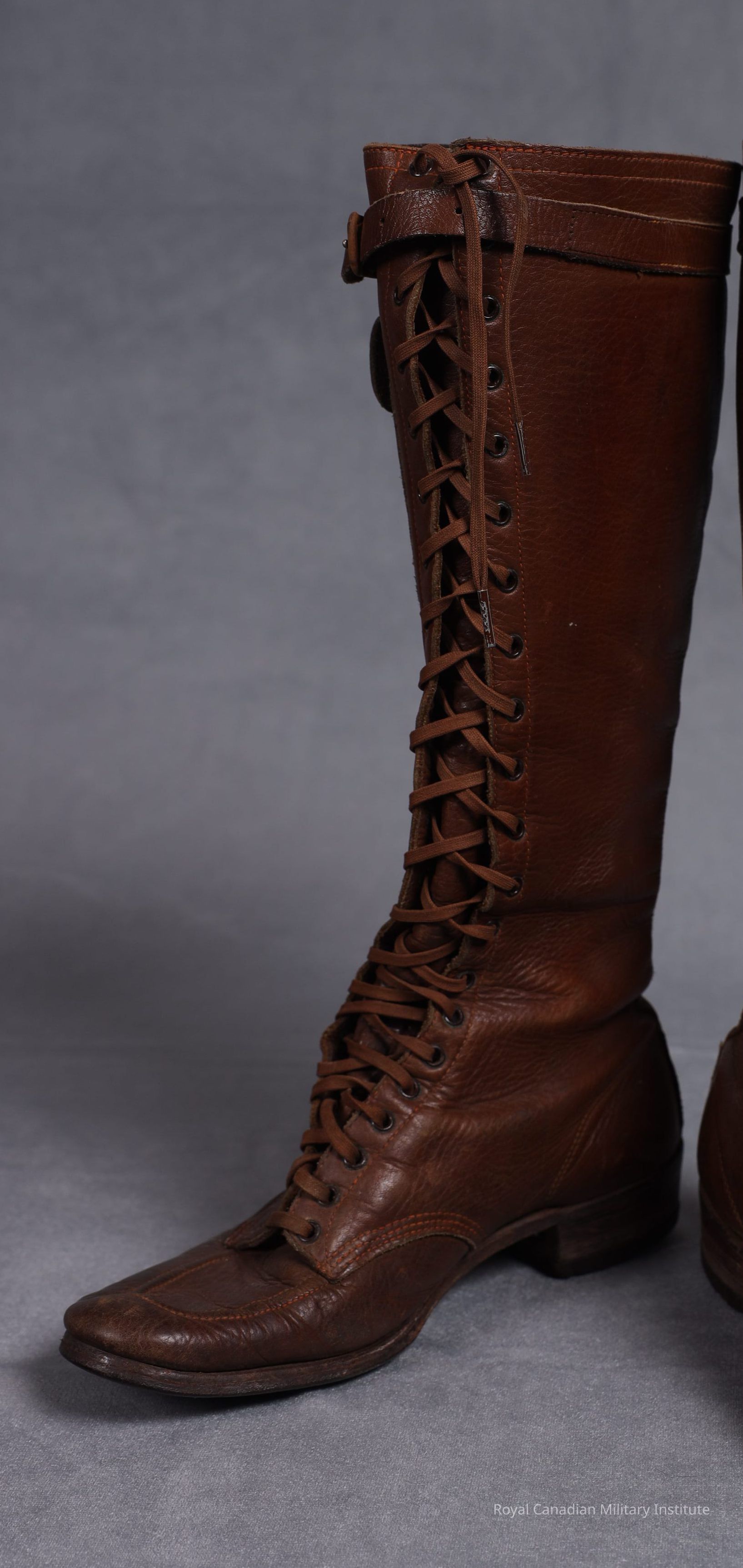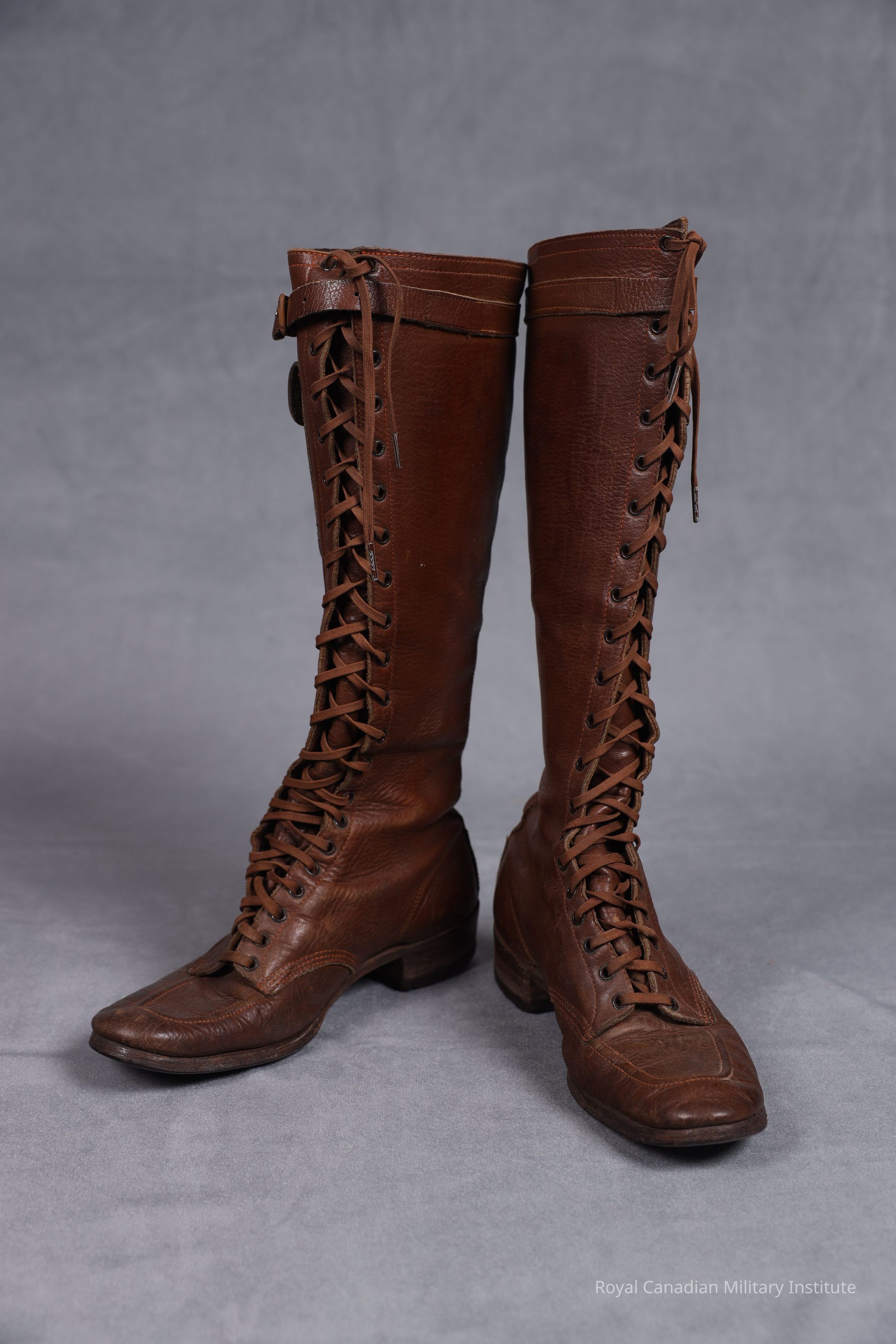 1943-1945 Royal Canadian Army Medical Corps Nursing Sister's shoe (left). Brown leather, oxford type. Four piece stitched construction: vamp, counter, toe cap, button-piece, tongue, sole. Leather/rubber heel nailed. Brown cotton laces intact (still tied).Made/Created