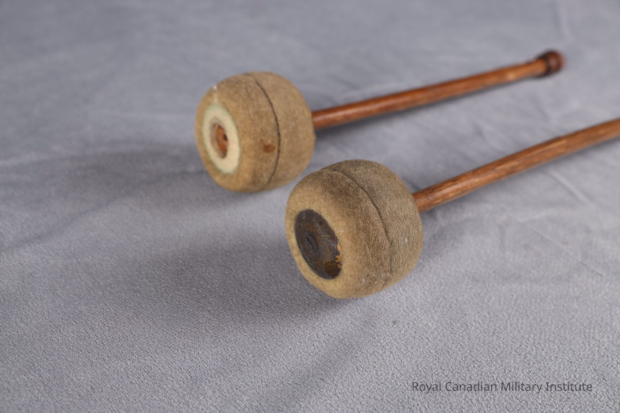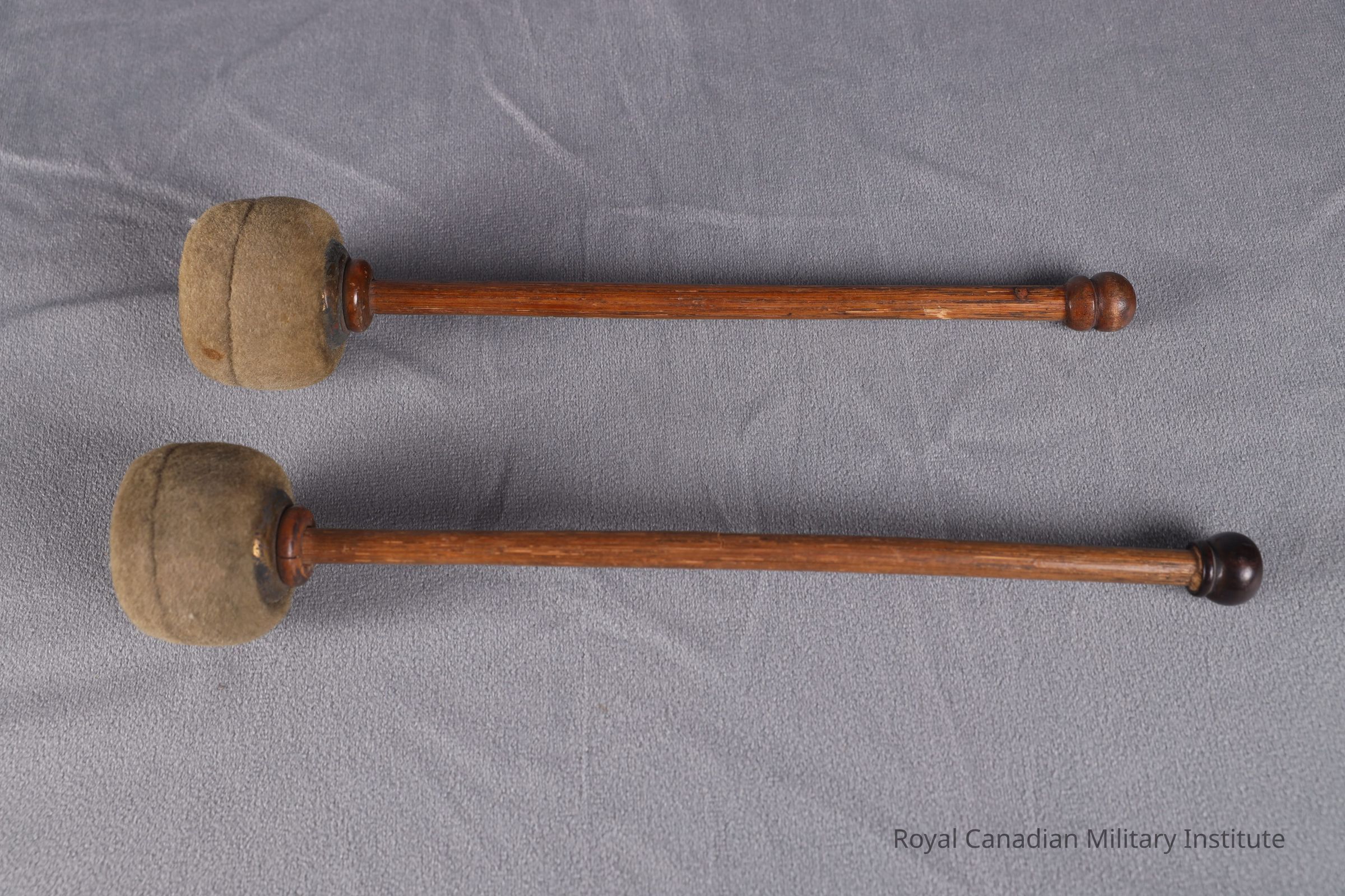1914-1918 Canadian Expeditionary Forces Infantry Battalion mallet drumstick made of wood and green khaki wool felt. Tip of the drumstick is covered with a brass plate. The shaft is made of a stained brown wood with the butt finished with a darker brown stain. Part of a set with another drumstick and a brass tension drum.Dimensions