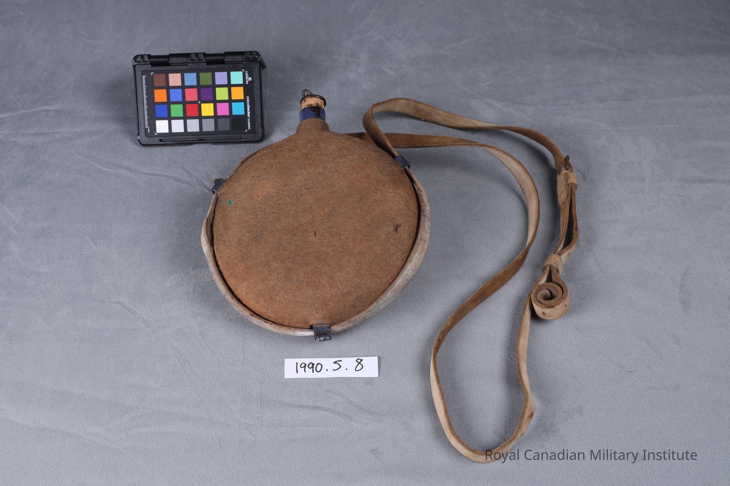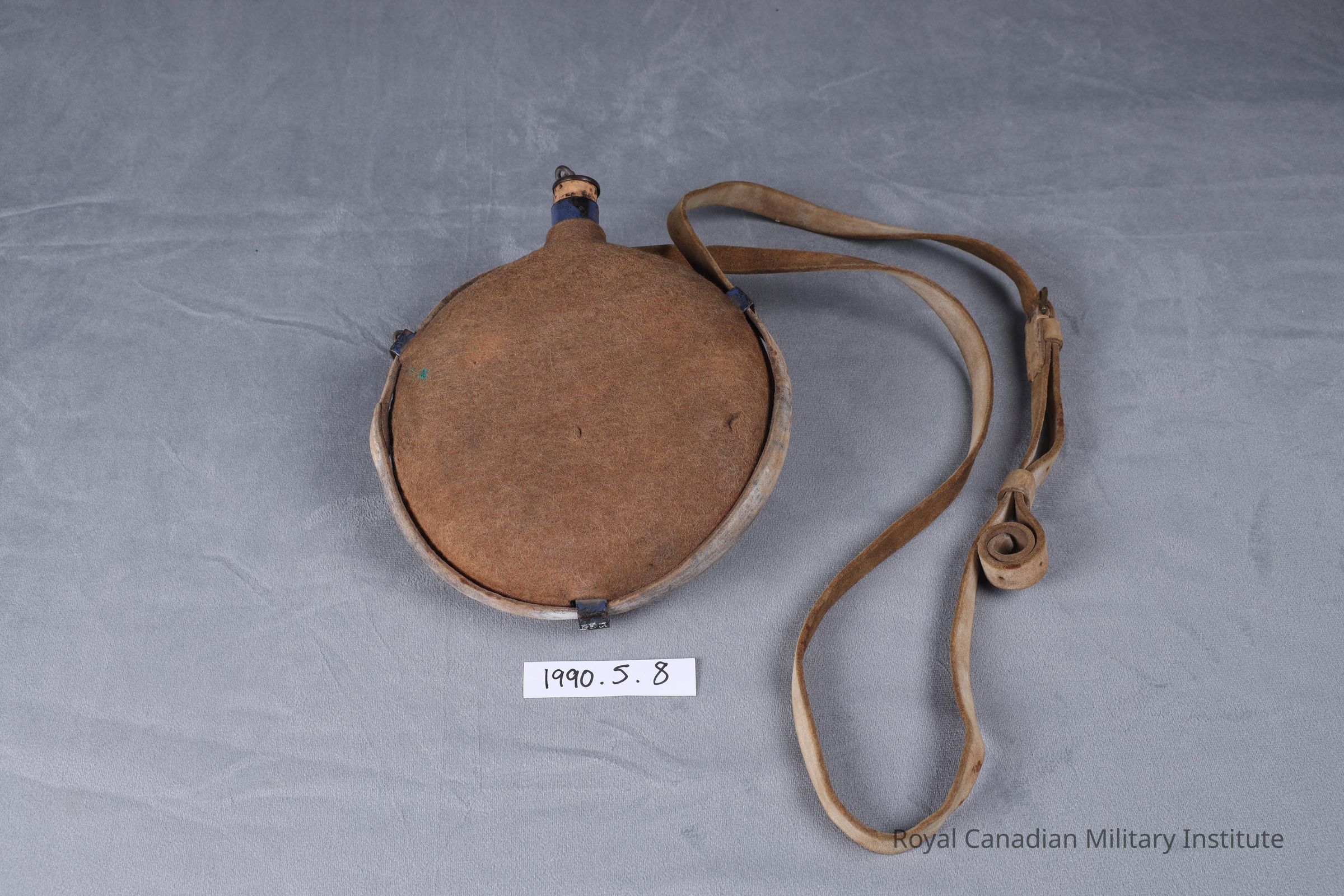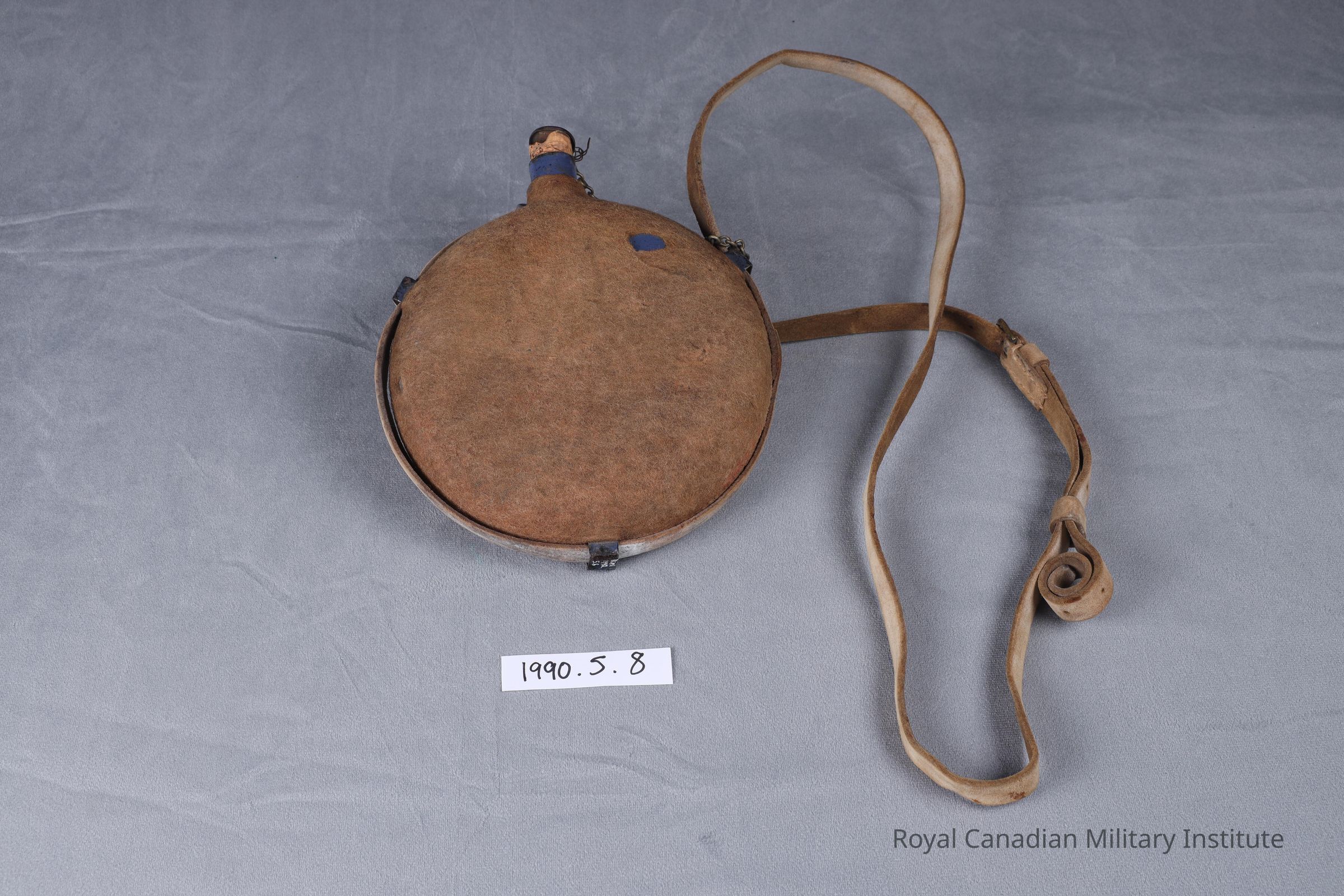 1899-1902 British Army Pattern 1888 web equipment water bottle. Flat circular blue-enamelled sheet steel, with spout and 4 cm. long cork stopper attached to spout by steel chain. Body of water bottle covered with one-piece tan felt liner. Three steel loops hold a buff white shoulder strap 174 cms. long. Strap has adjustable brass buckle.Made/Created