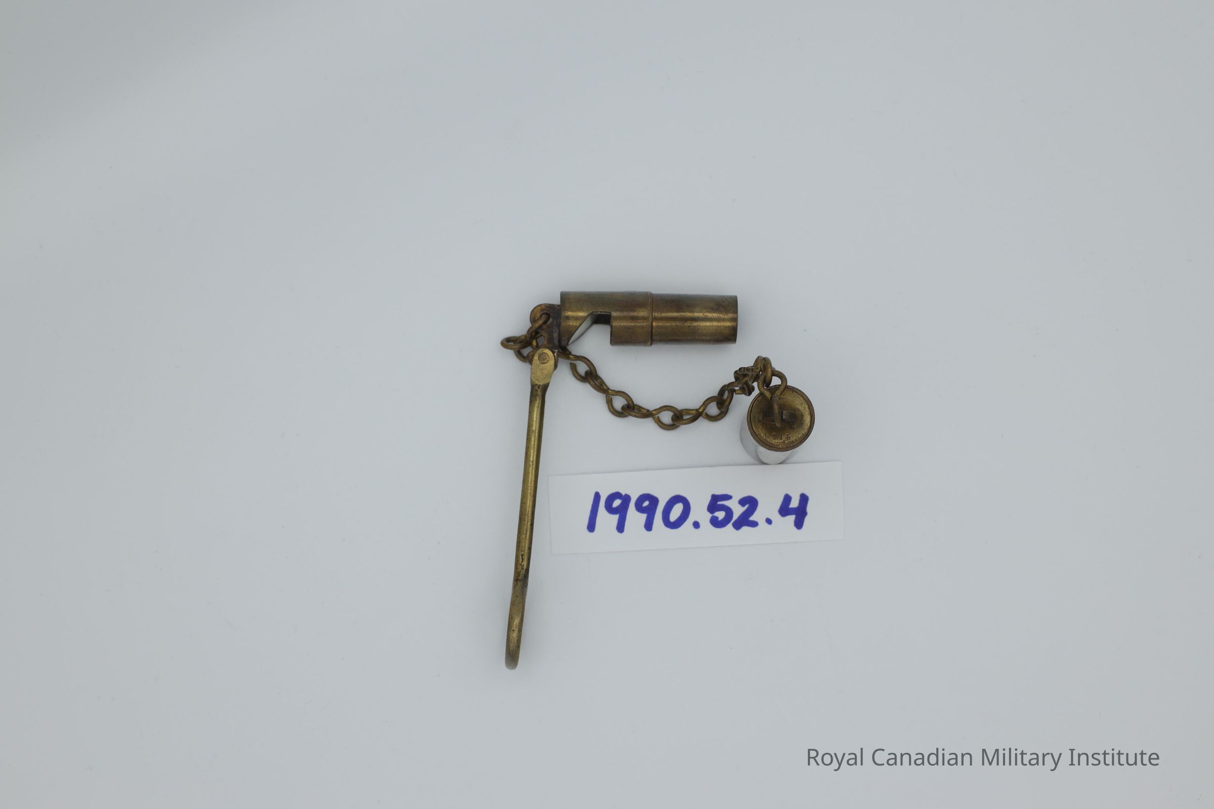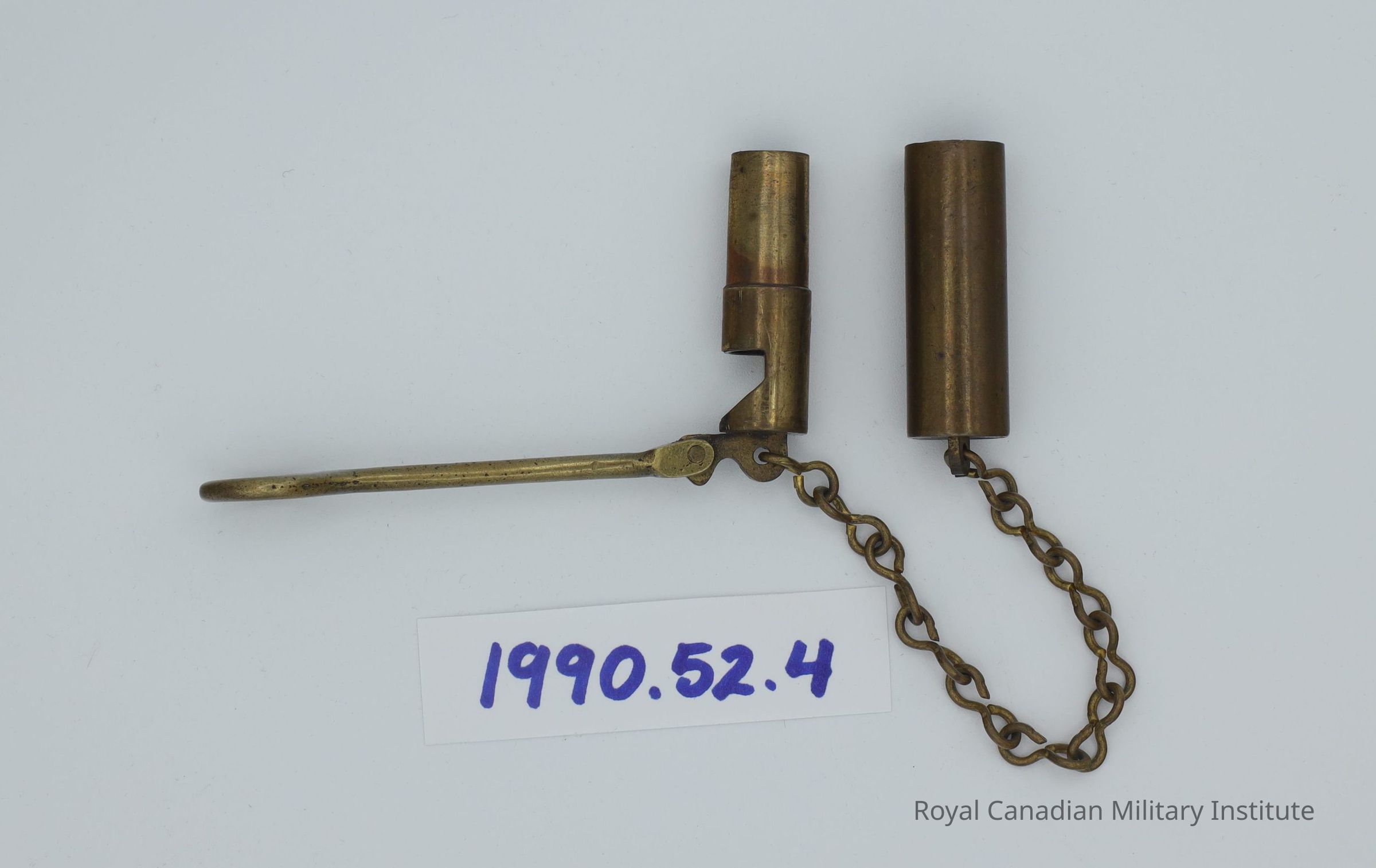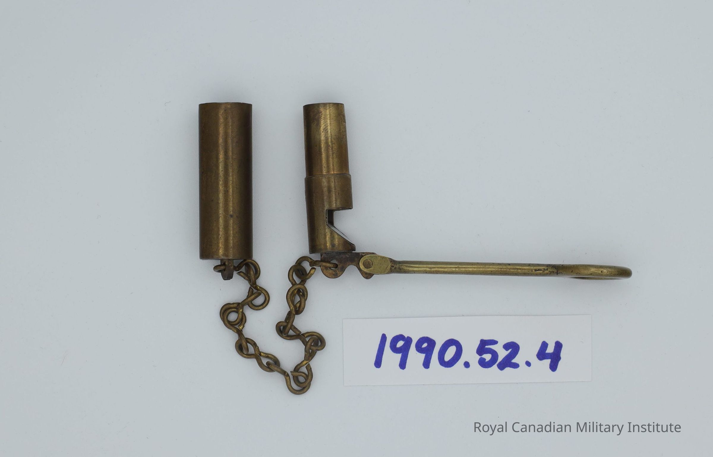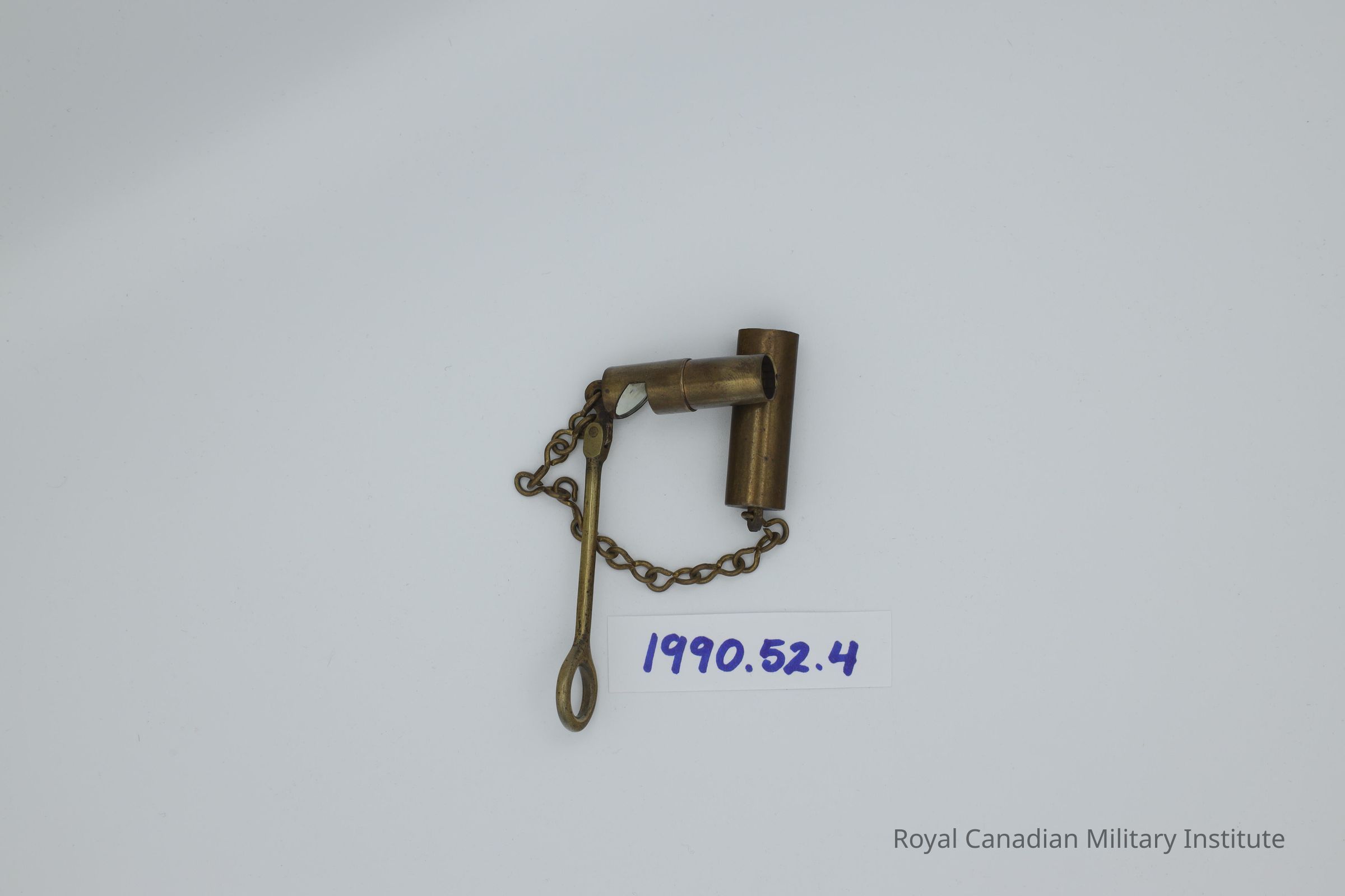 1916 Canadian Expeditionary Force rifle bore mirror. Cylindrical, brass, open at one end. Base has "V" notch with inset mirror, mount with hinged handle. Cylindrical end cap for open end, joined to body with brass chain link. Cap is 4.2 cms. long.Made/Created