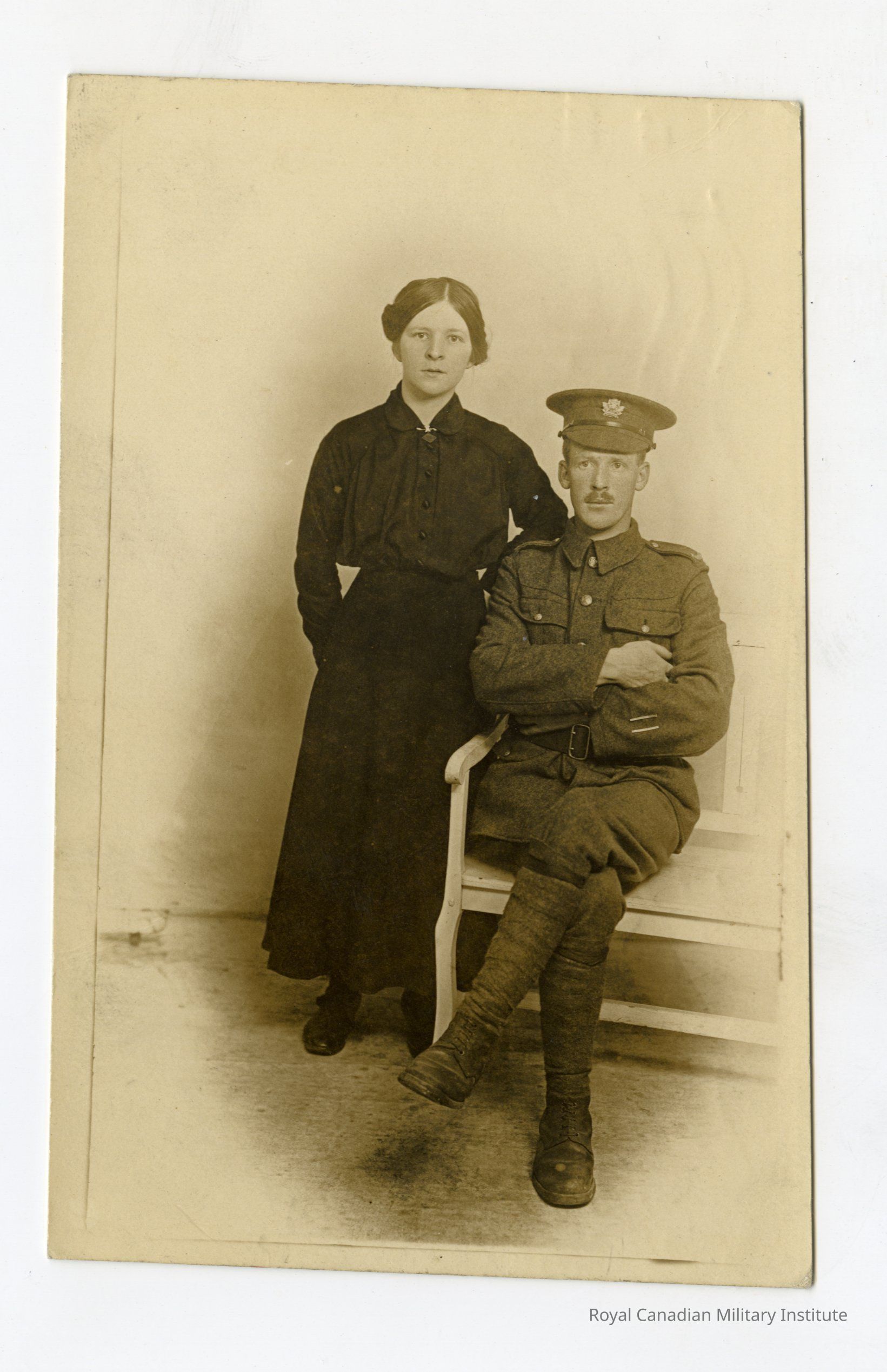 An unidentified Real Photo Postcard (RPPC) of a 4th Battalion soldier alongside a woman in civilian clothes. The soldier is sitting on a white chair, with his arms crossed over his chest, and his left leg crossed over his right. The woman is standing next to him, wearing a dark-coloured dress. He is looking off to the side of camera, she is looking directly at the camera. This soldier wears two wound stripes on his military uniform's sleeve, in recognition of being twice wounded in action.