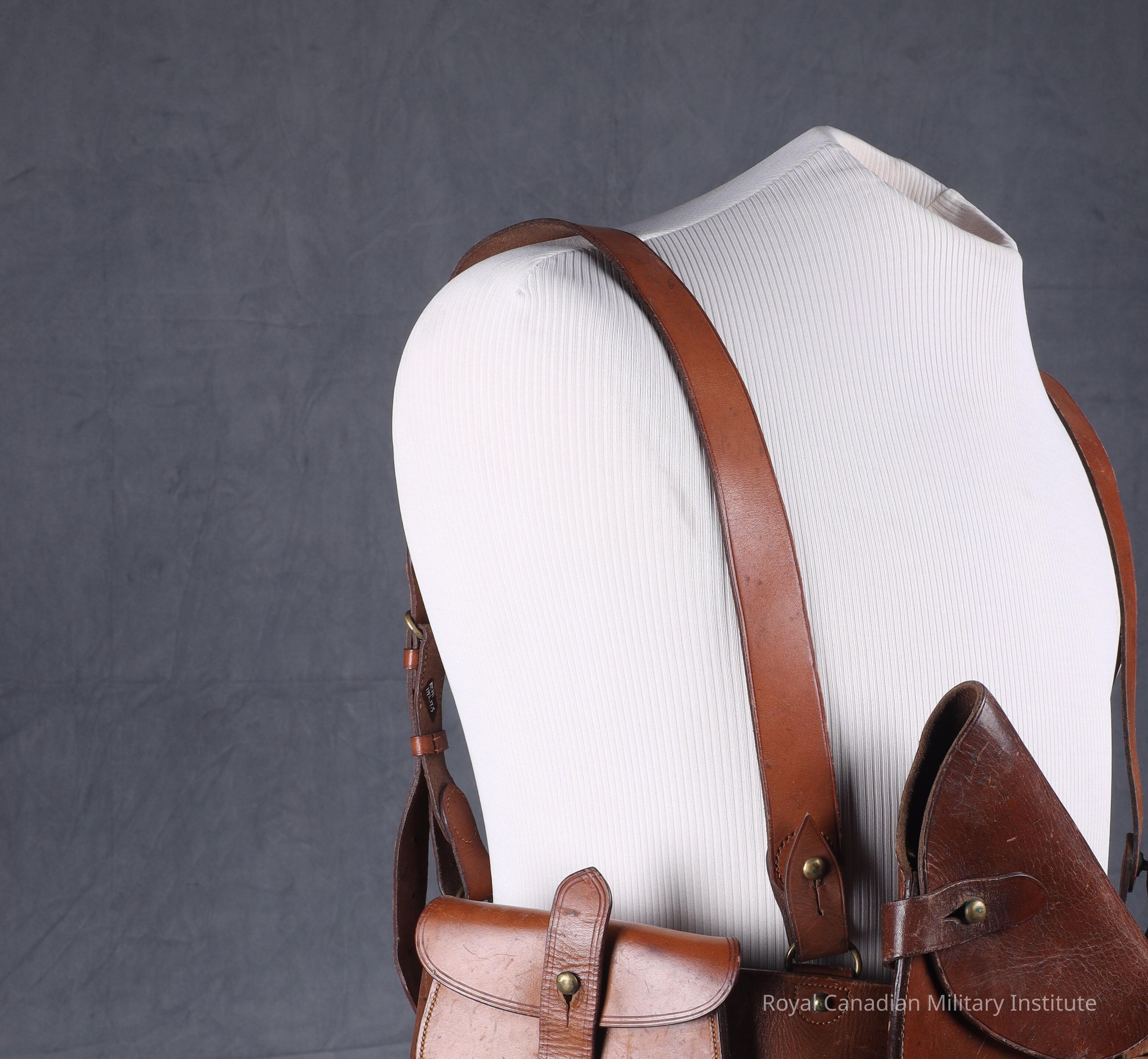 1899-1902 British Army officer's Sam Browne shoulder strap. Rectangular light brown leather. Stitched construction: strap body, buckle brace, brace loop, two slider loops, one brass buckle. Strap buckles into brace, two tapered ends fit around loops on waistbelt.Made/Created