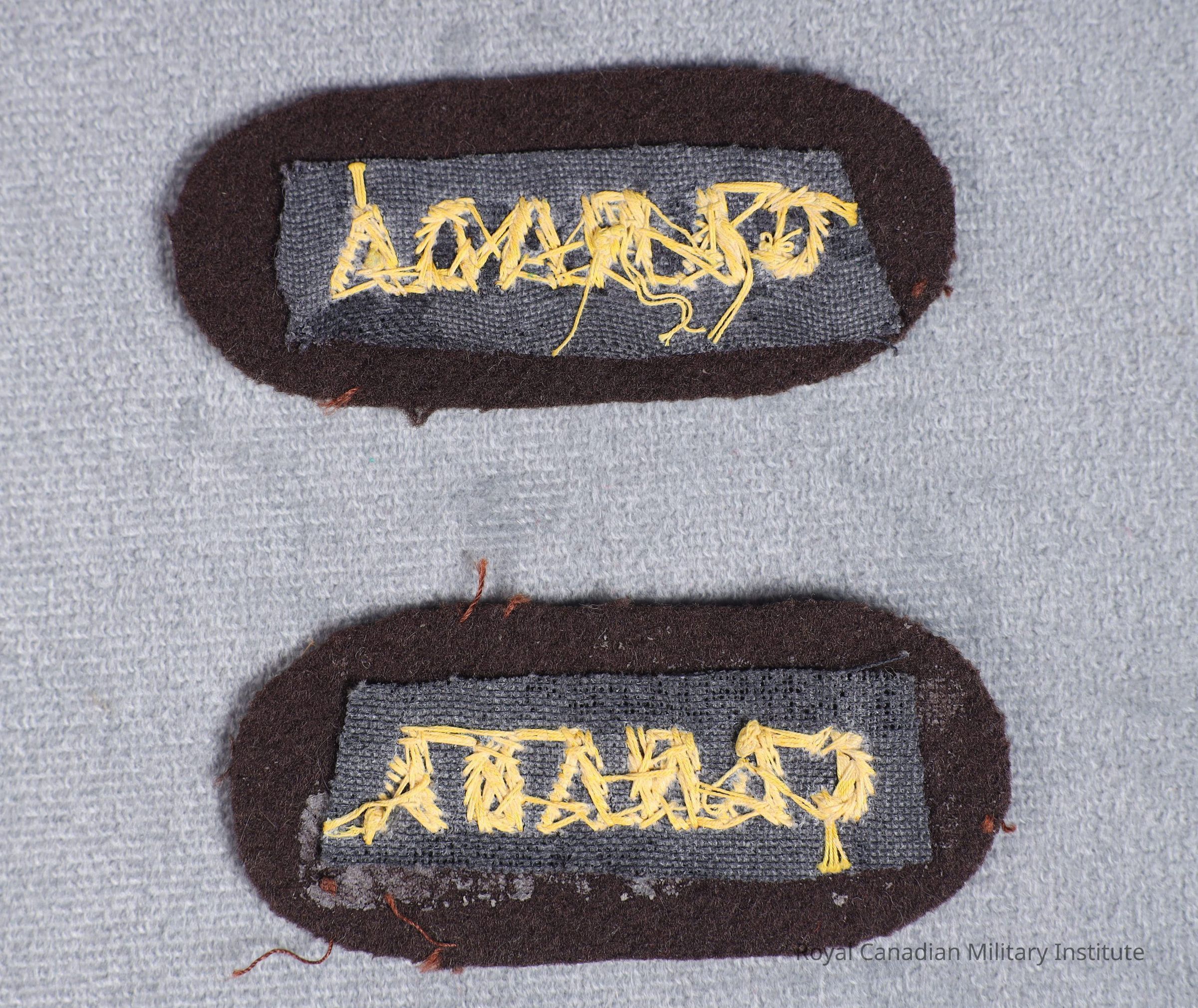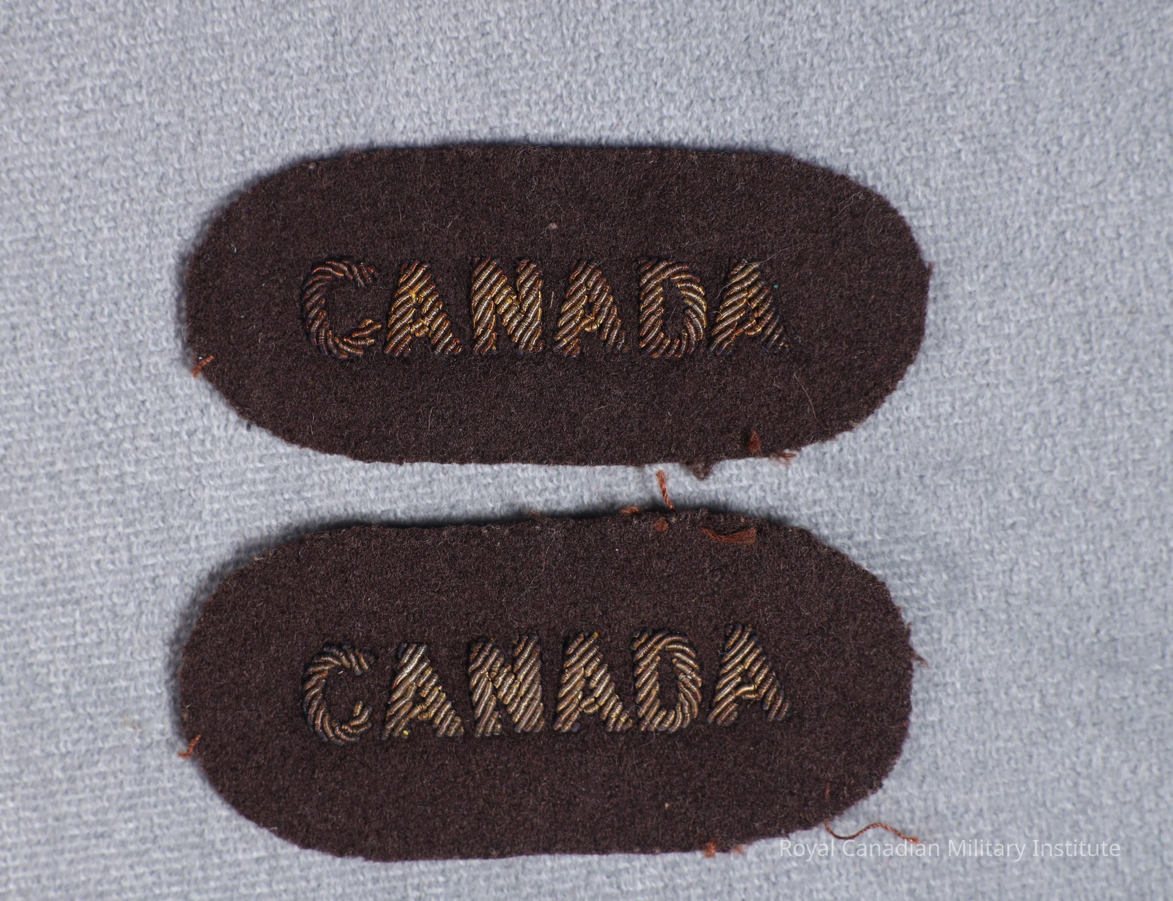 1942-1945 Canadian Women's Army Corps shoulder flash. Oval rectangular brown wool with 1 cm. high title "CANADA" in machine-stitched gold bullion wire. Brown-black cotton mesh backing.Made/Created