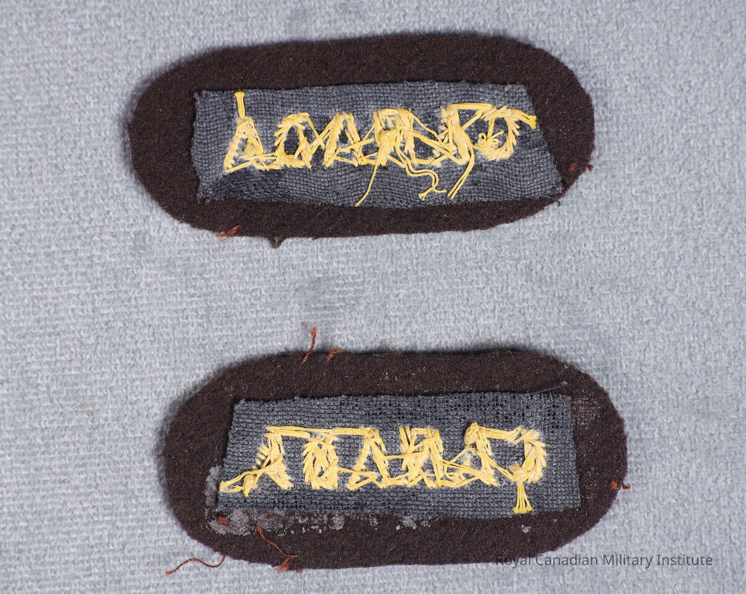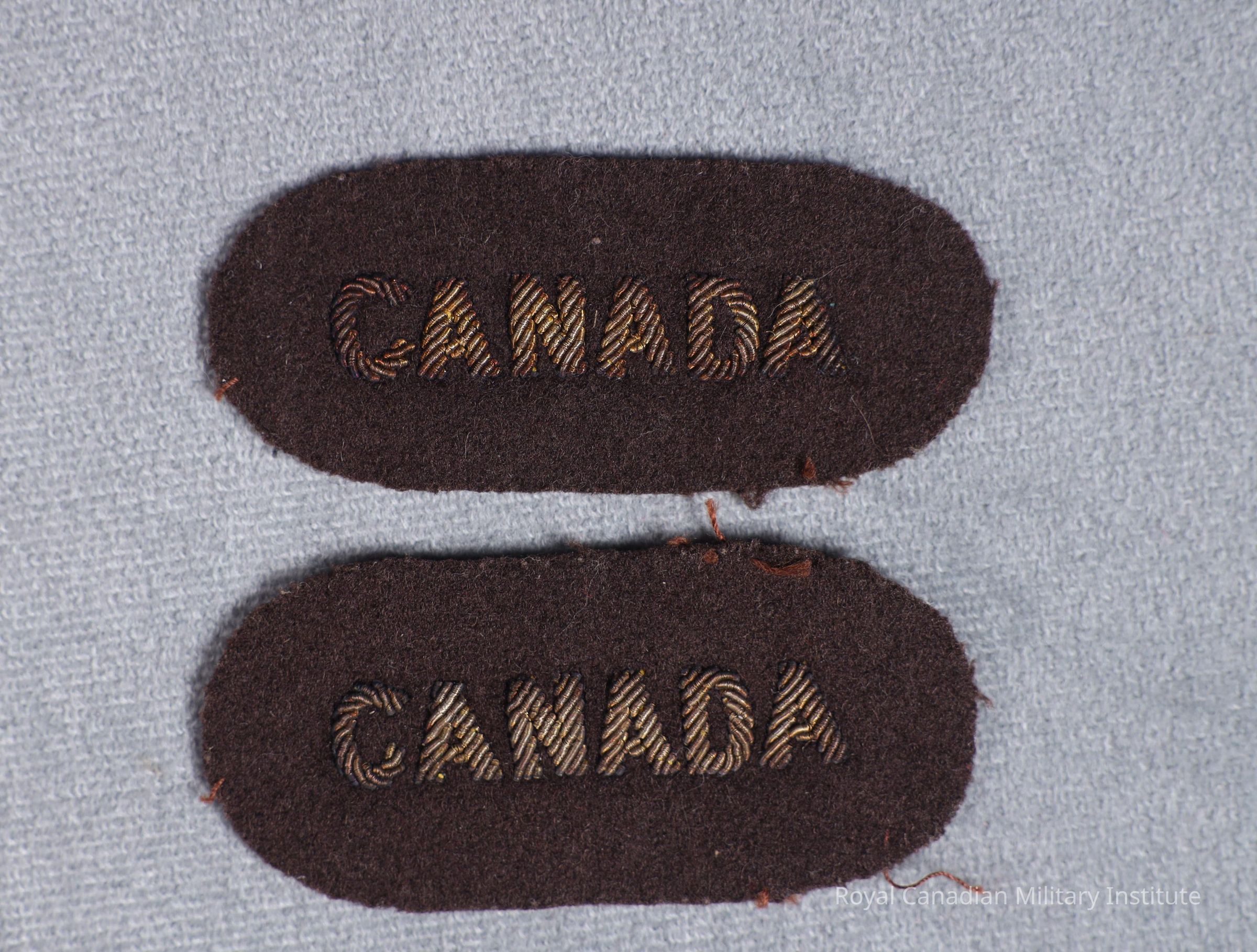 1942-1945 Canadian Women's Army Corps shoulder flash. Oval rectangular brown wool. Machine-stitched title "CANADA" in gold bullion wire 1.1 cm. high. Brown-black cotton mesh backing.Made/Created