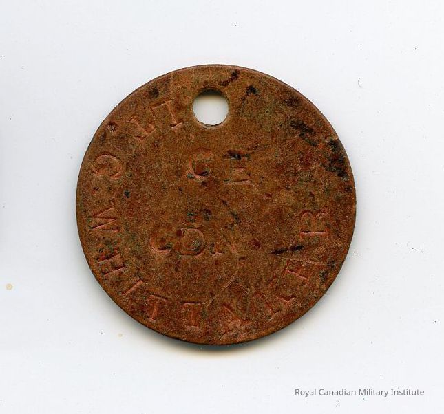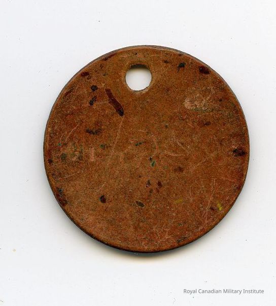 1939-1945 Canadian Army officer's identity disc. Circular, red-brown pressed paper/fiber-board, oiled. One hole at top. Stamped into one side: "CE CDN LT. G. WHITTAKER"