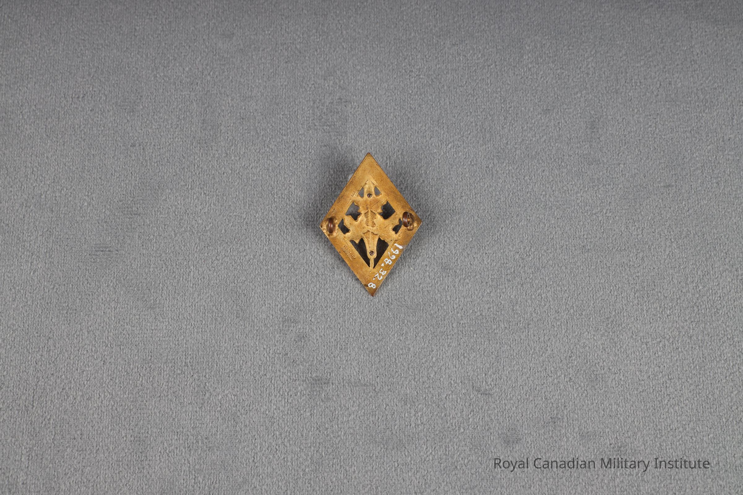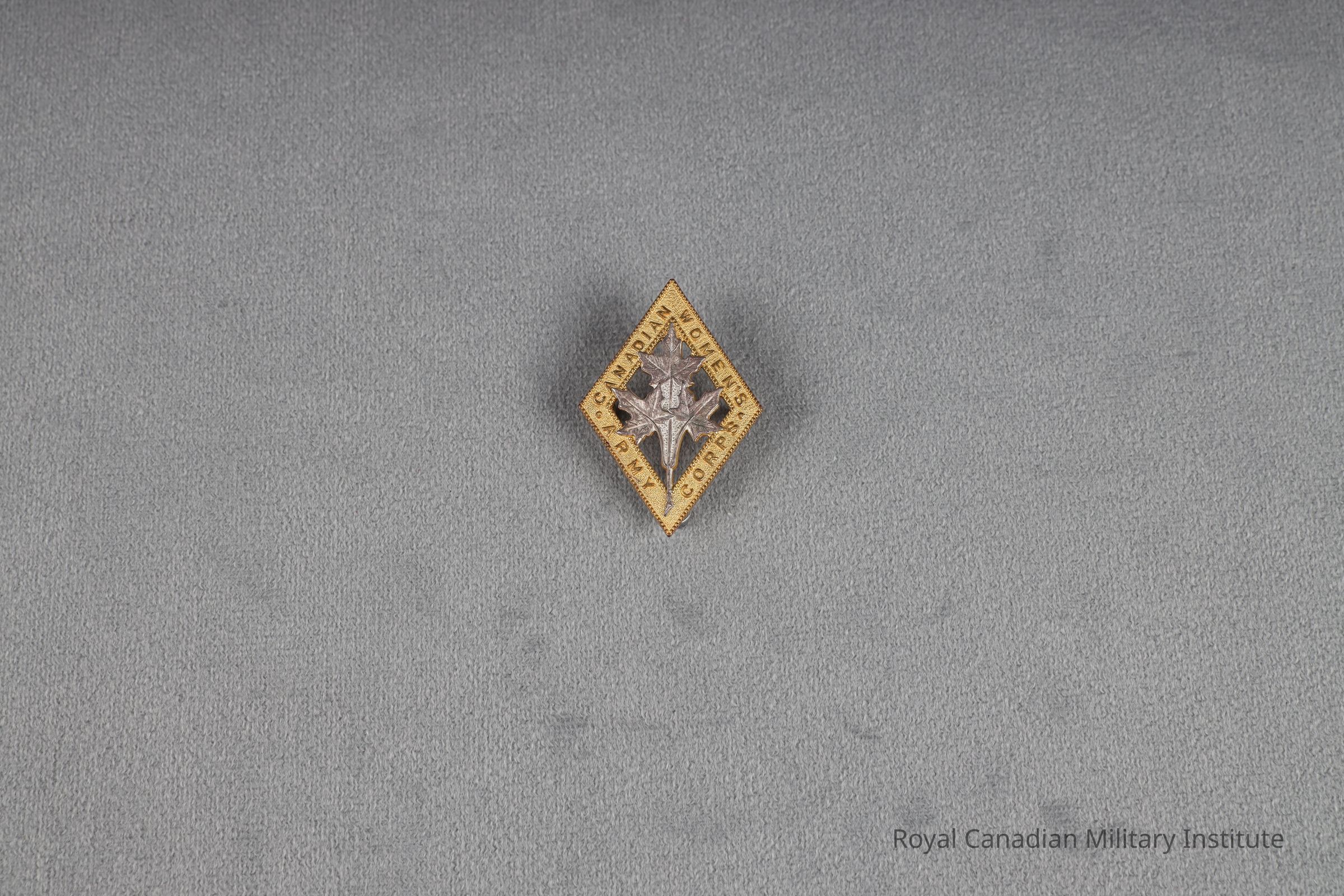 1942-1945 Canadian Women's Army Corps cap badge, officer's. Diamond-shaped frosted gilt metal, open work of shaped title border "Canadian Women's Army Corps" In centre are three silver metal maple leaves. Rear is flat, with two brass lugs.Made/Created