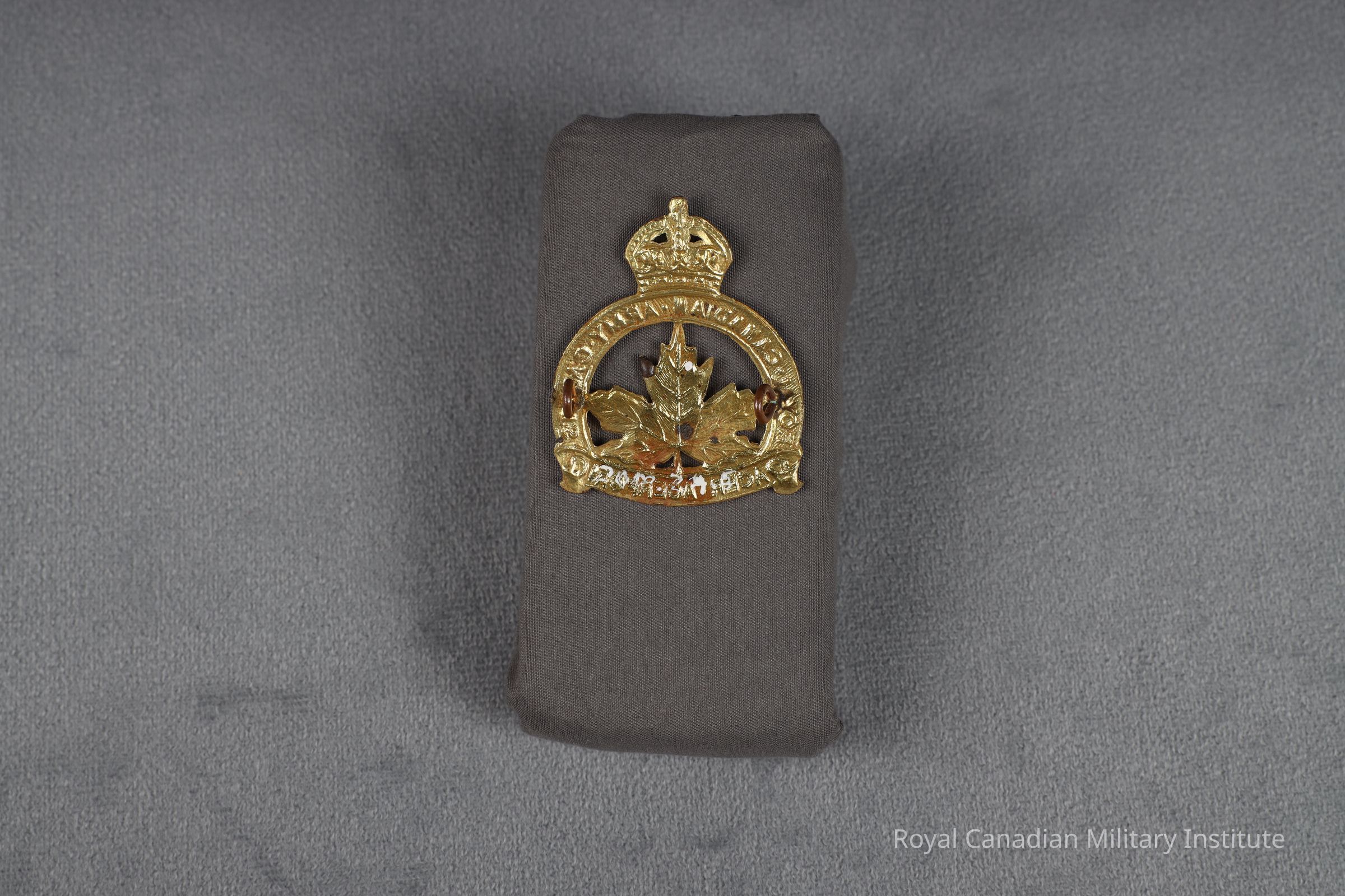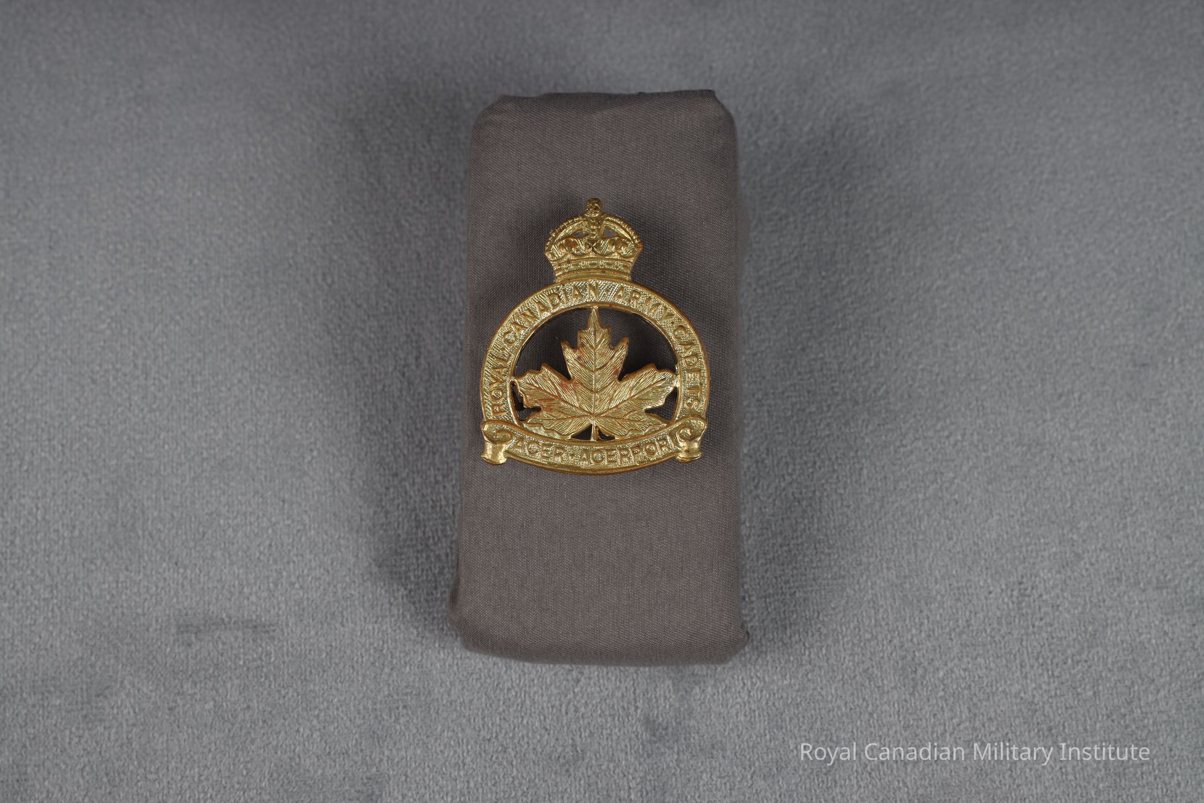 1950's Royal Canadian Army Cadets cap badge. Oval, brass. obverse is King's crown atop arched title "Royal Canadian Army Cadets" In centre, voided, is a maple leaf. At bottom is scrolled title "Acer. Agerpori" Reverse has two cooper lugs.Made/Created