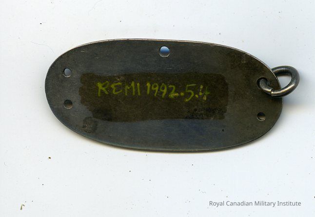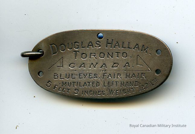 1916-1918 Royal Naval Air Service identity bracelet "Douglas Hallam." Ovoid shape, silver-plated white metal. Four holes, one at each side, one hole in top centre. Stamped on top surface: "Douglas Hallam Toronto Canada Blue Eyes Fair Hair Mutilated Left Hand 5 Feet 9 Inches Weight 127 lbs."Made/Created