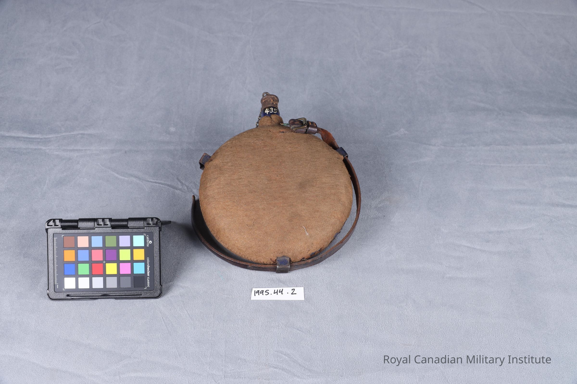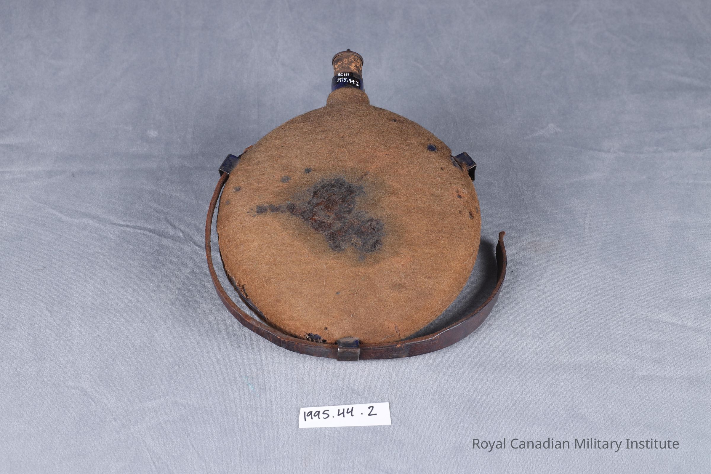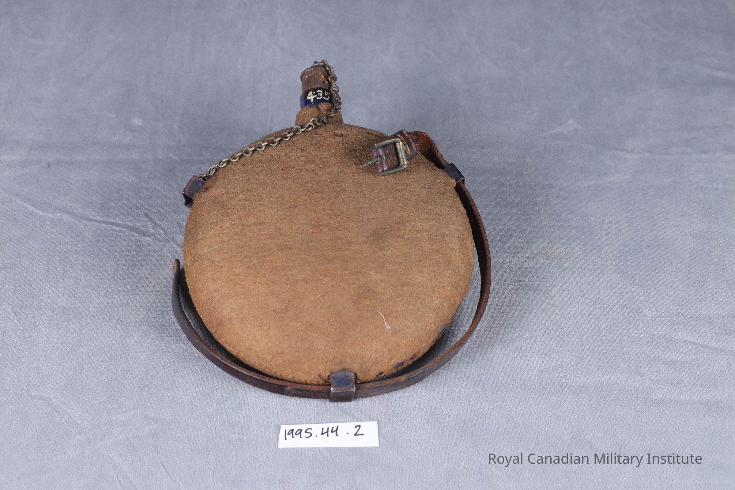 1899-1902 British Army Pattern 1888 web equipment waterbottle. Flat, circular blue-enamelled steel covered with stitched tan felt cover, with steel loops and 49 cm. long brown leather shoulder strap. Waterbottle spout has 2 x 4 cm. cork stopper attached to white metal chain through one steel loop.