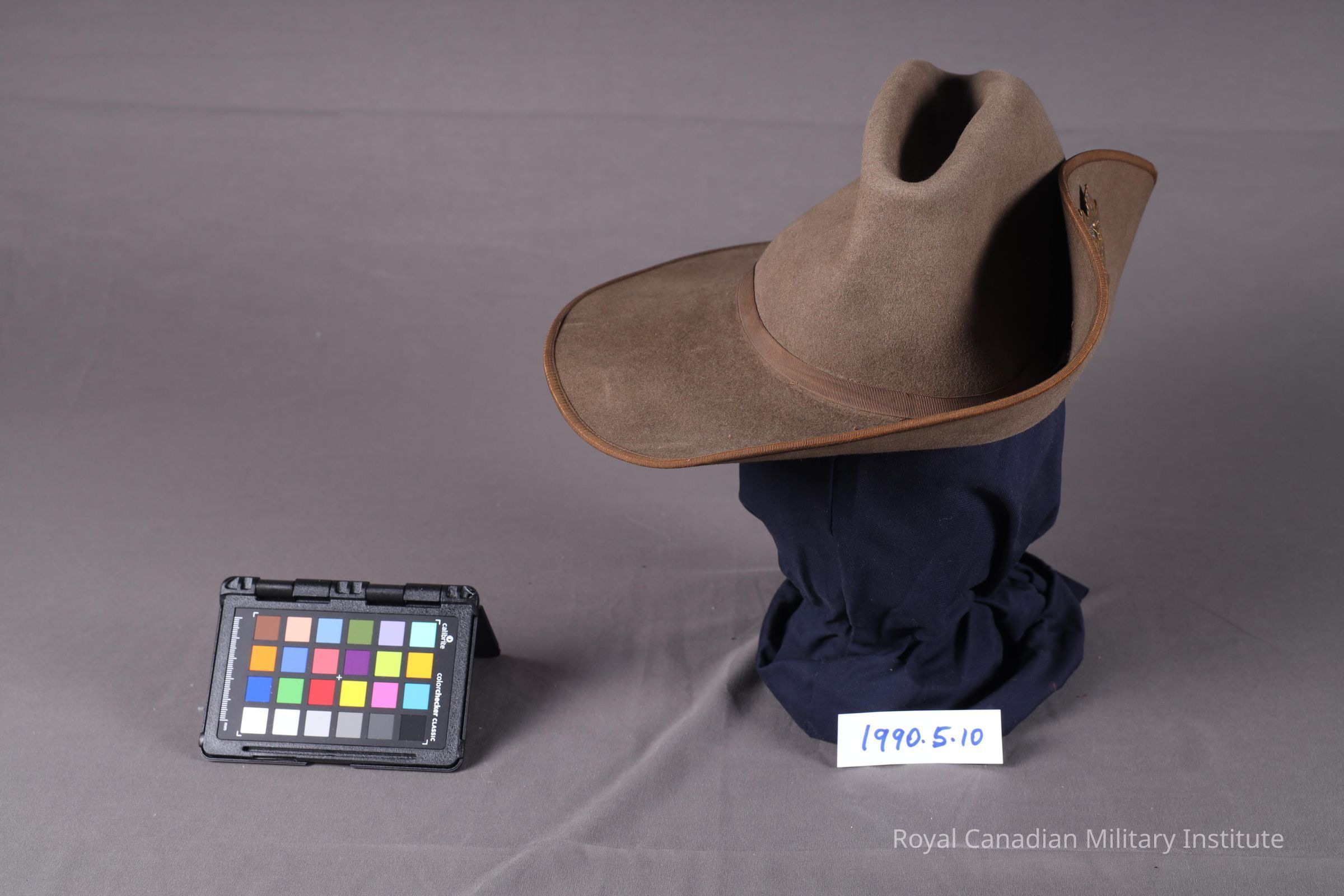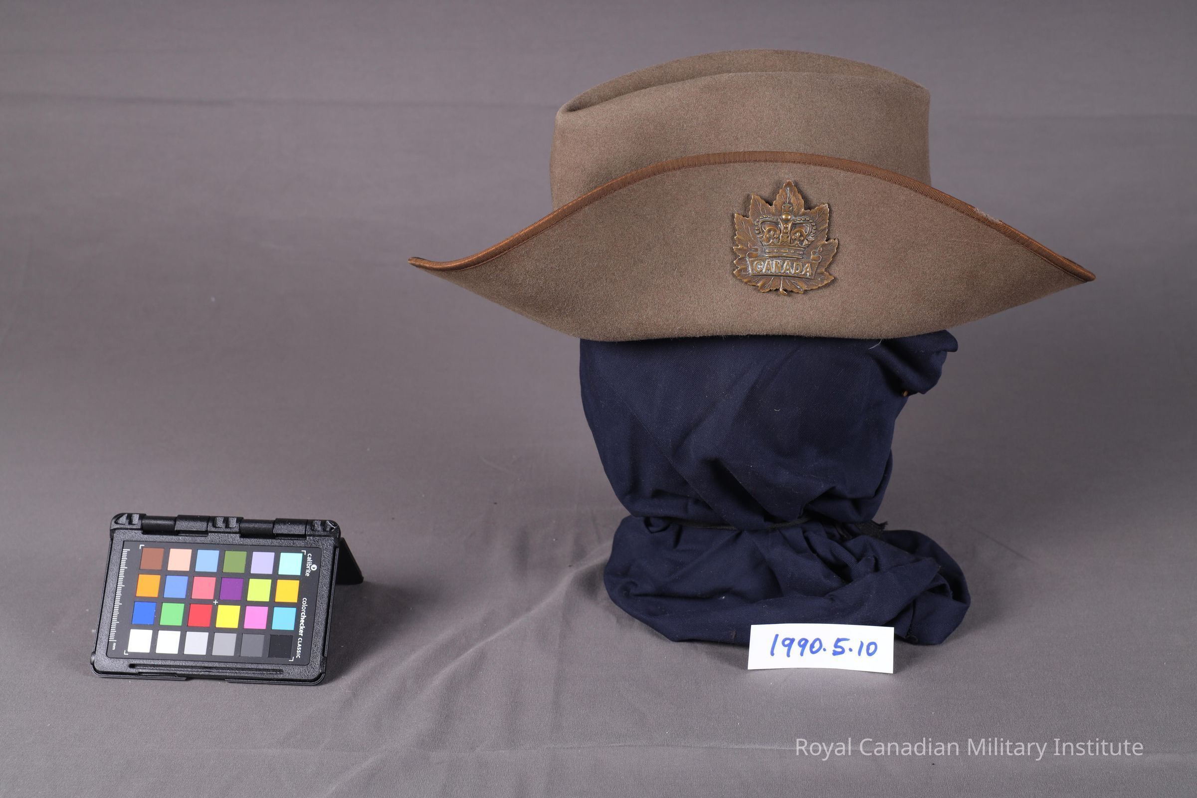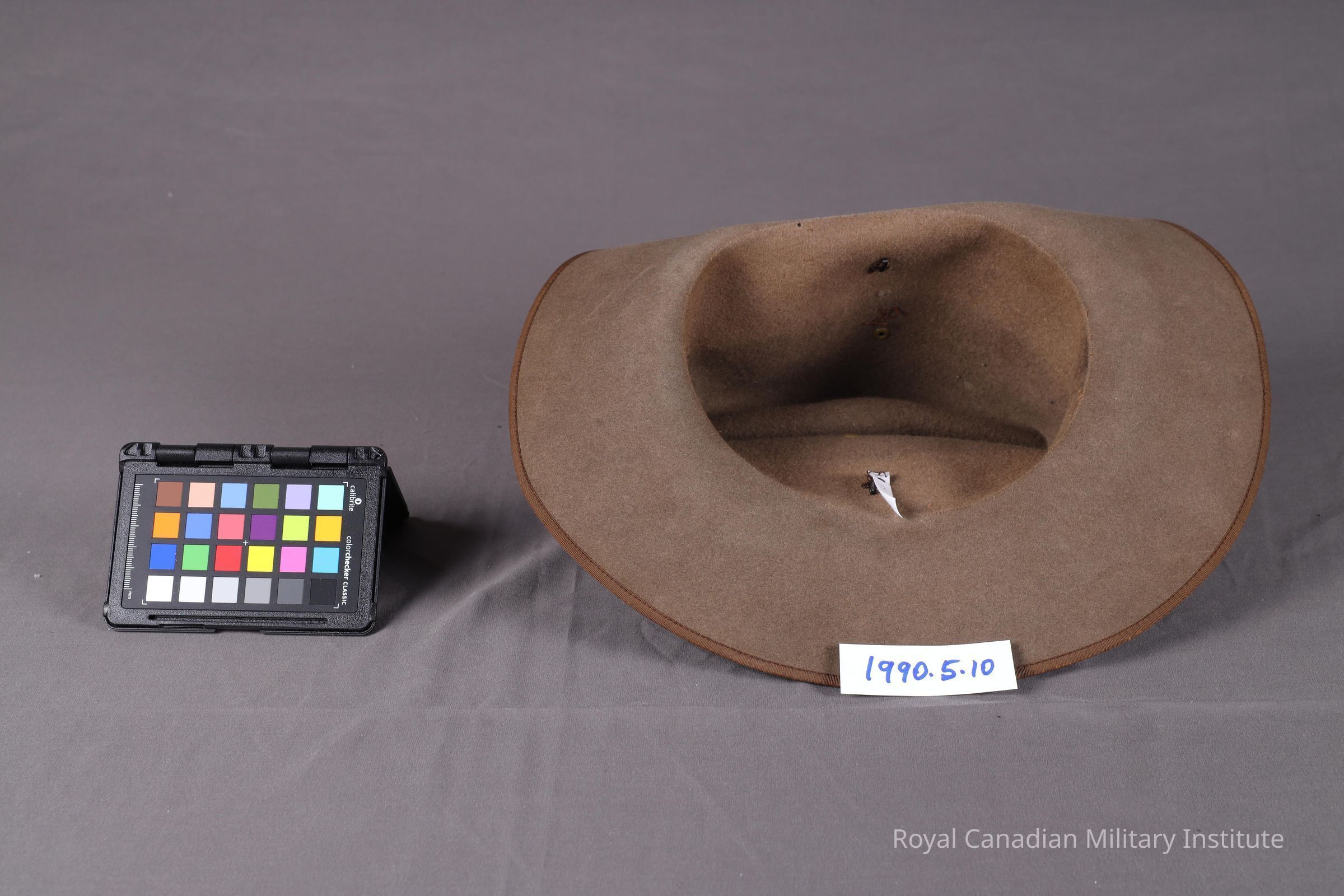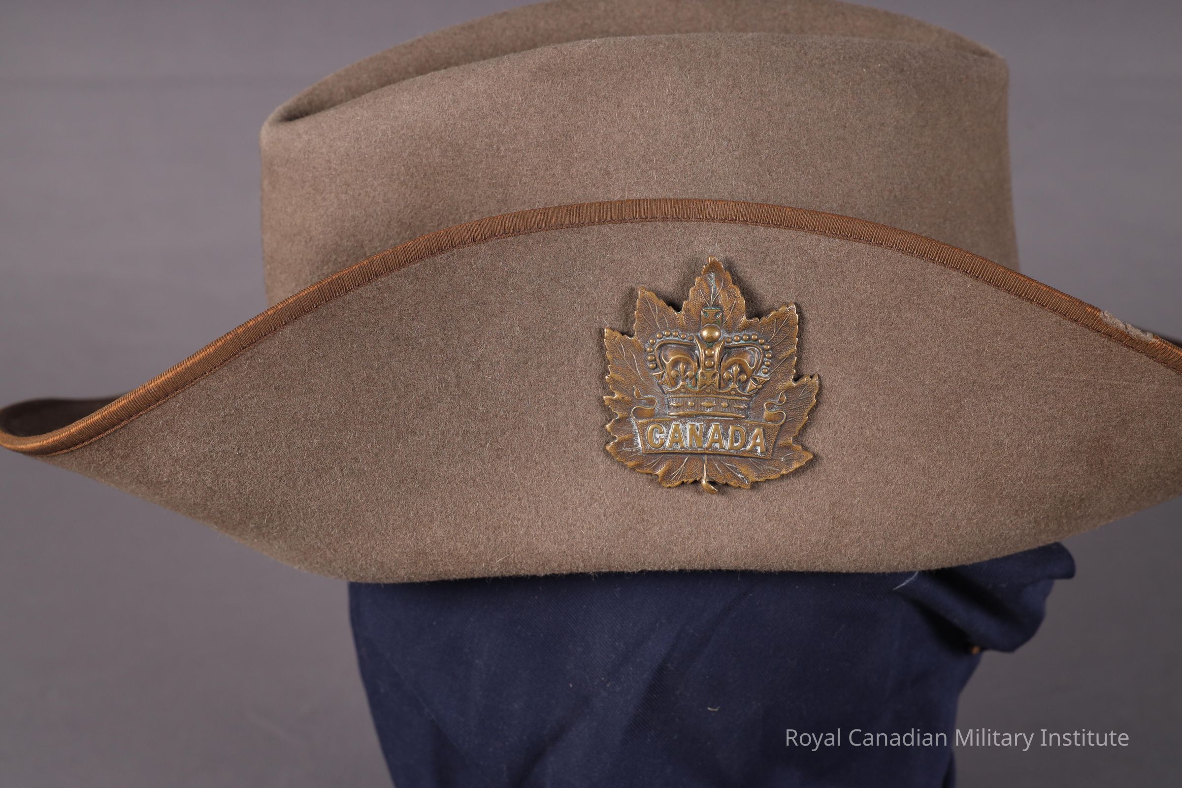 1899-1902 British/Canadian South Africa Field Force slouch hat. Olive drab felt. Circular brim edged with olive drab sateen strip, circular crown with cleft in centre. Around crown is 1.2 cm. wide olive drab sateen hatband. Left brim is upturned: a brass hook stitched into the crown engages with a hole in the brim. Interior (missing sweatband) has two black-painted steel hooks which hold a (missing) chinstrap.Made/Created