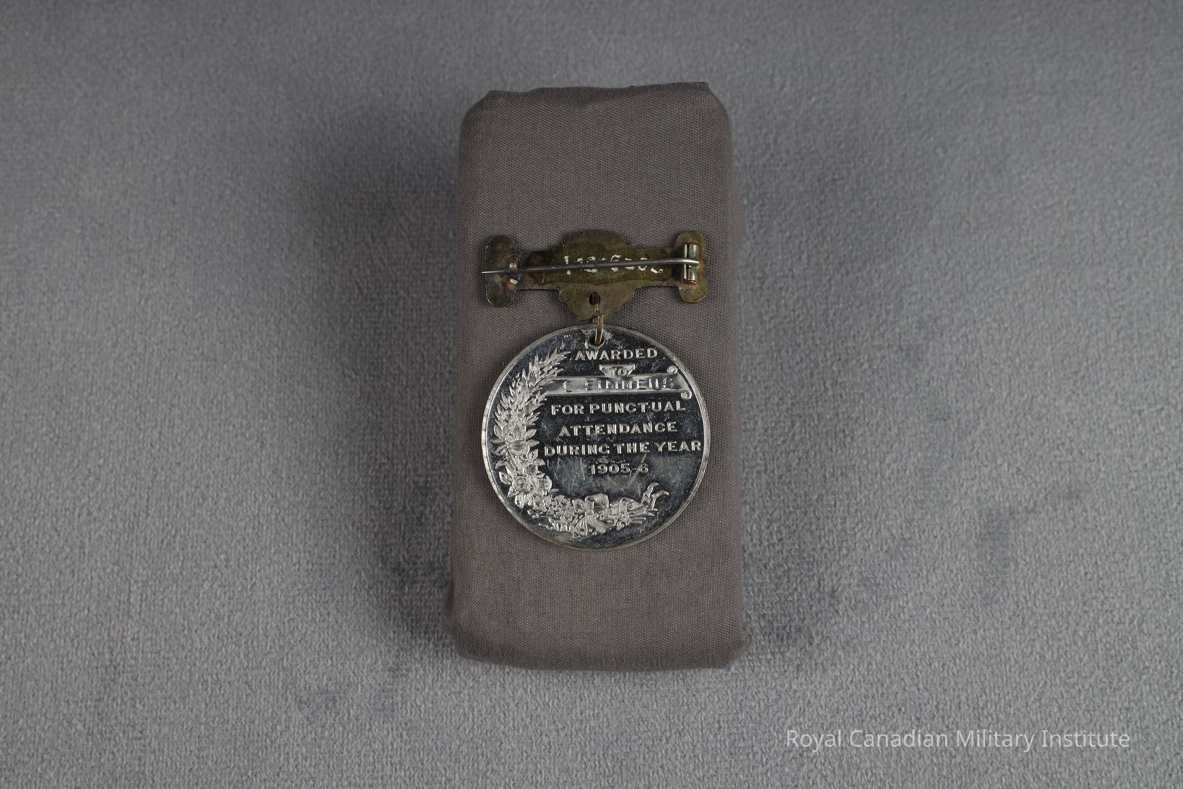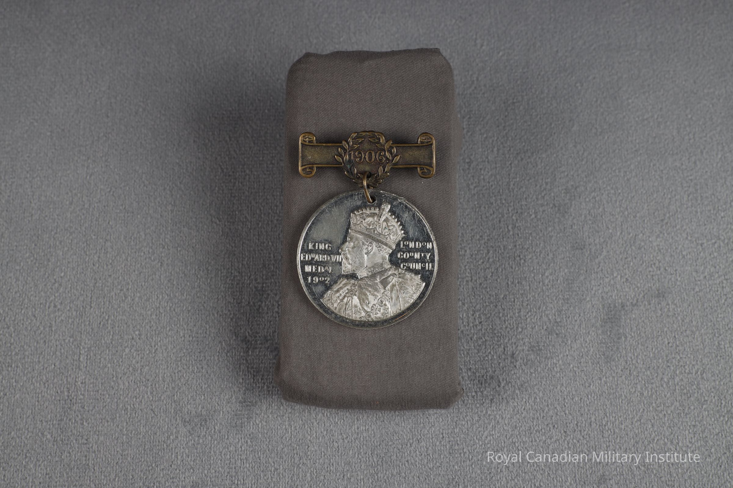 1905-1906 London County Council King Edward VII Medal. Circular, white metal. Obverse crowned bust King Edward VII with title "King Edward VII Medal 1902 London County Council" Reverse a half-wreath of roses with title "Awarded to C.S. Simmens For Punctual Attendance During the Year 1905-6." Suspension of rectangular pin-backed brass bar with wreathed date "1906" in centre. Suspension is 1.5 x 3.7 cms.Made/Created