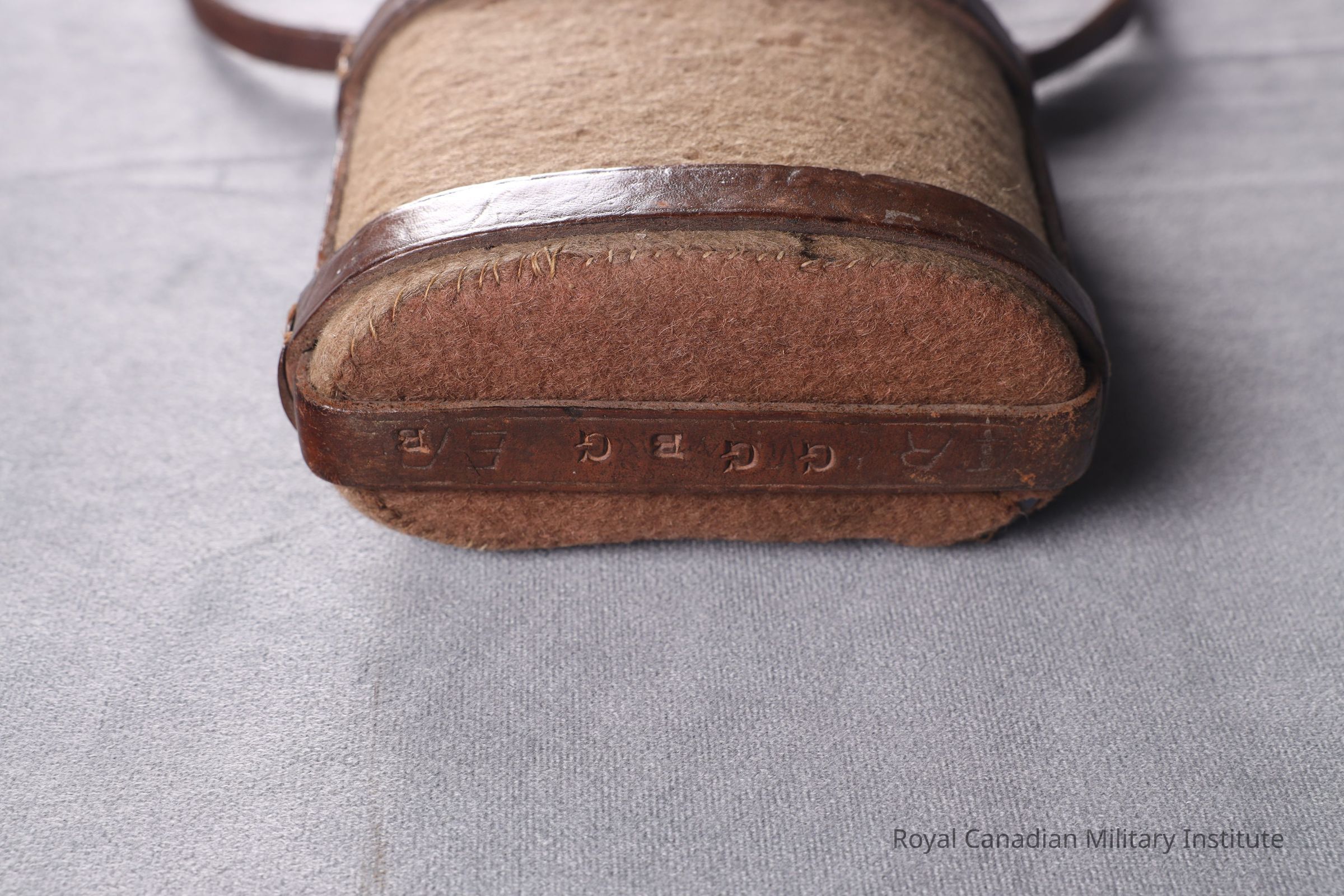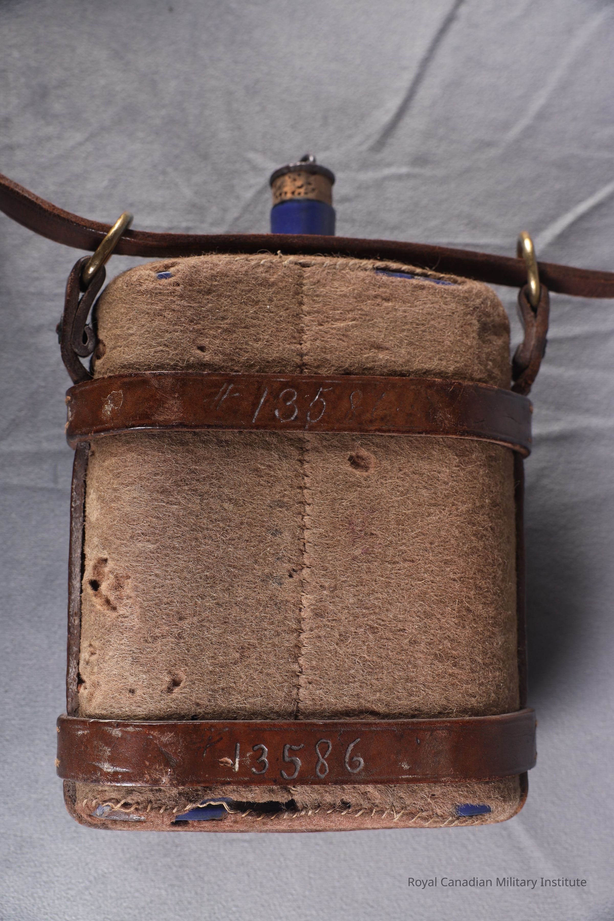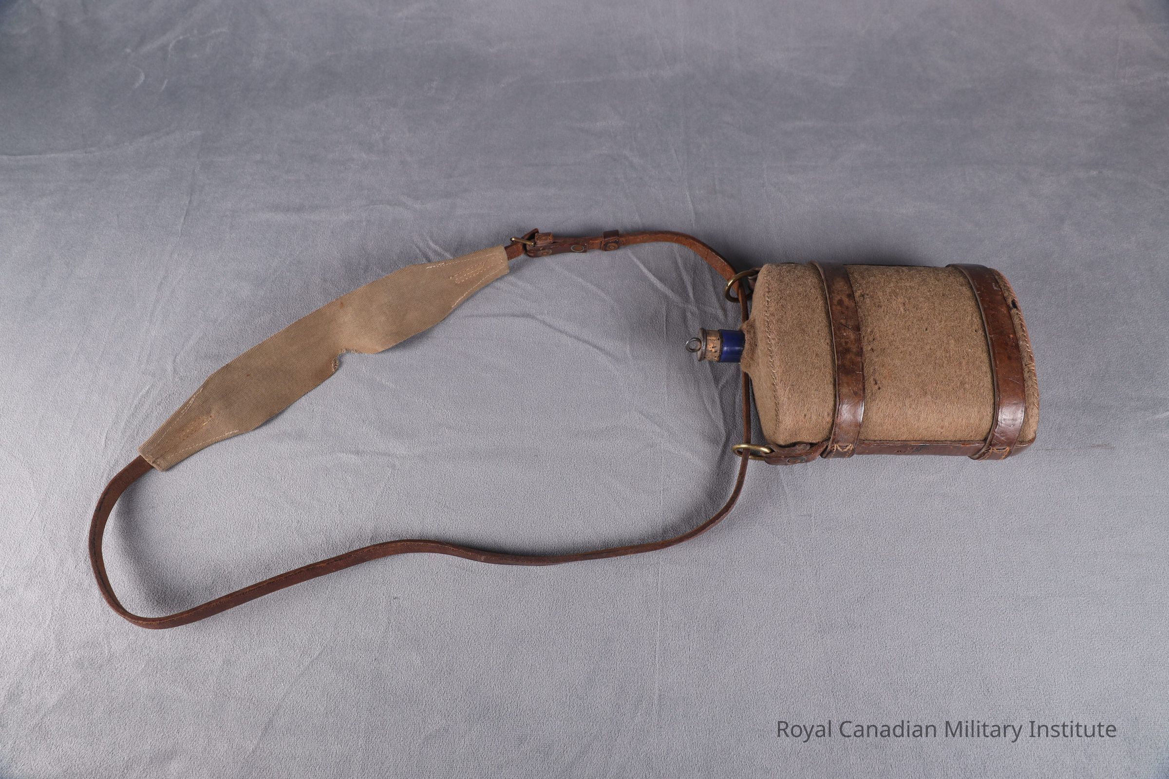 1903 Canadian Militia Oliver Pattern waterbottle w/sling. The flat, cylindrically shaped waterbottle is made of blue enamel steel with a khaki wool stitched three-piece cover. The harness is a U-shaped three-piece leather with rivetted loops with a brass ring at the top. The adjustable shoulder strap (126 cm long x 1.5 cm wide) is made of brown leather and is sewn to a grey-green cotton canvas (5 cm x 31 cm) shoulder band. A tapered, cylindrical cork stopper sheet steel cap and ring (5.5 cm high x 2.5 diameter) is missing the string.