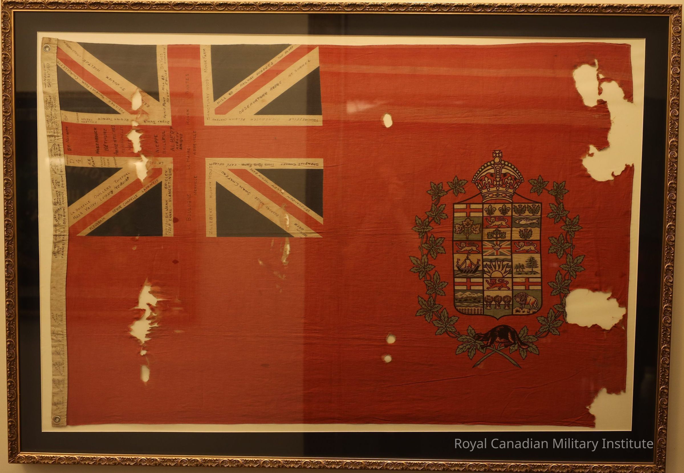 1914-1918 Canadian Ensign national flag. Rectangular, red linen. British Union flag with nine Canadian Provincial crests wreathed and crowned, topped by a crouching beaver, this in lower right corner. Signed with names of 90 French and Belgian towns and battlesites (in black ink).