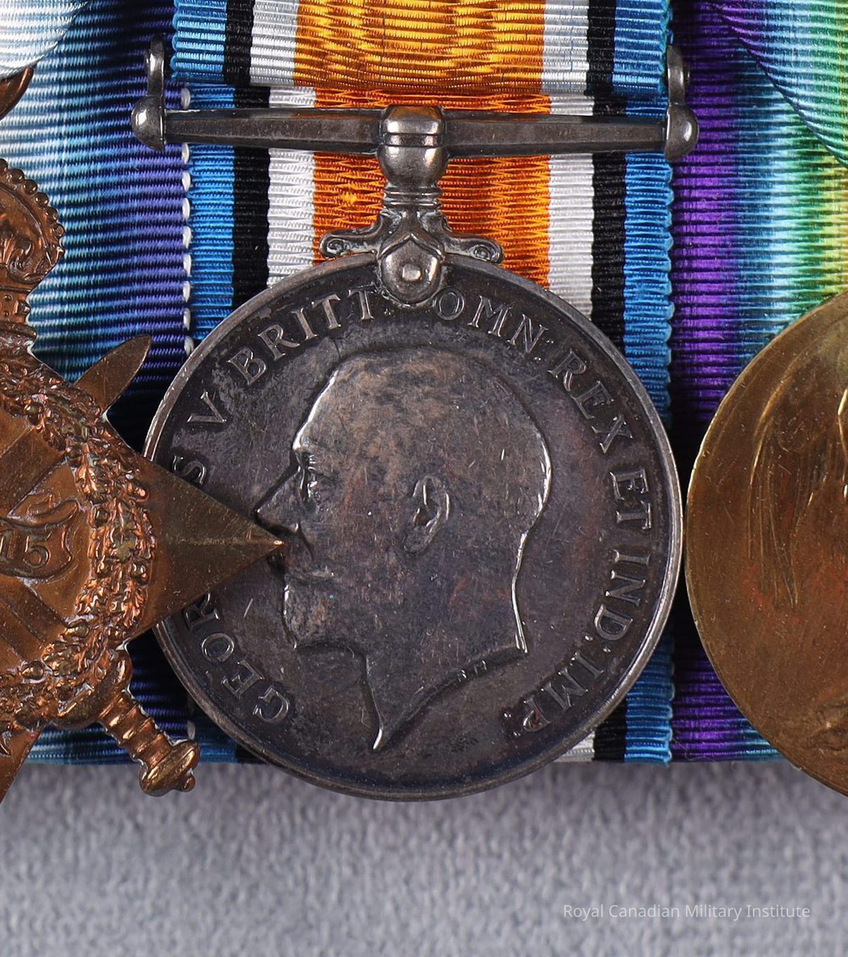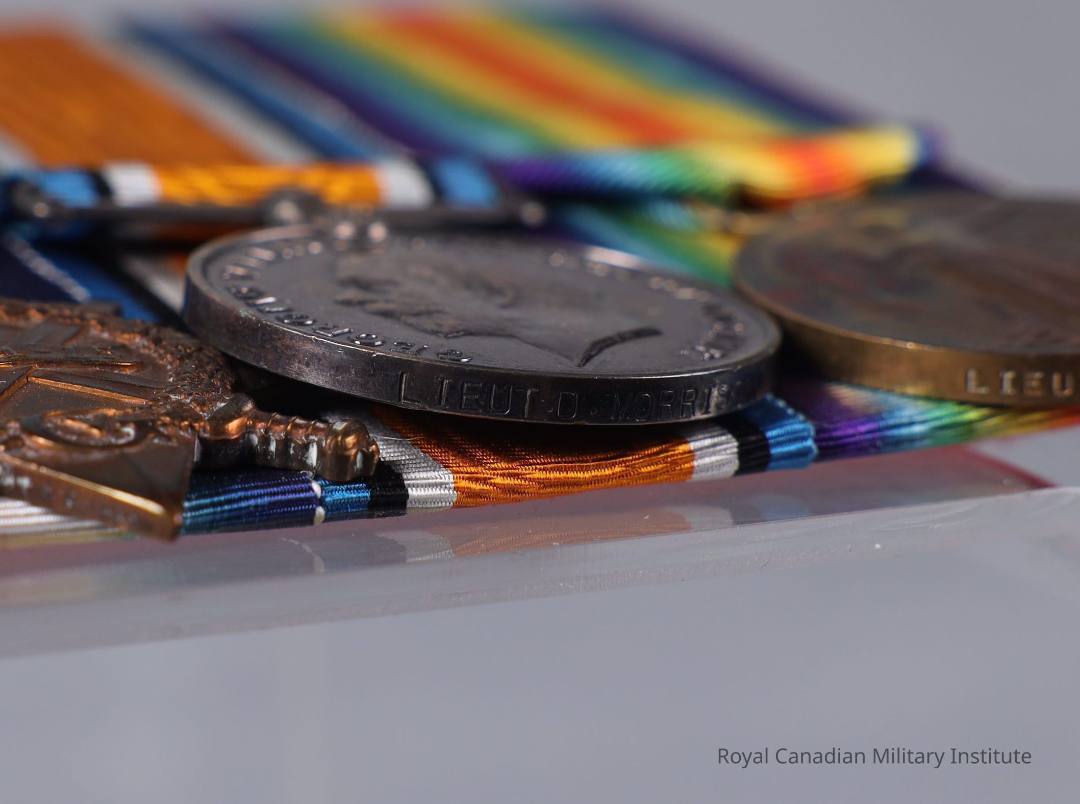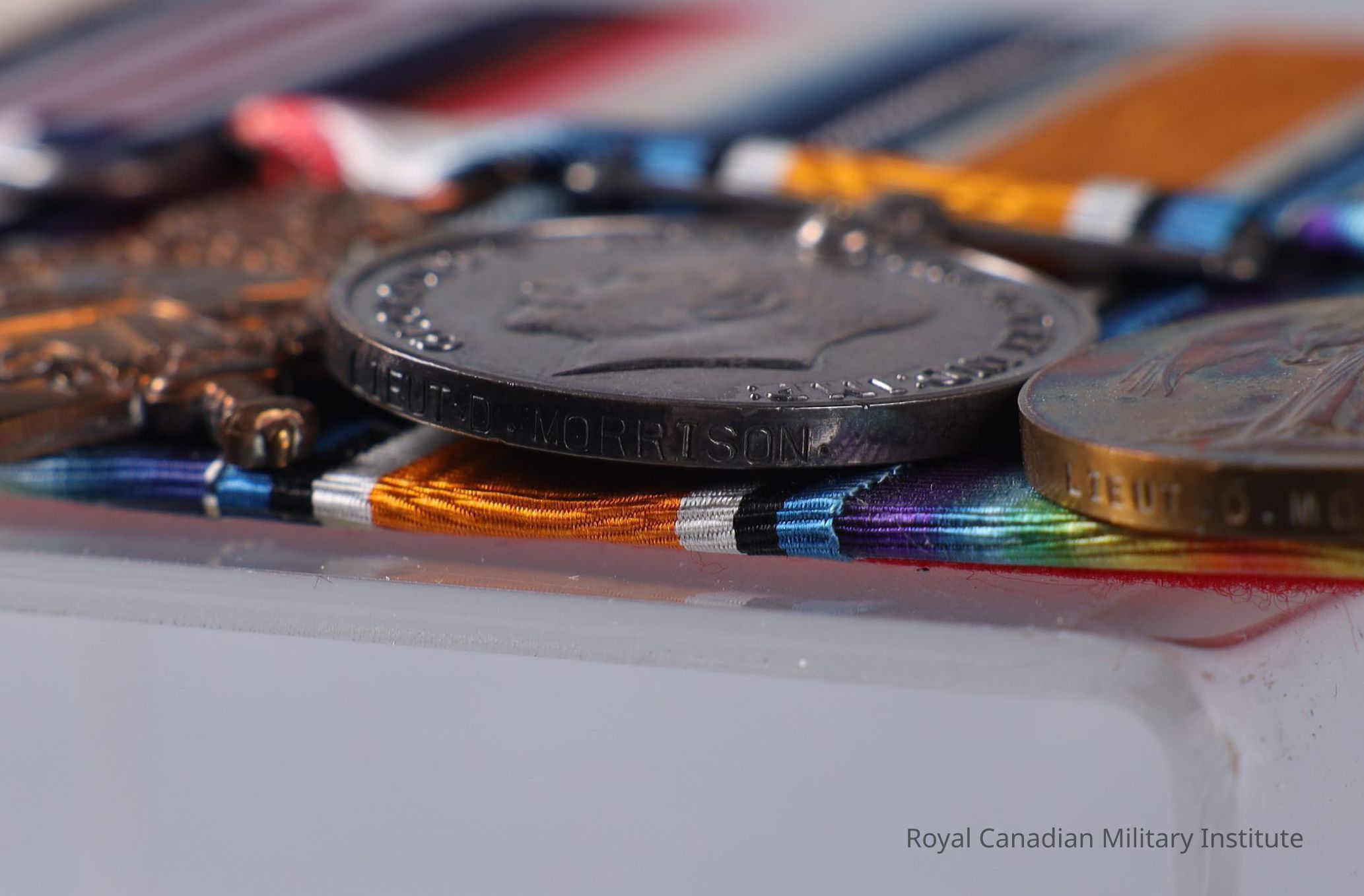 1914-1920 British War Medal, to LIEUT.MORRISON. The obverse shows the left side profile of King George V, surrounded by the words "GEORGIVS V BRITT: OMN: REX ET IND: IMP:" (George V, King of all the British Isles and Emperor of India).The reverse shows Saint George on horseback and armed with a short sword fighting the Prussian eagle, featuring the years 1914 and 1918. The ribbon consists of the following colours from left to right: blue, black, white, orange, white, black, blue. This medal was awarded to Lieut. David Morrison. His name is inscribed on the medal rim.