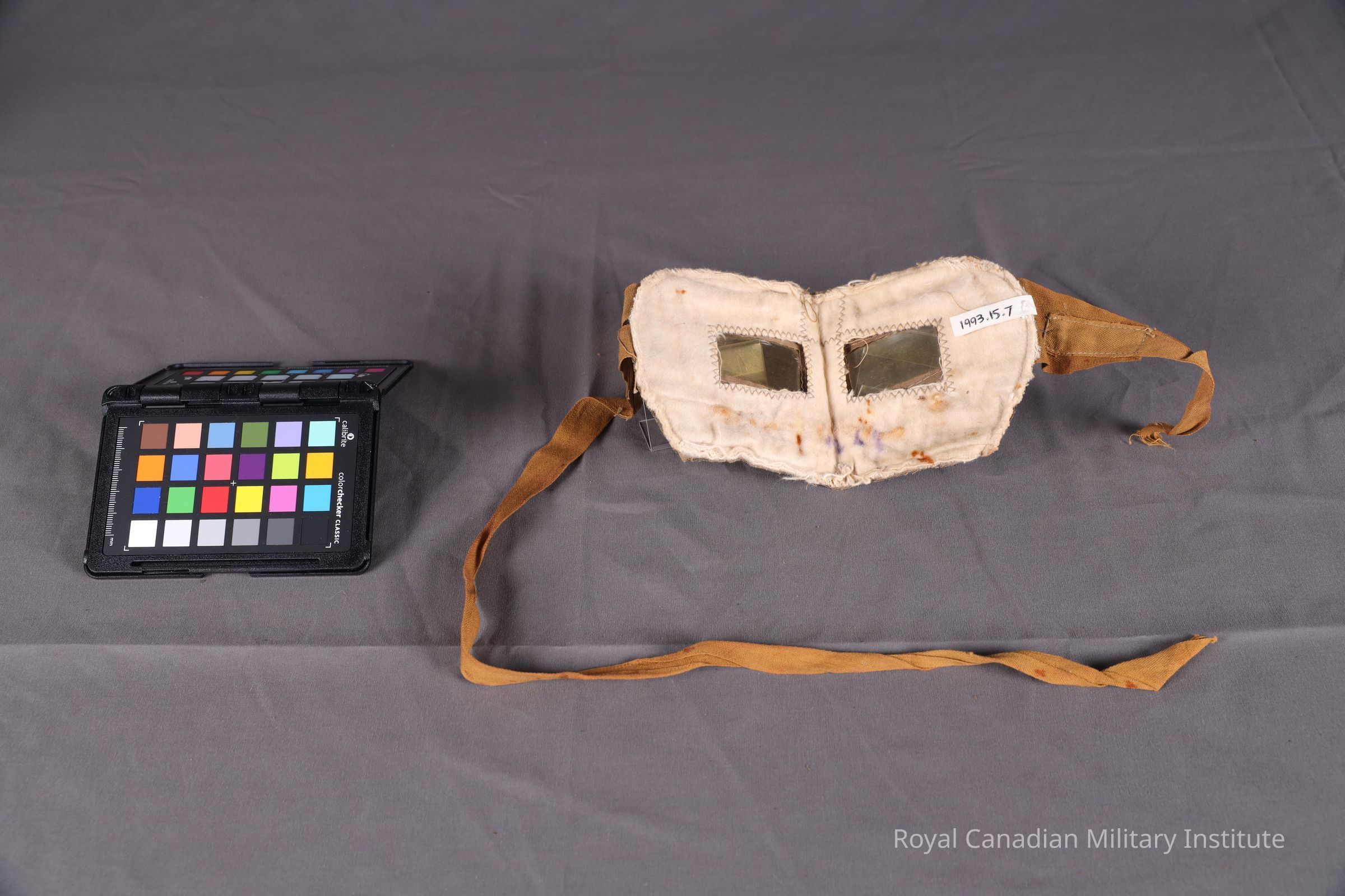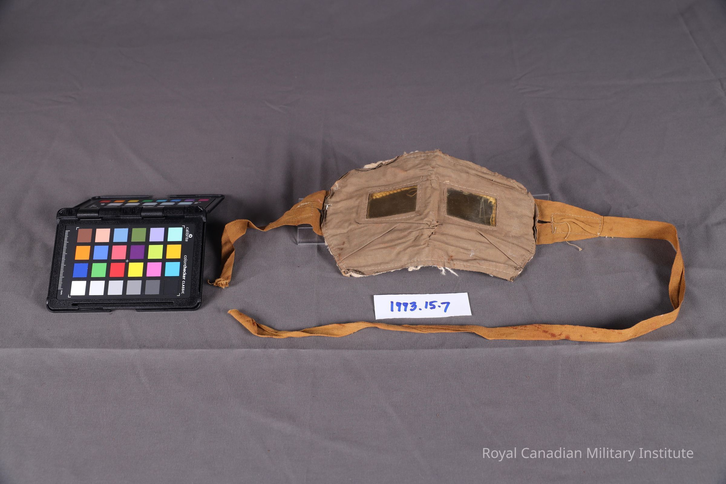 1916--1918 Canadian Expeditionary Force (CEF) anti-tear gas goggles. Rectangular khaki cotton or linen eye-mask cut with two 2.5x4.5cm eye holes. Backing of white felt. Eye holes lined with clear celluloid. Stitched to edges are two tan linen tie tapes, 1.8 cm wide, one 14 cm, one 57cm long.