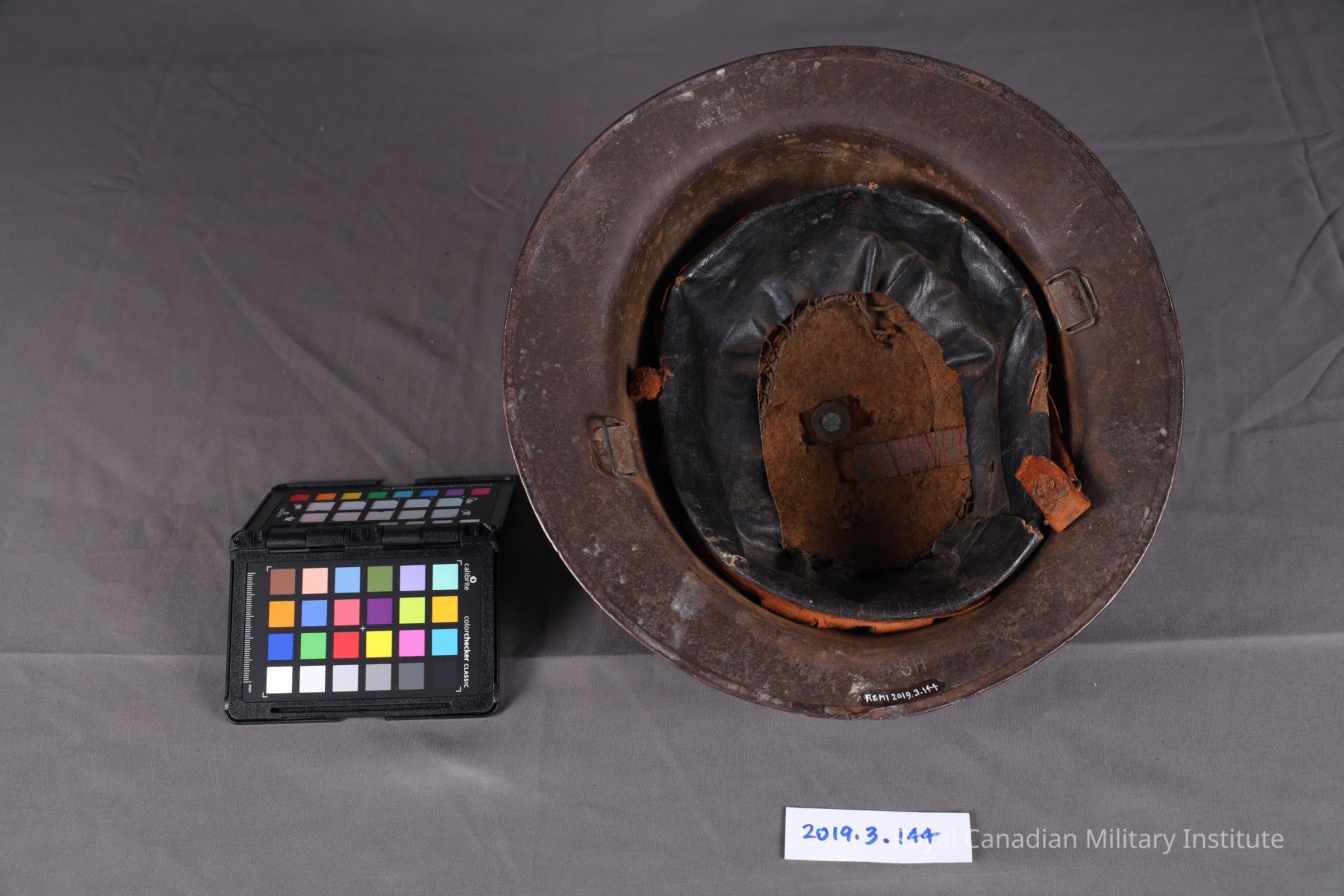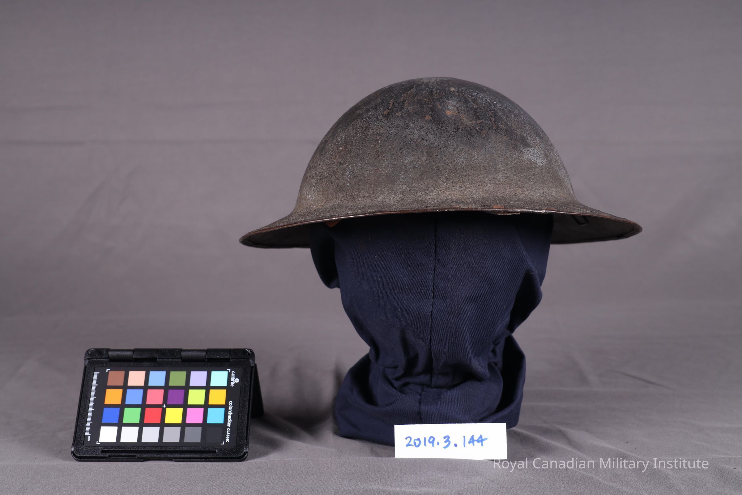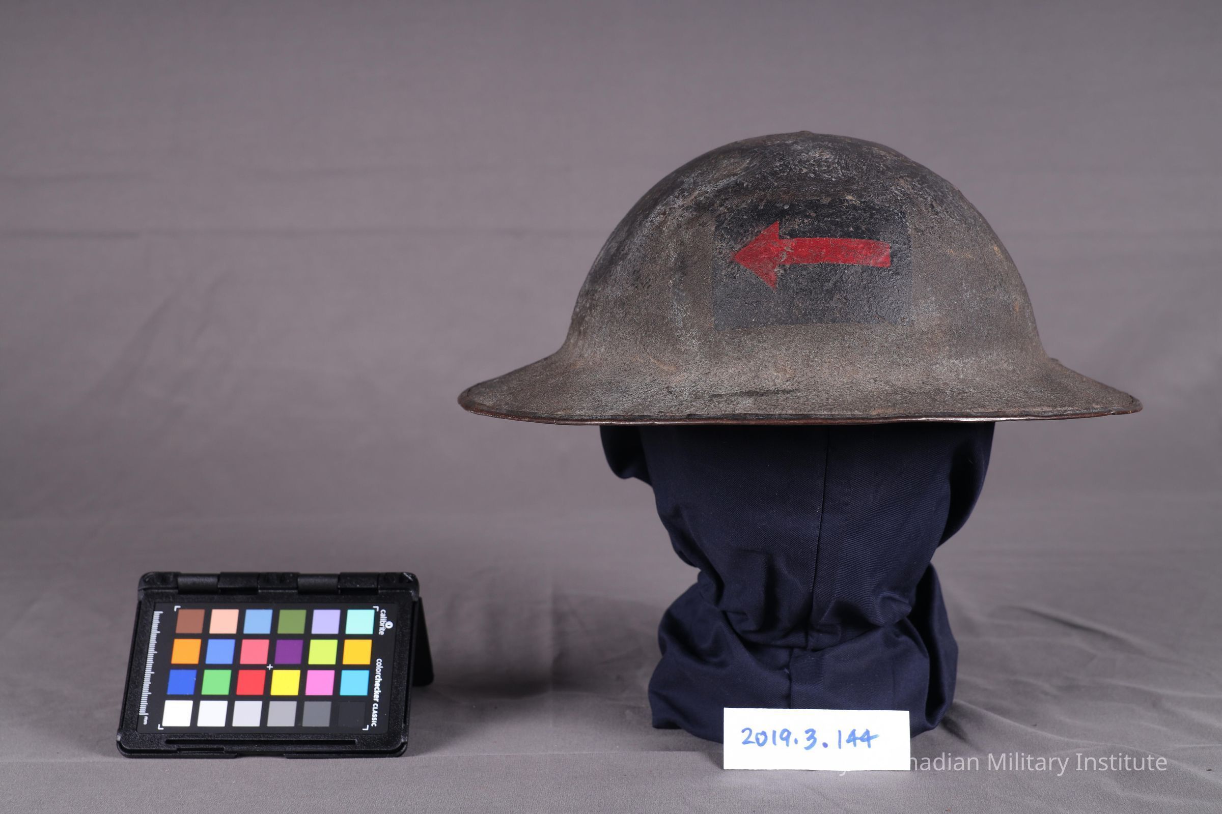 1917-1918 Canadian Machine-Gun Corps type 2 Brodie helmet. Circular basin shape, manganese steel. Dark green paint with sandy finish. 60% of paint remains. Small dent on top, back and crack on back rim. CMGC insignia is 8 cm x 5.5 cm dark blue rectangle with red arrow pointing left. Black oilskin liner in poor condition, loose in helmet. Leather strap missing.Use