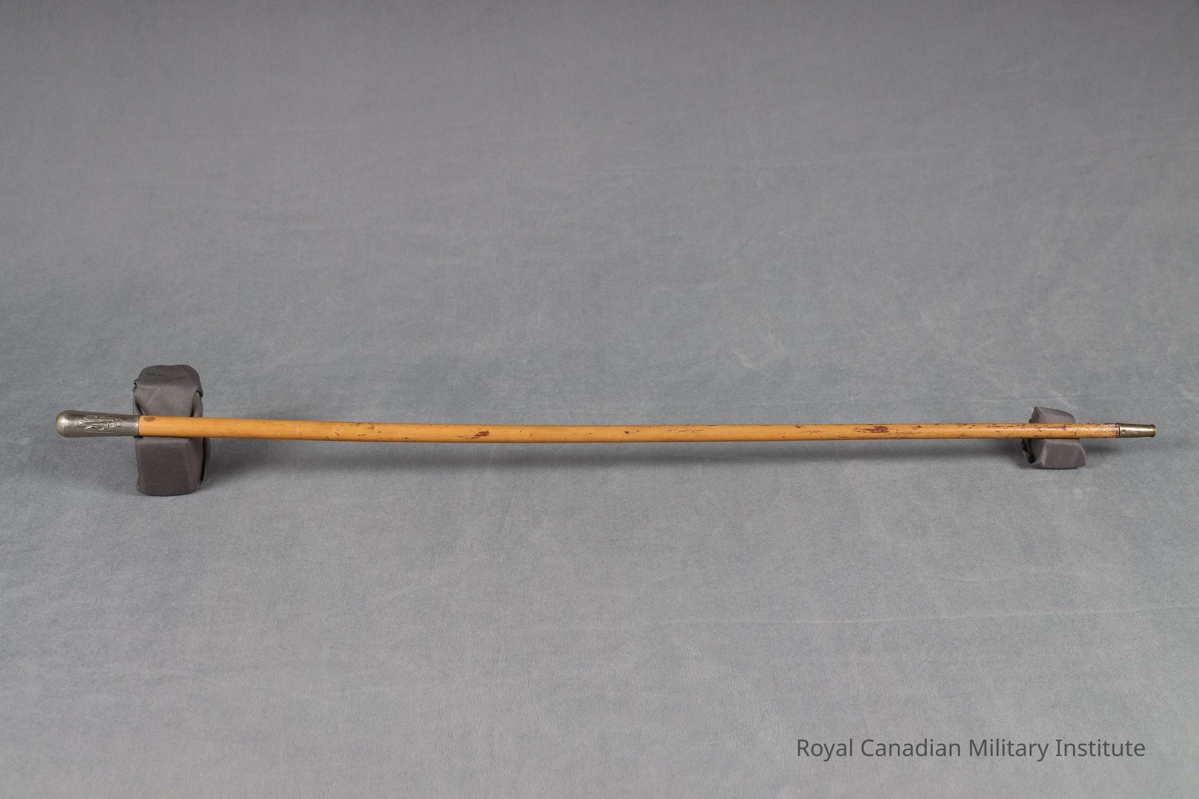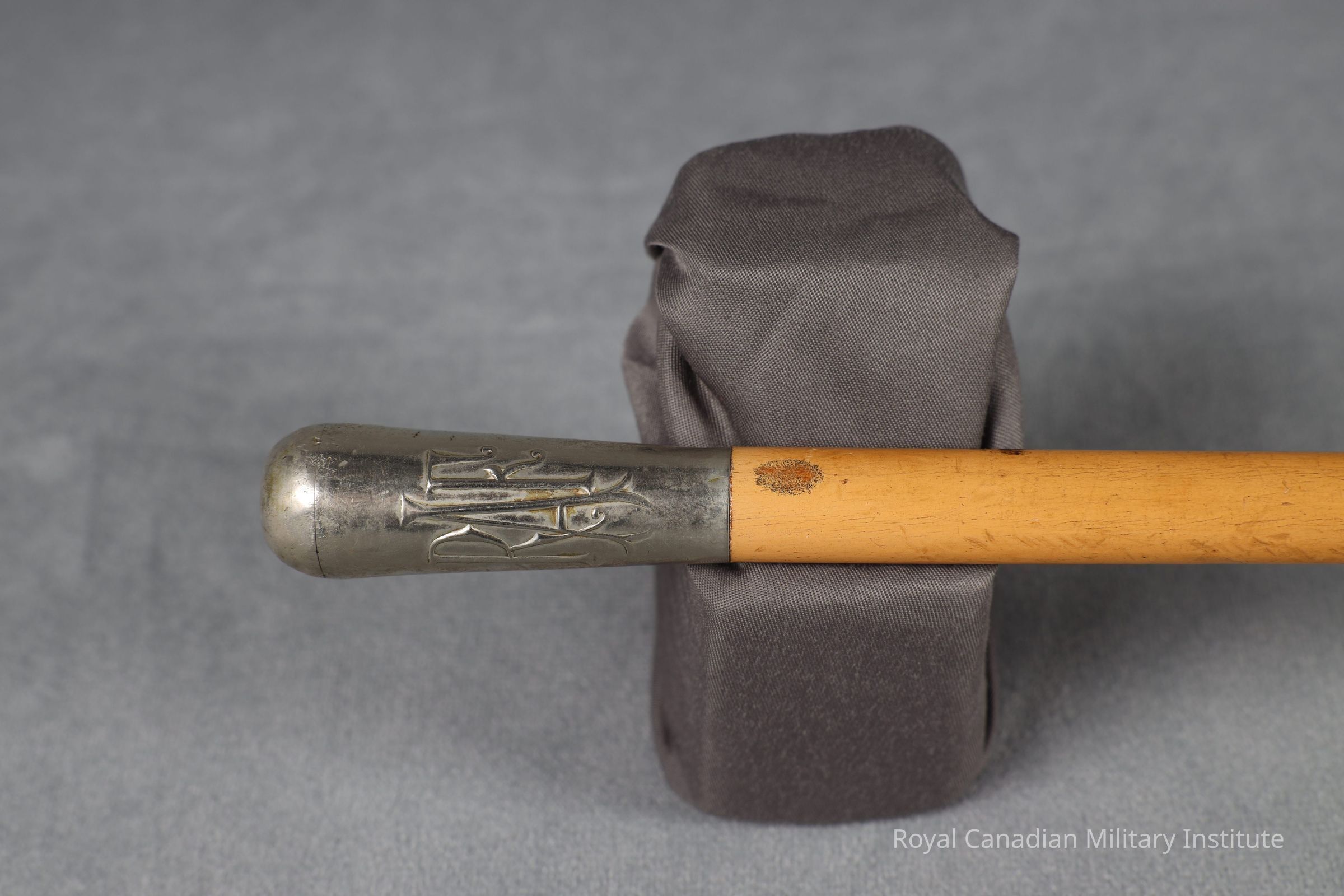 1918 Royal Flying Corps Officer's stick. Cylindrical honey-coloured painted hardwood. Tapered 2.5 cm. long brass ferrule tip nailed into small end. At large end is fitted (hammered and brased) a 6.5 cm. long bulbous white metal knob with stylized monogramed letters in relief: "RAF."