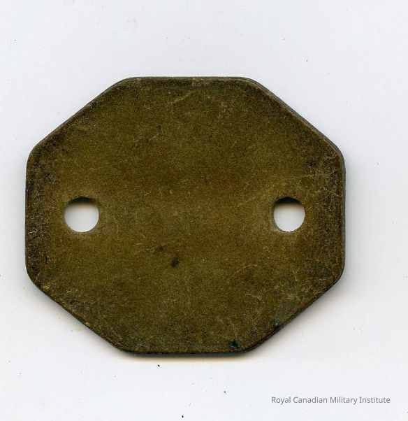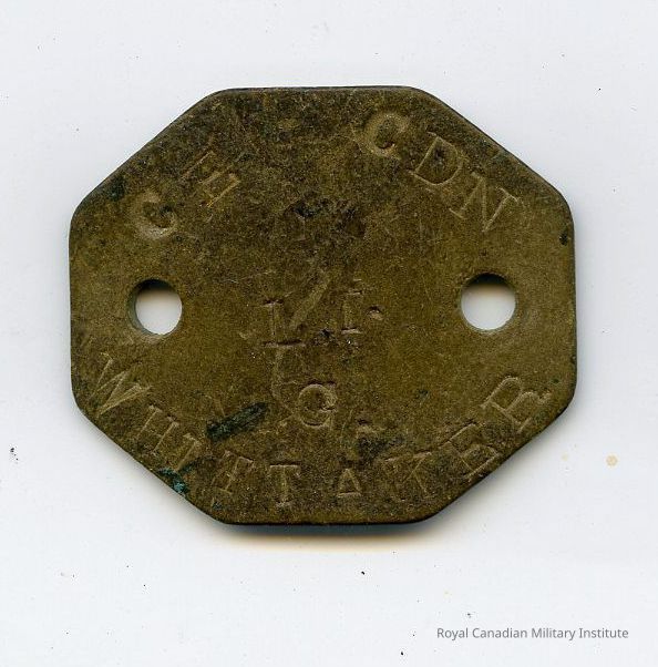 1939-1945 Canadian Army officer's identity disc.Khaki green octagonal paper/pressed fiber-board. Oiled. Holes at two ends. Stamped into one side: "CE CDN LT G WHITTAKER"