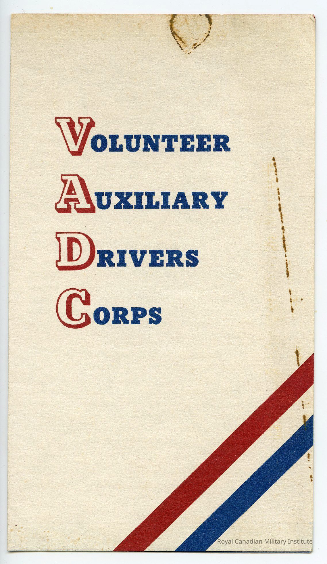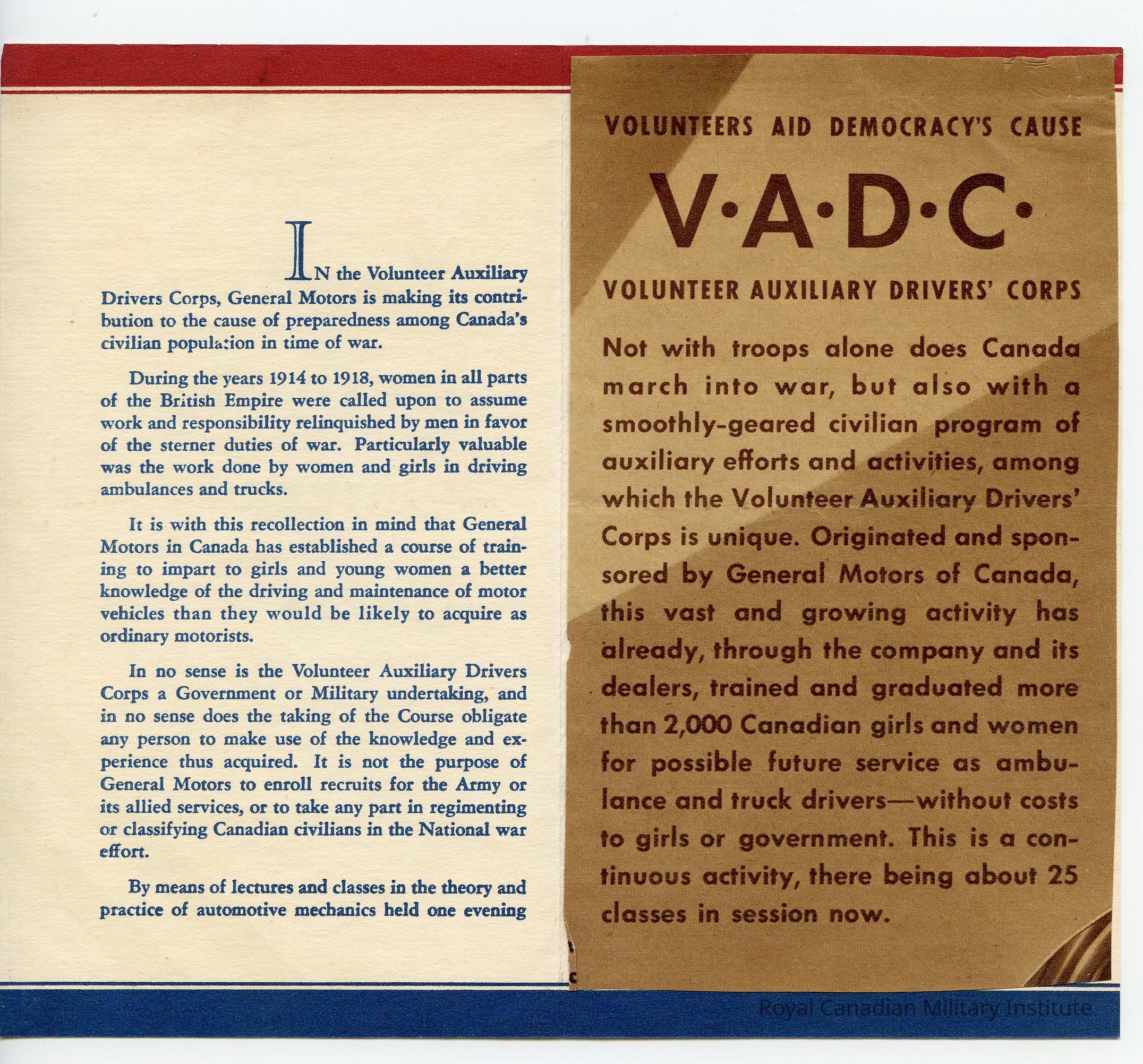 Canadian Volunteer Auxiliary Drivers' Corps Pamphlet, produced by General Motors. The VADC was a volunteer initiative not organised by DND or the government. This pamphlet advertises the VADC and announces that the GM program has trained more than 2,000 women as potential ambulance or truck drivers, with 25 classes in session currently. The pamphlet explains that during WWI women were called upon to volunteer for many different tasks. This inspired GM to create the VADC program, in anticipation of the need for women volunteers during WWII.
