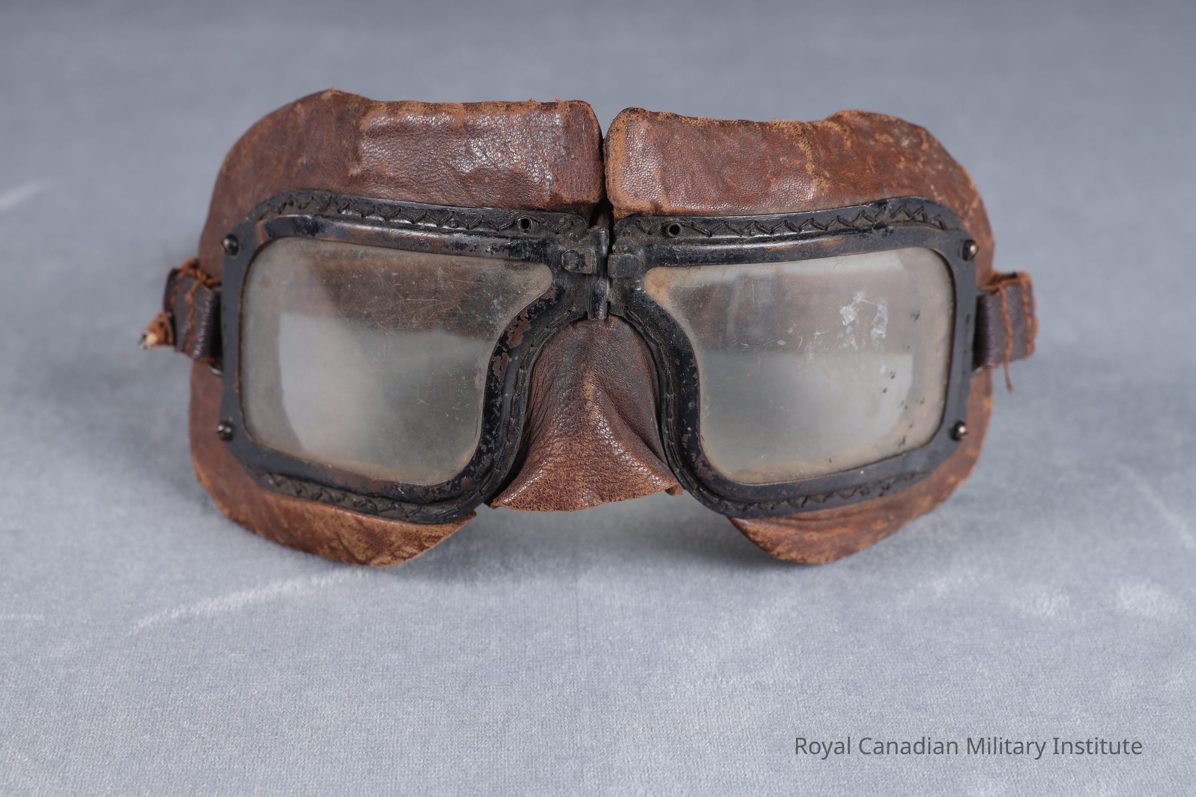 1940 Royal Canadian Air Force Mark III flying goggles. Two 6 x 9 cm. glass lenses set into hinged, black-painted brass frame, screwed and sewn to a padded brown leather liner. inner edge of lenses lined with grey-green chamois leather. Centre triangular nose piece. Stitched to black-painted metal loop on each side is an adjustable strap of brown cotton/steel springs/brown leather: 1.9 x 49 cms.Made/Created
