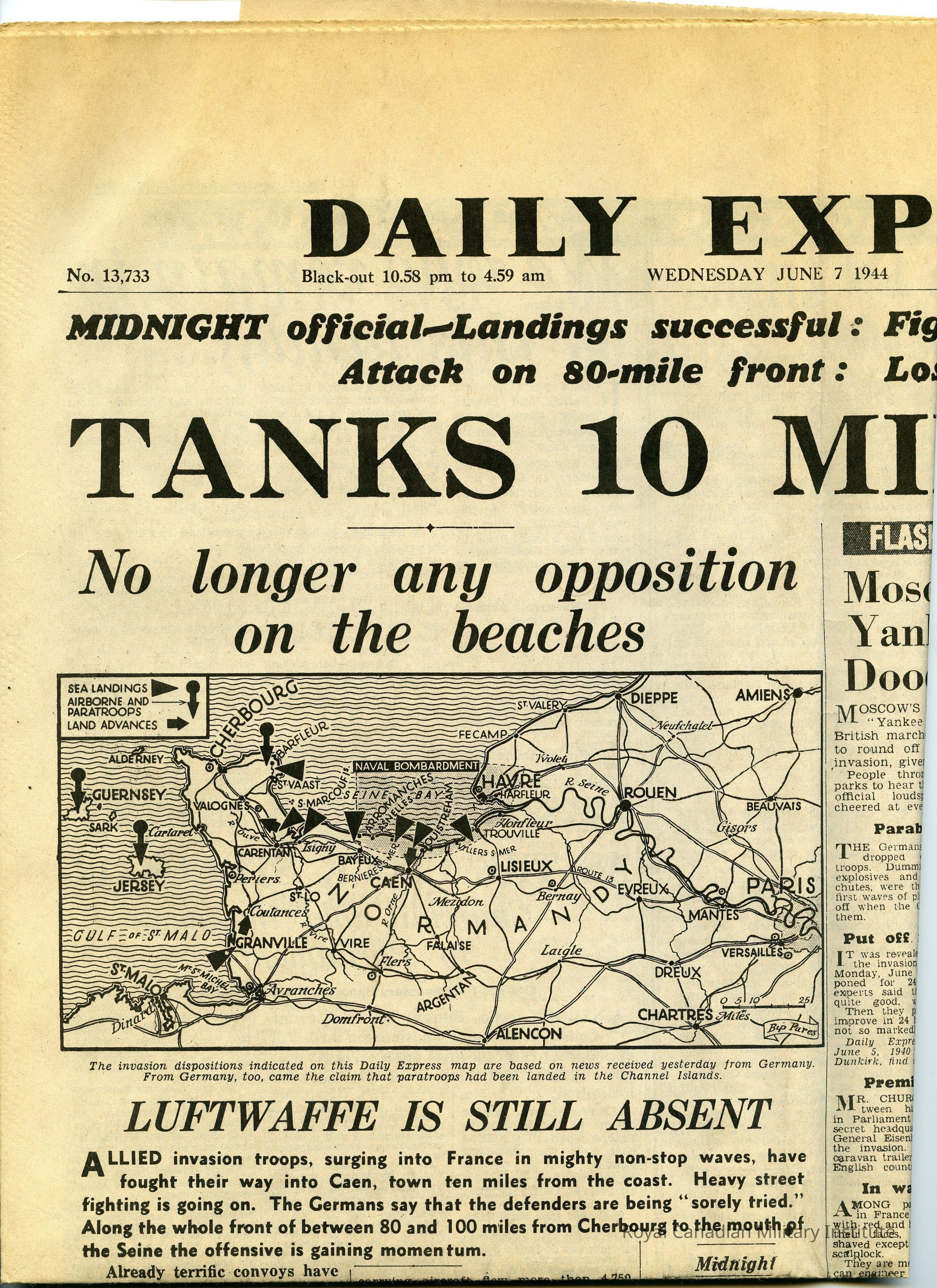 1944 British civilian Daily Express Newspaper describing initial stages of the Normandy Campaign from June 7, 1944. Major headlines include: : "MIDNIGHT Official-Landings Successful: Fighting in Caen: / Attack on 80-Mile Front: Losses Light / TANKS 10 MILES IN / No longer any opposition / on the beaches / LUFTWAFFE IS STILL ABSENT."Made/Created