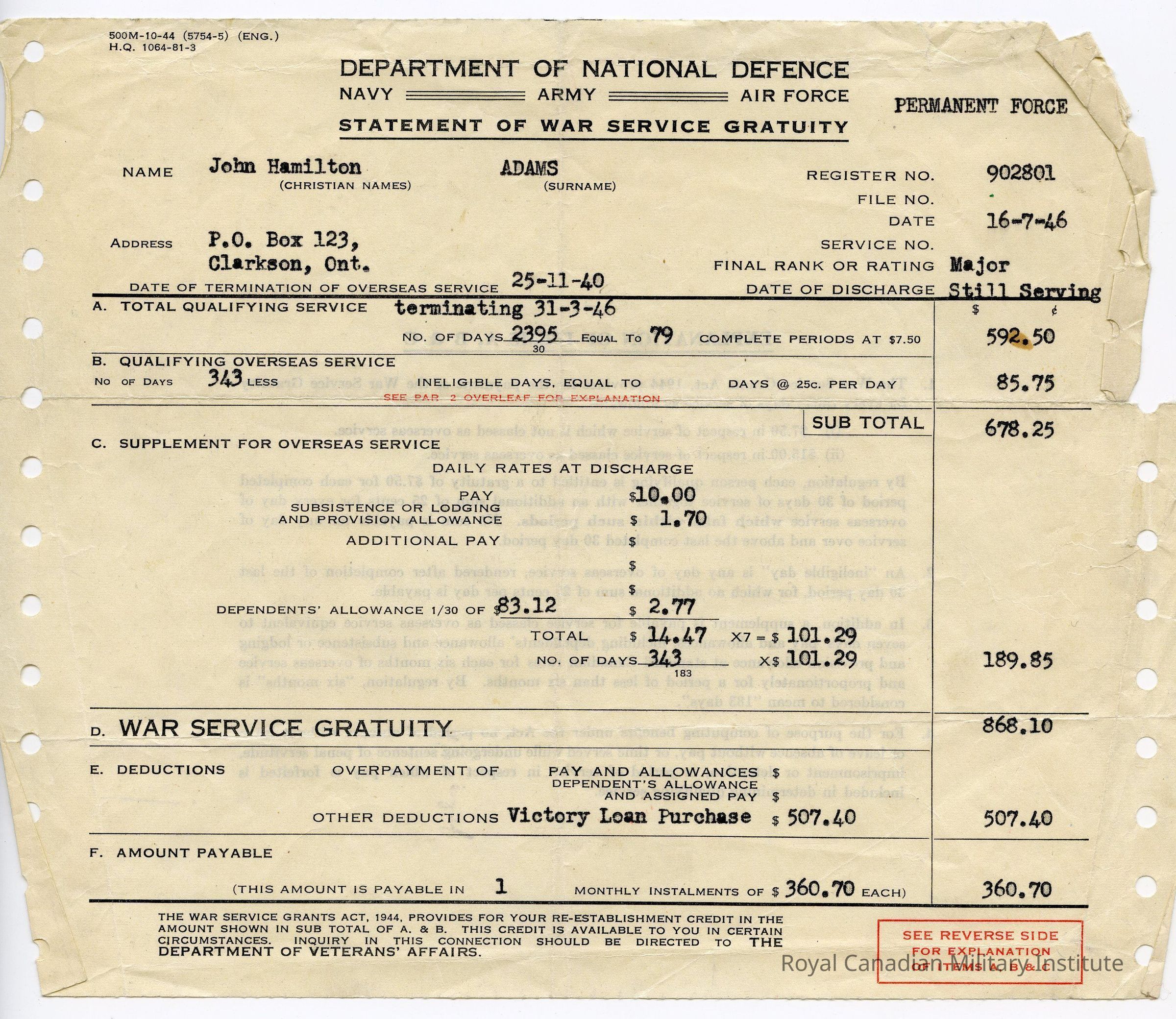 1946 Department of National Defence War Service Gratuity statement. The statement was issued to John Hamilton Adams on July 16, 1946. It details his eligibility for $868.10 in War Service Gratuity, minus his purchase of Victory Loans ($507.40).