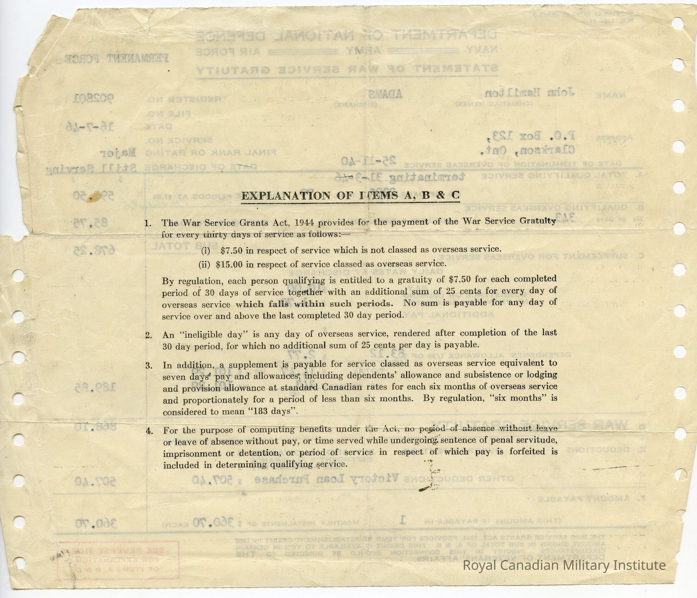 1946 Department of National Defence War Service Gratuity statement.Entry/Object ID