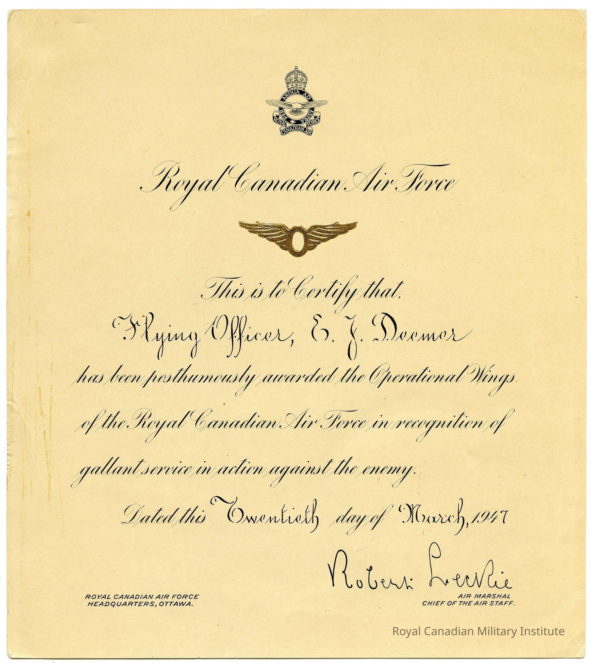 Transcript: "Royal Canadian Air Force. This is to certify that Flying Officer, E.F. Deemer has been posthumously awarded the Operational Wings of the Royal Canadian Air Force in recognition of gallant service in action against the enemy."