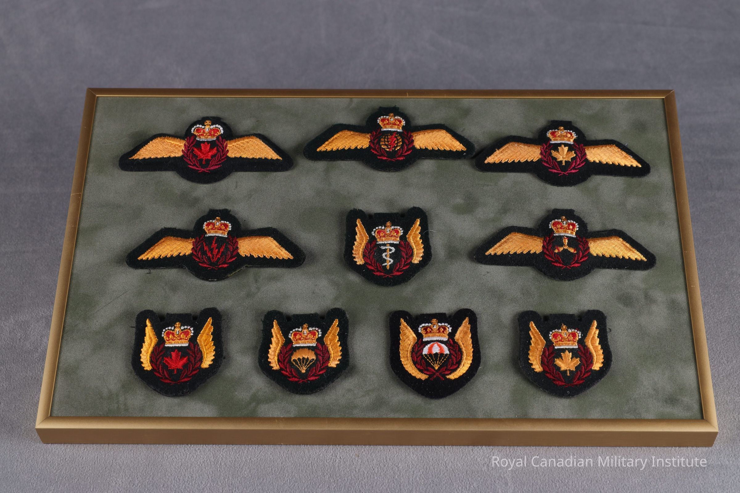1968-1970 Canadian Forces Navigator's wing qualification badge. Yellow/red/white cotton thread Queen's crown atop yellow globe-red spark-burgundy wreath in cotton thread. Double yellow cotton thread feathered wings. All on dark green wool base. Padded. Black fabric backing.Made/Created