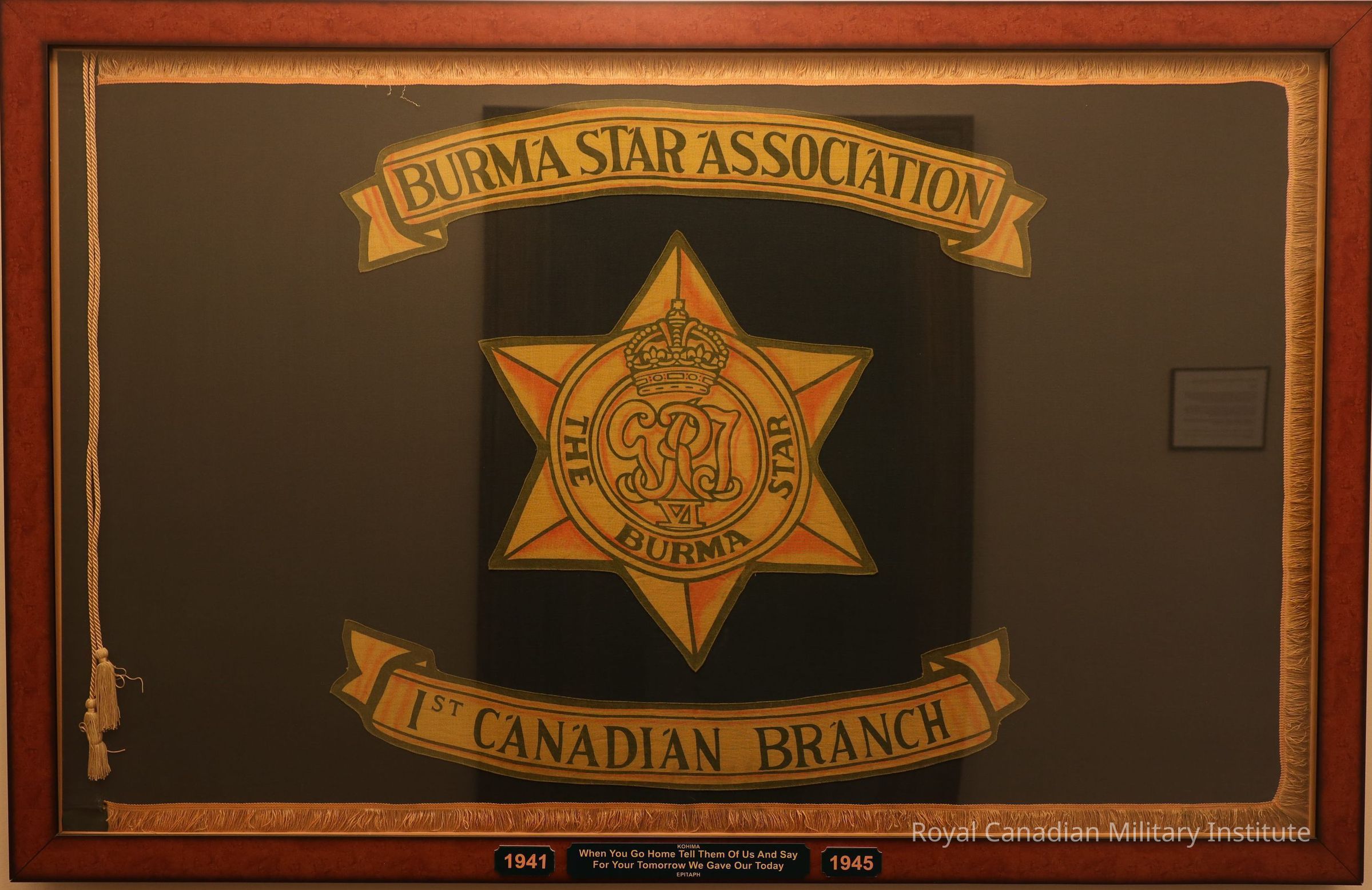 1976-2012 Burma Star Association (1st Canadian Branch) flag. Rectangular, dark green linen. Khaki/green/yellow linen scroll title stitched to flag body "Burma Star Association" Also khaki/green linen scroll title "1st Canadian Branch" Central emblem is bronze/yellow linen "Burma Star" medal (six-pointed star with King's crown above Royal cypher GR VI and circular title "The Burma Star") Flag border has stitched to it a 2.5 cm. wide yellow polyester (?) fringe.Made/Created