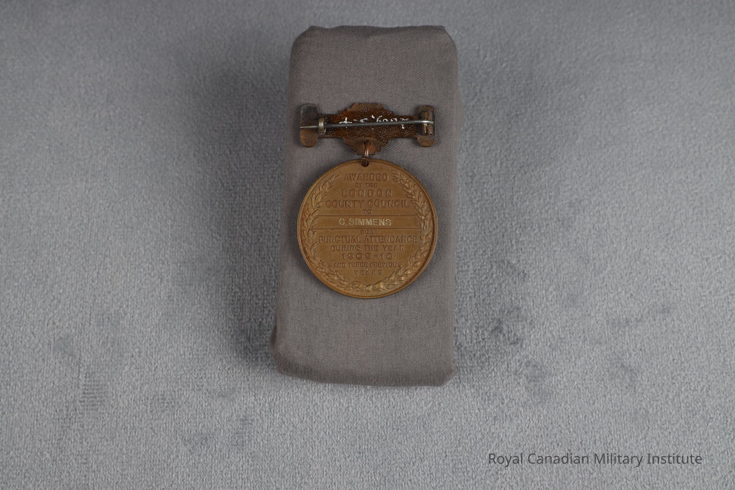 1909-1910 London County Council King Edward VII Medal. Circular, copper-brass. Obverse crowned bust King Edward VII with title "King Edward VII Medal" Reverse a laurel wreath with title "Awarded By The London County Council To C. Simmens For Punctual Attendance During The Year 1909-10 And Three Previous Years." Suspension of rectangular pin-backed brass bar with wreathed year "1910" in centre. Bar is 1.2 x 3.7 cm.Made/Created