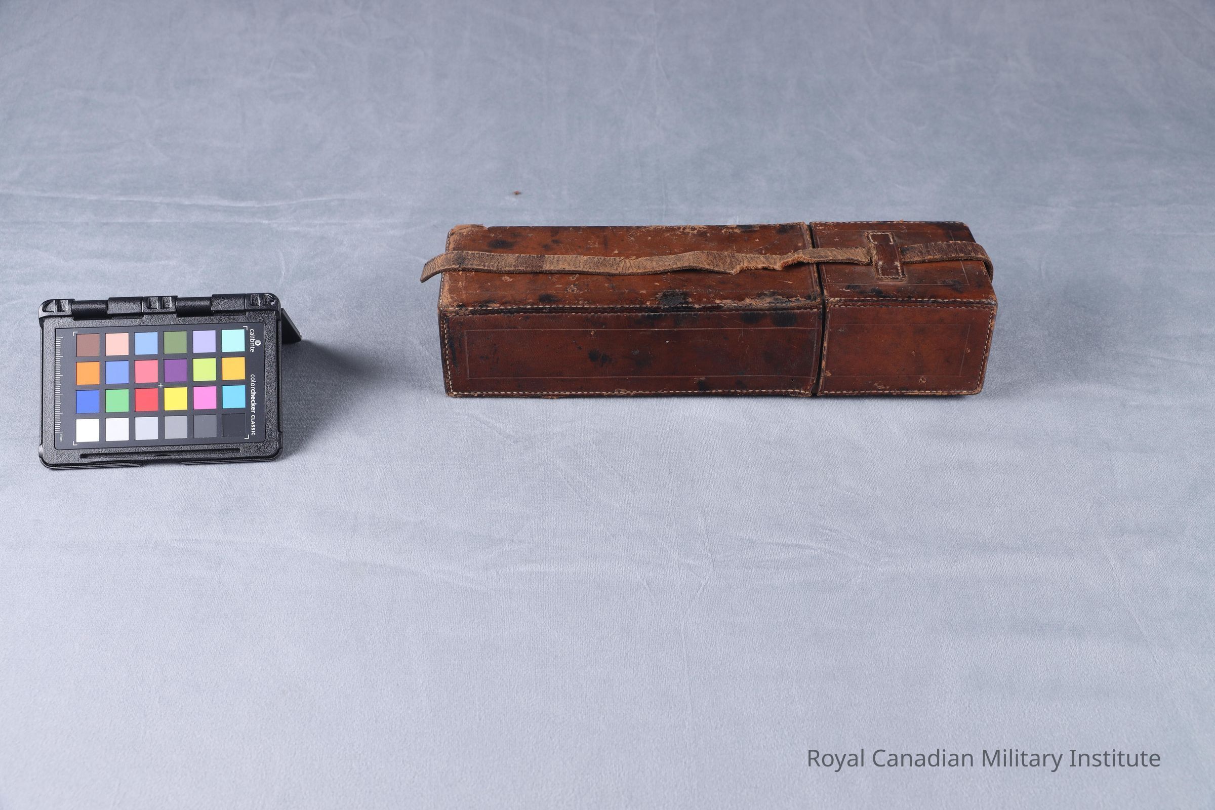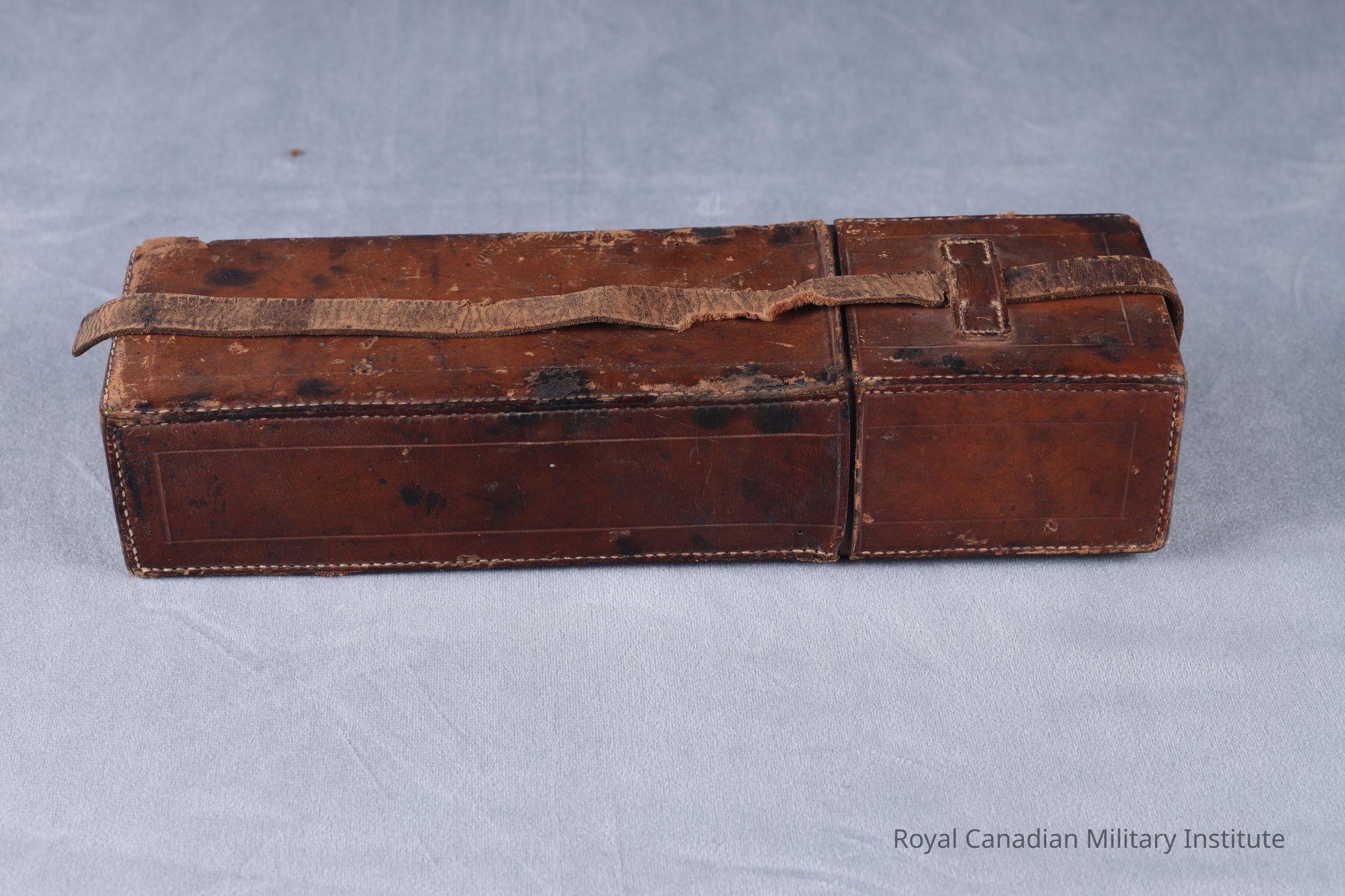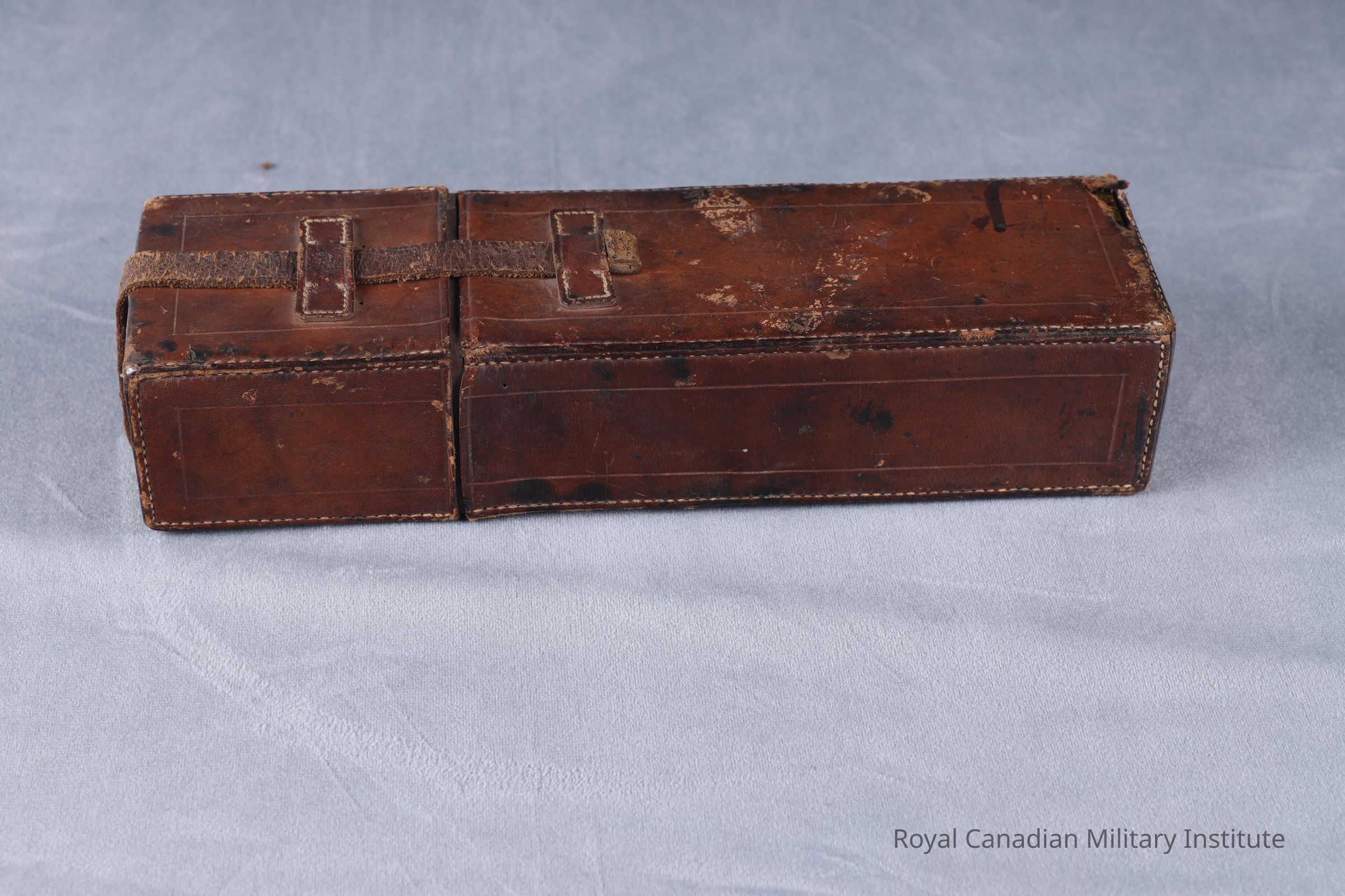 1899-1902 British Army officer's map case. Rectangular tinned steel, with top lid. Covered with brown leather, stitched at seams. Three leather loops front and back hold a brown leather carrying strap 54 cms. long.Made/Created