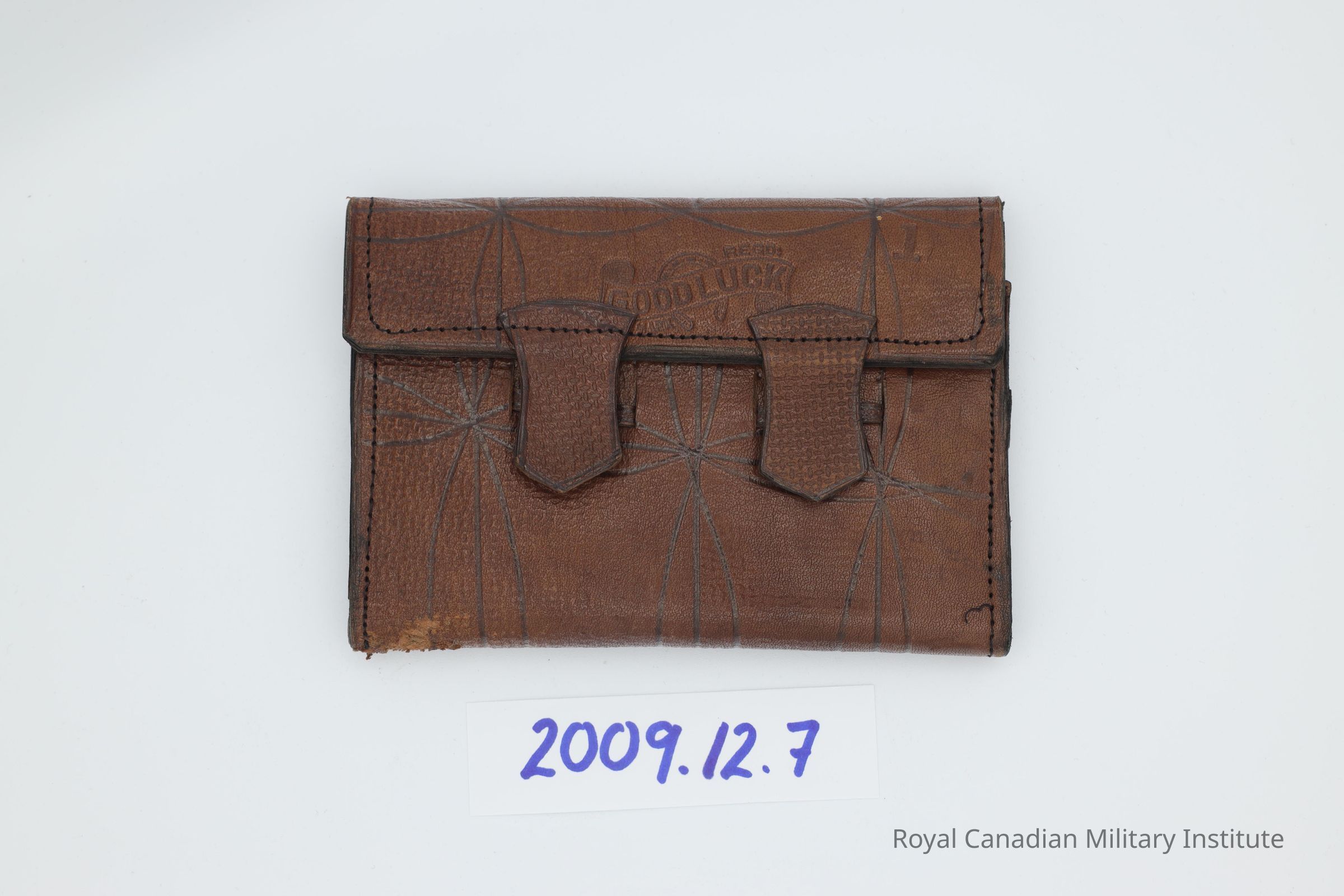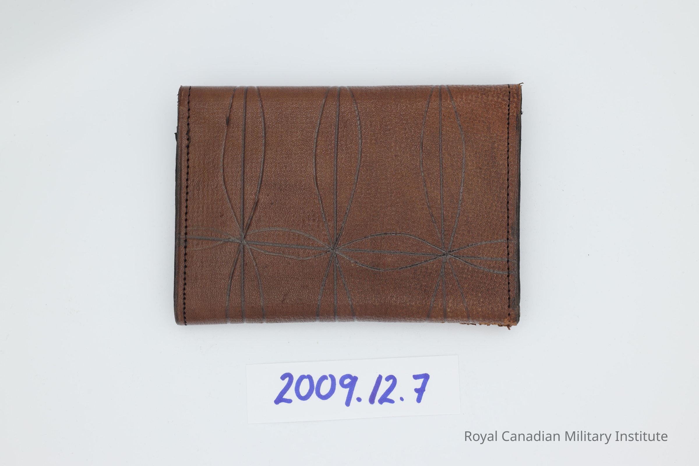 1940s Canadian civilian/military wallet. Rectangular, brown leather. Stippled surface with "flared cross" black tooling. Two stitched locking tabs and loops on one side. Fifteen piece stitched construction: body, flap compartments, middle compartment. Two celluloid windows in interior.Made/Created